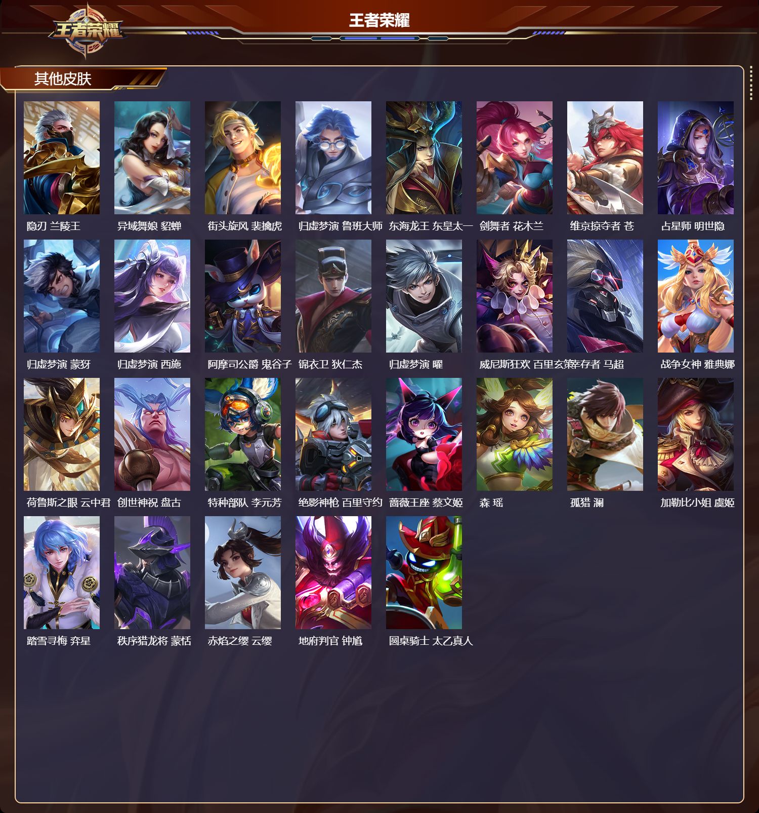 【45,其他皮肤】,金属狂潮,高渐离,前尘,金蝉,三太子,哪吒,极冰防御线,盾山,第七人偶,干将莫邪,万圣前夜,小乔,灼热之刃,李信,海之征途,孙策,帝国元帅,项羽,精灵王,后羿,冰刃幻境,镜,碧珀绯影,暃,星航指挥官,诸葛亮,魇语军师,司马懿,午夜歌剧院,元歌,启蛰,司空震,隐刃,兰陵王,异域舞娘,貂蝉,街头旋风,裴擒虎,归虚梦演,鲁班大师,东海龙王,东皇太一,剑舞者,花木兰,维京掠夺者,苍,占星师,明世隐,归虚梦演,蒙犽,归虚梦演,西施,阿摩司公爵,鬼谷子,锦衣卫,狄仁杰,归虚梦演,曜,威尼斯狂欢,百里玄策,幸存者,马超,战争女神,雅典娜,荷鲁斯之眼,云中君,创世神祝,盘古,特种部队,李元芳,绝影神枪,百里守约,蔷薇王座,蔡文姬,森,瑶,孤猎,澜,加勒比小姐,虞姬,踏雪寻梅,弈星,秩序猎龙将,蒙恬,赤焰之缨,云缨,地府判官,钟馗,圆桌骑士,太乙真人,