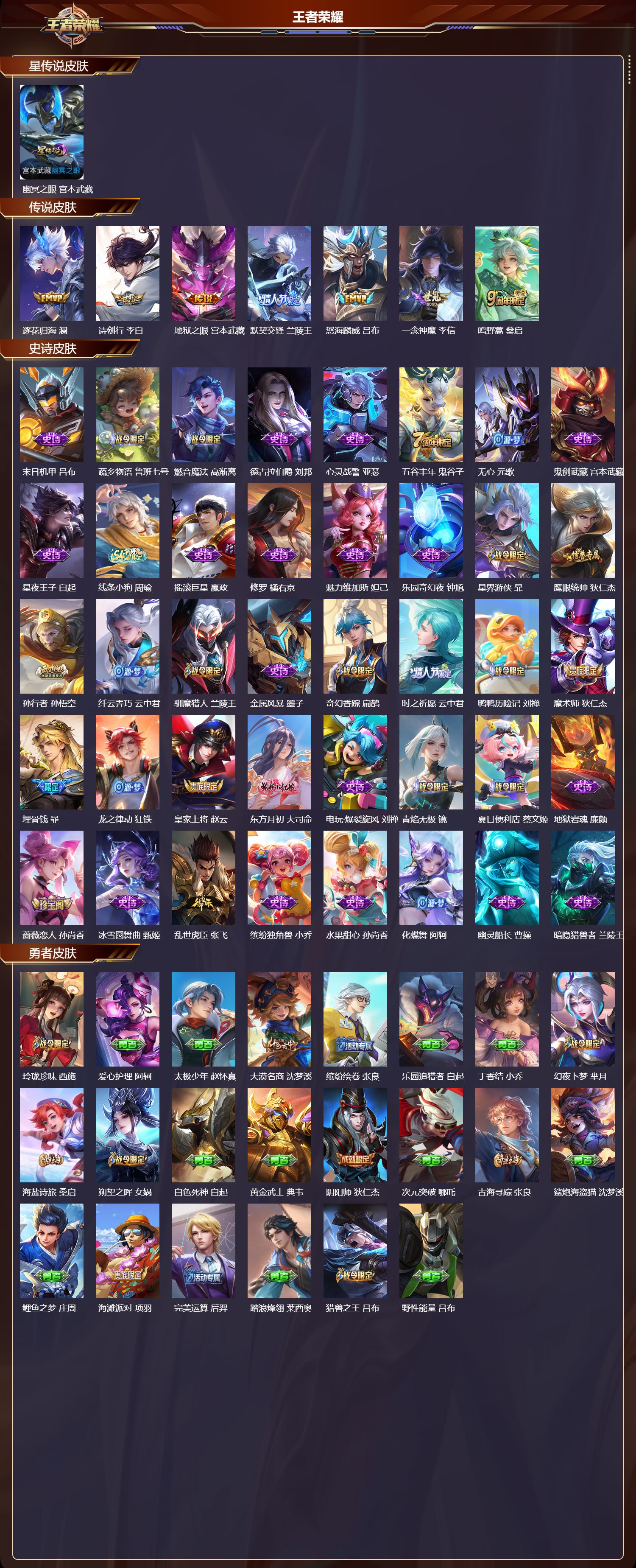 【40,史诗皮肤】,末日机甲,吕布,蔬乡物语,鲁班七号,燃音魔法,高渐离,德古拉伯爵,刘邦,心灵战警,亚瑟,五谷丰年,鬼谷子,无心,元歌,鬼剑武藏,宫本武藏,星夜王子,白起,线条小狗,周瑜,摇滚巨星,嬴政,修罗,橘右京,魅力维加斯,妲己,乐园奇幻夜,钟馗,星界游侠,暃,鹰眼统帅,狄仁杰,孙行者,孙悟空,纤云弄巧,云中君,驯魔猎人,兰陵王,金属风暴,墨子,奇幻香踪,扁鹊,时之祈愿,云中君,鸭鸭历险记,刘禅,魔术师,狄仁杰,埋骨钱,暃,龙之律动,狂铁,皇家上将,赵云,东方月初,大司命,电玩·爆裂旋风,刘禅,青焰无极,镜,夏日便利店,蔡文姬,地狱岩魂,廉颇,蔷薇恋人,孙尚香,冰雪圆舞曲,甄姬,乱世虎臣,张飞,缤纷独角兽,小乔,水果甜心,孙尚香,化蝶舞,阿轲,幽灵船长,曹操,暗隐猎兽者,兰陵王,