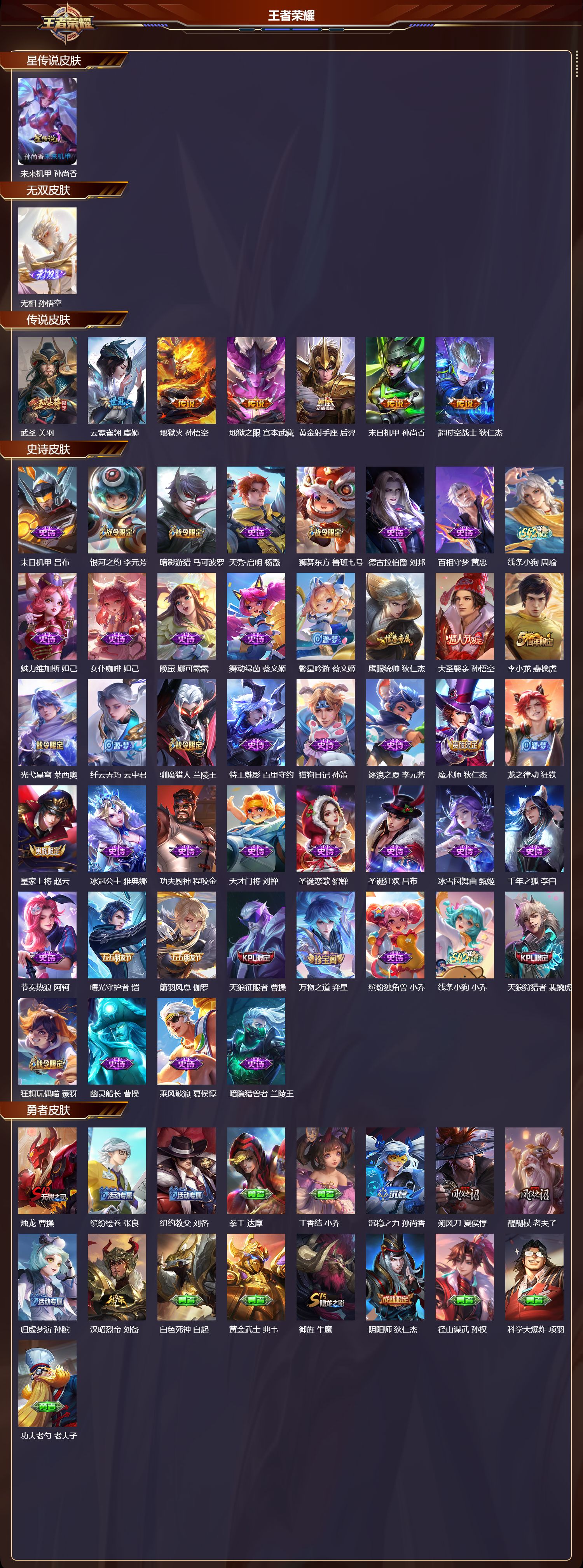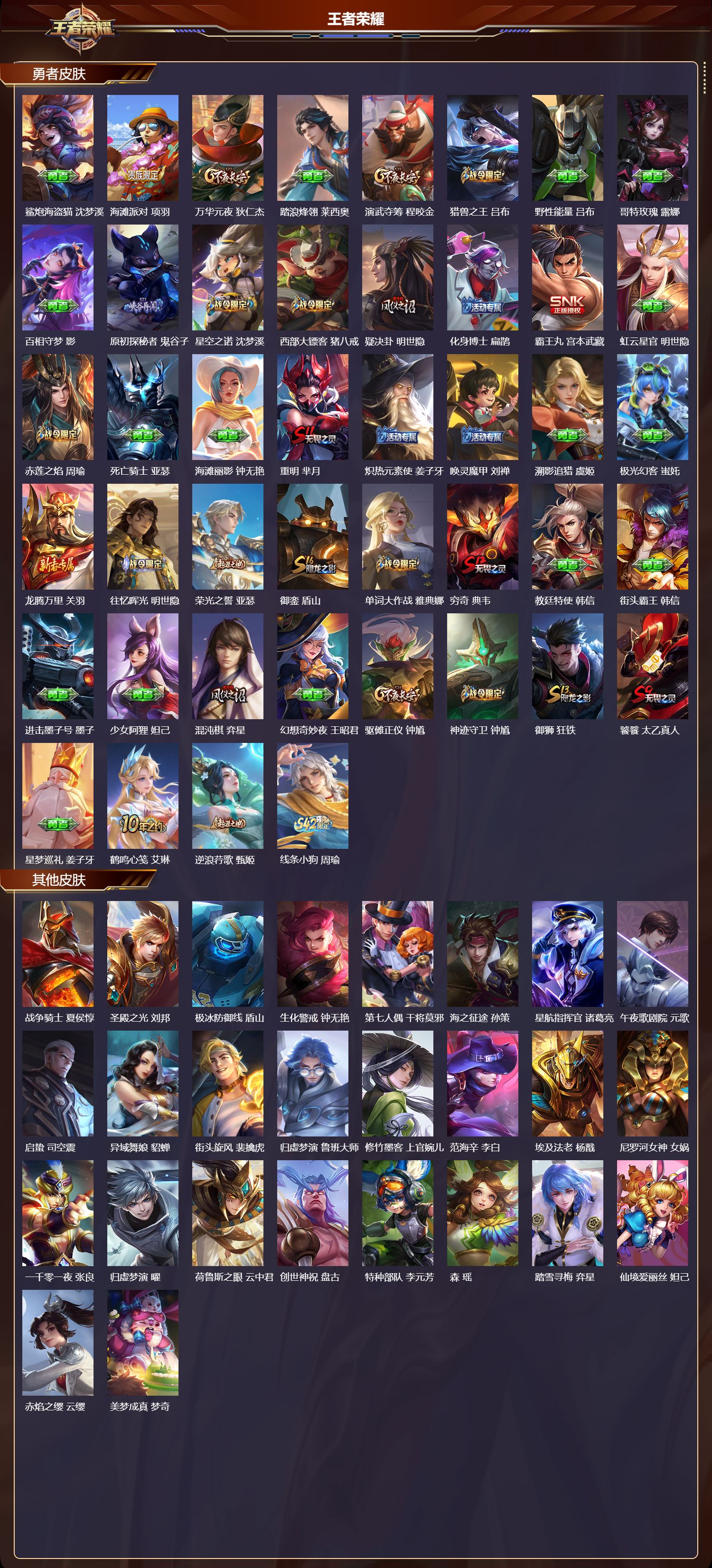 【61,勇者皮肤】,烛龙,曹操,缤纷绘卷,张良,纽约教父,刘备,拳王,达摩,丁香结,小乔,沉稳之力,孙尚香,朔风刀,夏侯惇,醍醐杖,老夫子,归虚梦演,孙膑,汉昭烈帝,刘备,白色死神,白起,黄金武士,典韦,御旌,牛魔,阴阳师,狄仁杰,径山谋武,孙权,科学大爆炸,项羽,功夫老勺,老夫子,鲨炮海盗猫,沈梦溪,海滩派对,项羽,万华元夜,狄仁杰,踏浪烽翎,莱西奥,演武夺筹,程咬金,猎兽之王,吕布,野性能量,吕布,哥特玫瑰,露娜,百相守梦,影,原初探秘者,鬼谷子,星空之诺,沈梦溪,西部大镖客,猪八戒,疑决卦,明世隐,化身博士,扁鹊,霸王丸,宫本武藏,虹云星官,明世隐,赤莲之焰,周瑜,死亡骑士,亚瑟,海滩丽影,钟无艳,重明,芈月,炽热元素使,姜子牙,唤灵魔甲,刘禅,溯影追猎,虞姬,极光幻客,蚩奼,龙腾万里,关羽,往忆晖光,明世隐,荣光之誓,亚瑟,御銮,盾山,单词大作战,雅典娜,穷奇,典韦,教廷特使,韩信,街头霸王,韩信,进击墨子号,墨子,少女阿狸,妲己,混沌棋,弈星,幻想奇妙夜,王昭君,驱傩正仪,钟馗,神迹守卫,钟馗,御狮,狂铁,饕餮,太乙真人,星梦巡礼,姜子牙,鹤鸣心笺,艾琳,逆浪荇歌,甄姬,线条小狗,周瑜,