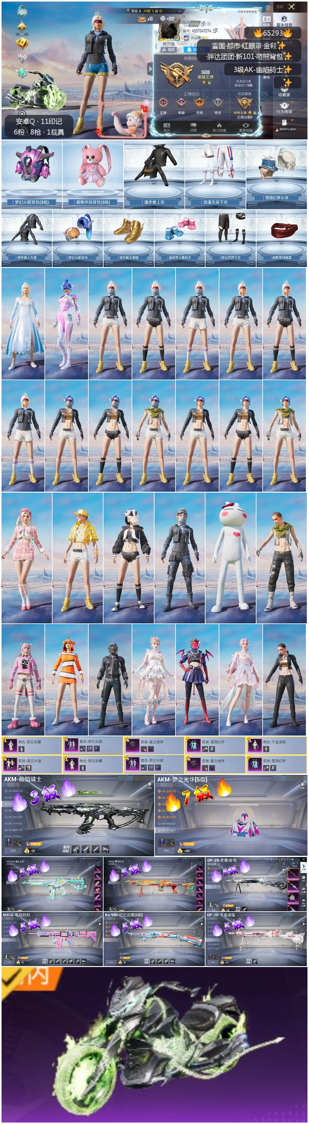 【8特效枪】AKM-幽焰骑士/3级,DP-28-豹影疾电/5级,AKM-梦之光华/7级,Mk14-福马献瑞/5级,M416-电玩时刻/5级,AA12-G-萌骑幻想/5级,Kar98K-巳巳如意/5级,DP-28-千金淑猫/5级