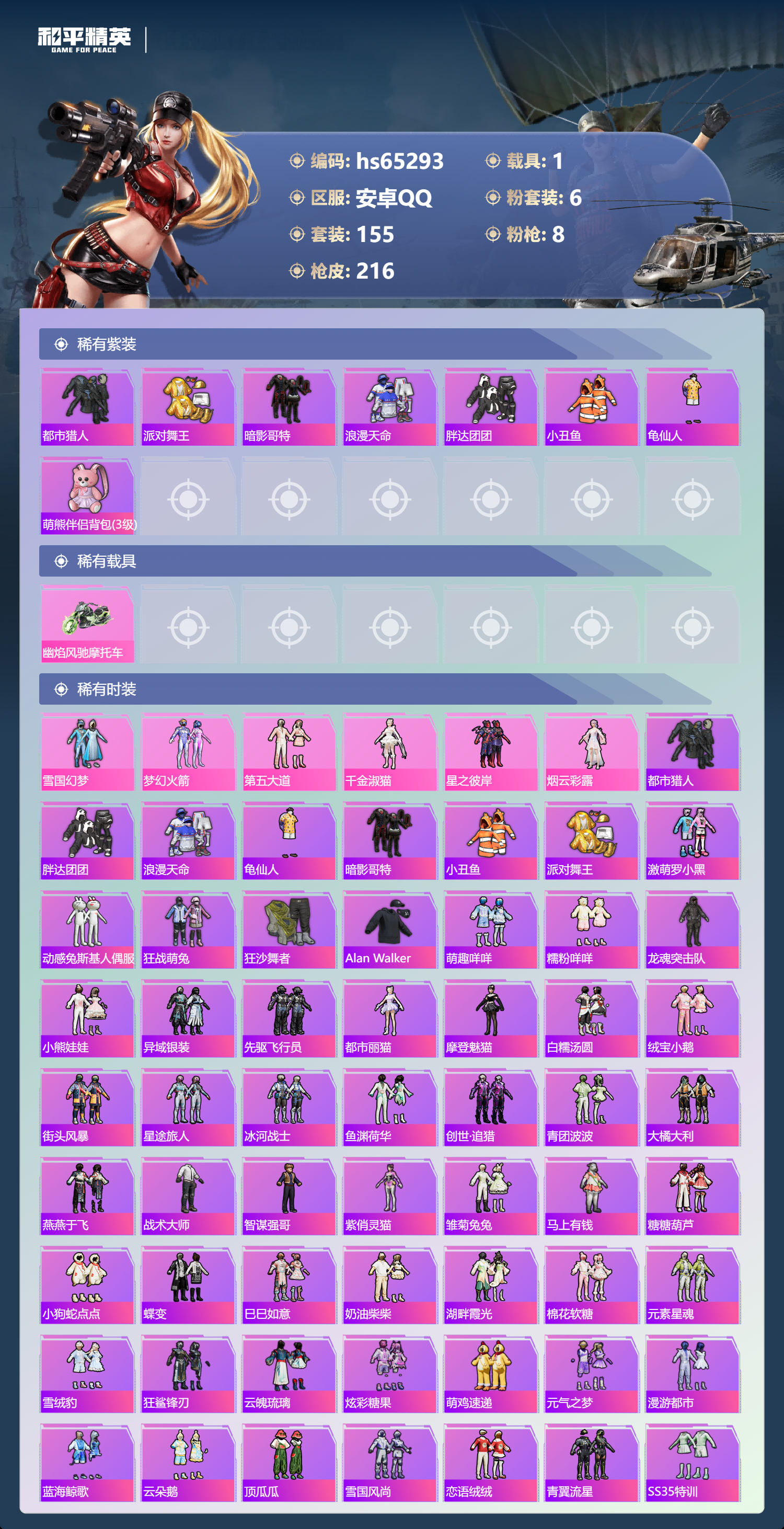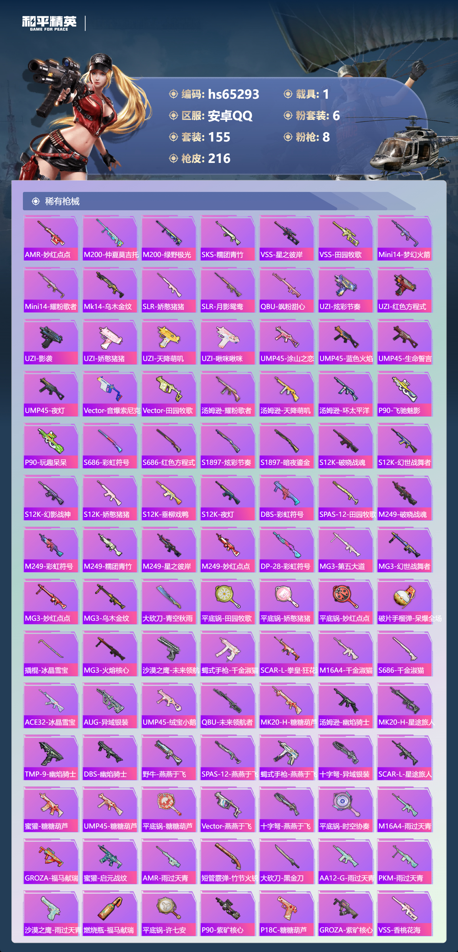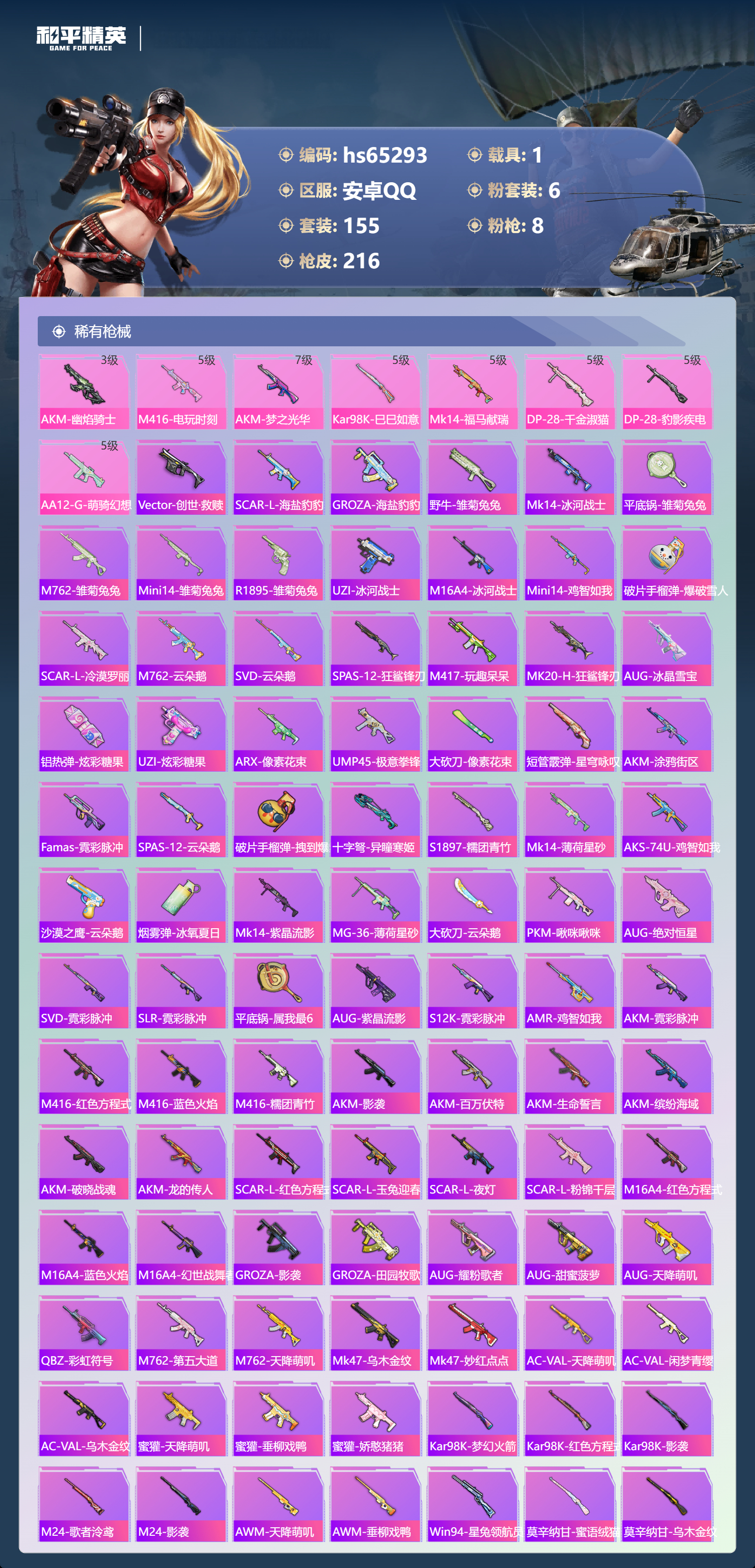 PX_2550097-,安卓手Q-11王牌印记-6粉装-8特效枪-1载具-64209热力值-155套装-216枪皮-3卓越印记-1传奇印记