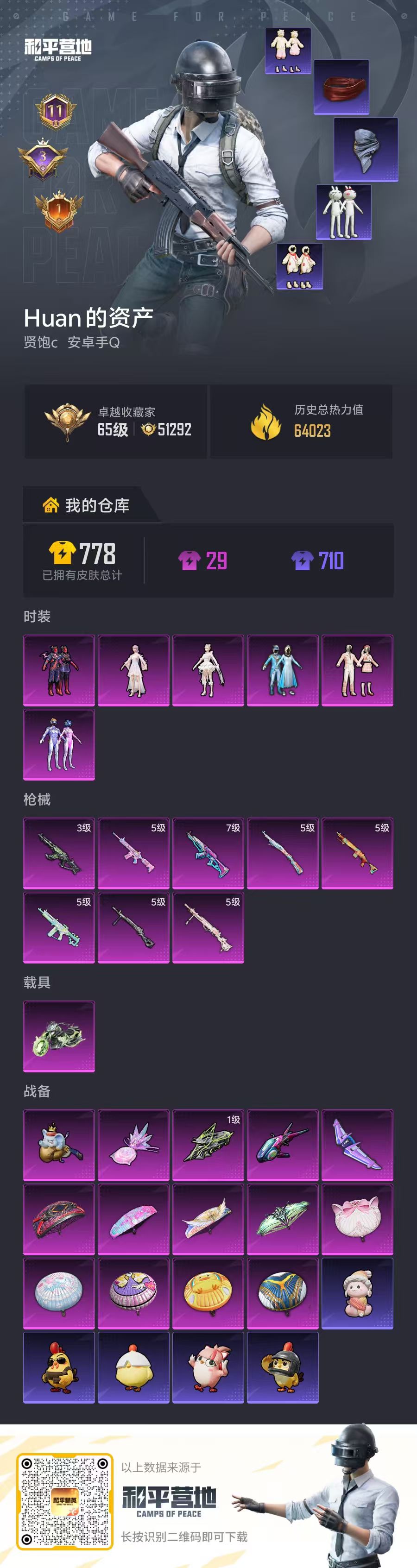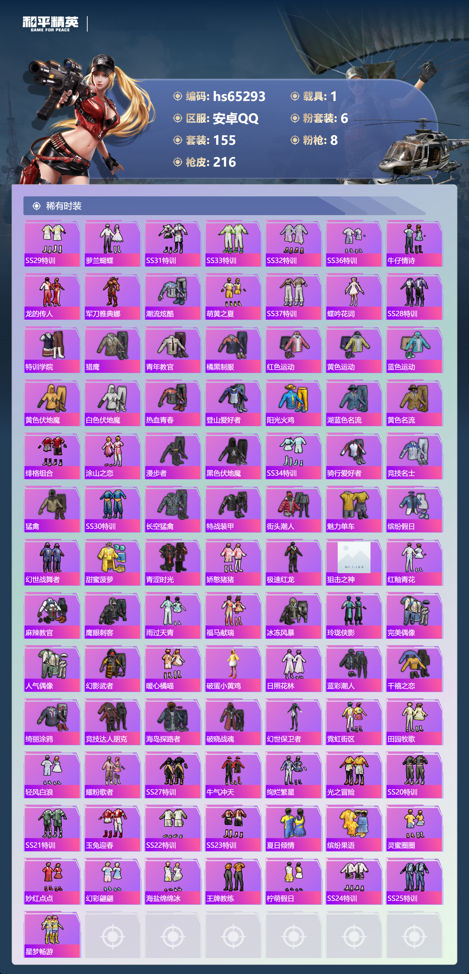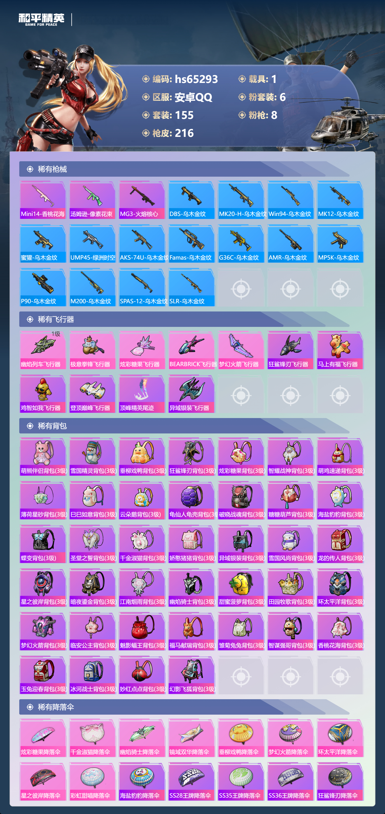 PX_2550097-,安卓手Q-11王牌印记-6粉装-8特效枪-1载具-64209热力值-155套装-216枪皮-3卓越印记-1传奇印记