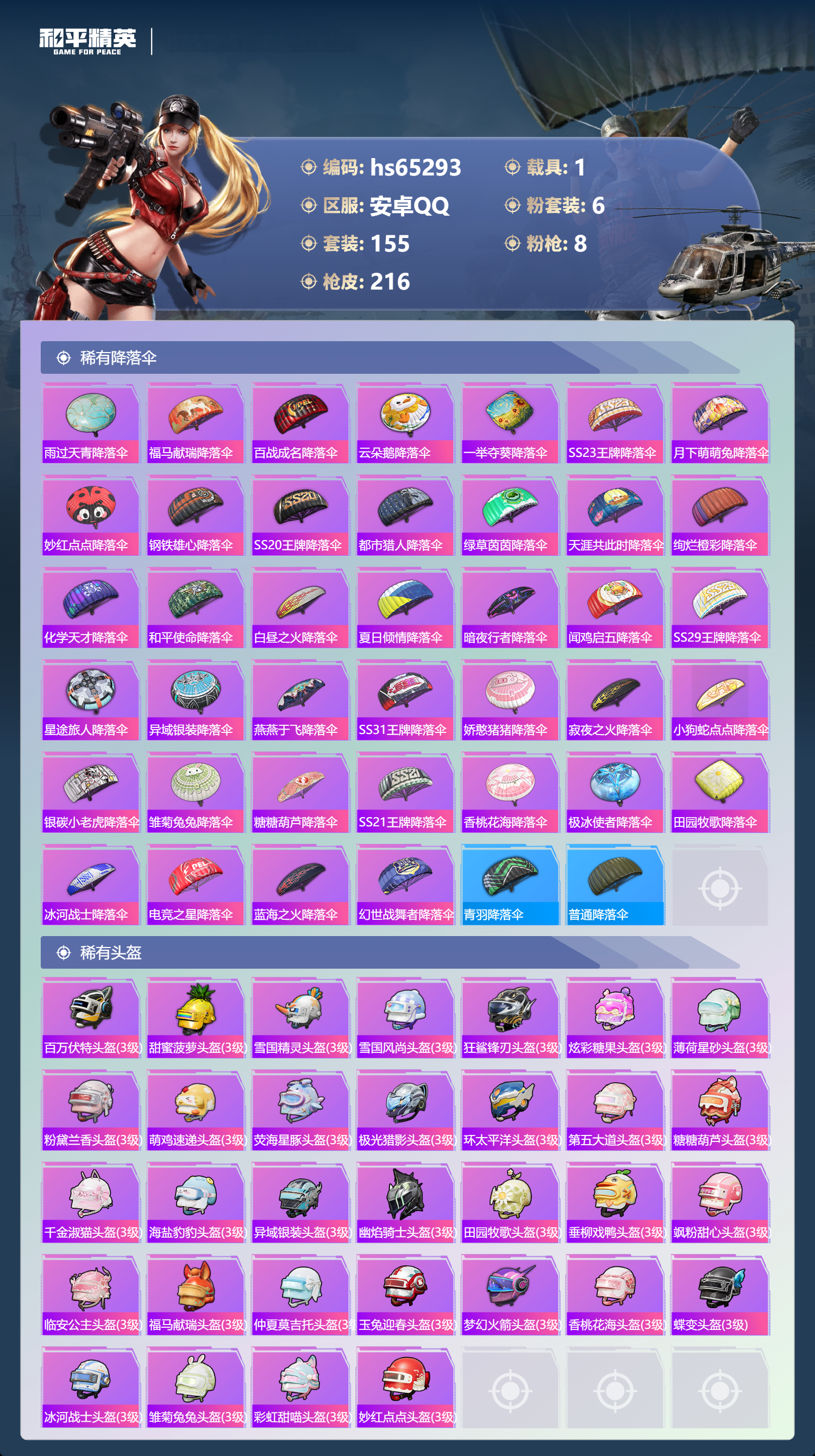 【55稀有降落伞】海盐豹豹降落伞,SS28王牌降落伞,SS35王牌降落伞,SS36王牌降落伞,炫彩糖果降落伞,狂鲨锋刃降落伞,雨过天青降落伞,福马献瑞降落伞,百战成名降落伞,云朵鹅降落伞,一举夺葵降落伞,SS23王牌降落伞,月下萌萌兔降落伞,妙红点点降落伞,钢铁雄心降落伞,SS20王牌降落伞,都市猎人降落伞,绿草茵茵降落伞,青羽降落伞,天涯共此时降落伞,绚烂橙彩降落伞,普通降落伞,千金淑猫降落伞,化学天才降落伞,和平使命降落伞,白昼之火降落伞,夏日倾情降落伞,暗夜行者降落伞,幽焰骑士降落伞,镜域双华降落伞,闻鸡启五降落伞,SS29王牌降落伞,星途旅人降落伞,异域银装降落伞,燕燕于飞降落伞,SS31王牌降落伞,娇憨猪猪降落伞,寂夜之火降落伞,小狗蛇点点降落伞,银碳小老虎降落伞,垂柳戏鸭降落伞,雏菊兔兔降落伞,糖糖葫芦降落伞,SS21王牌降落伞,香桃花海降落伞,极冰使者降落伞,梦幻火箭降落伞,环太平洋降落伞,田园牧歌降落伞,冰河战士降落伞,星之彼岸降落伞,彩虹甜喵降落伞,电竞之星降落伞,蓝海之火降落伞,幻世战舞者降落伞