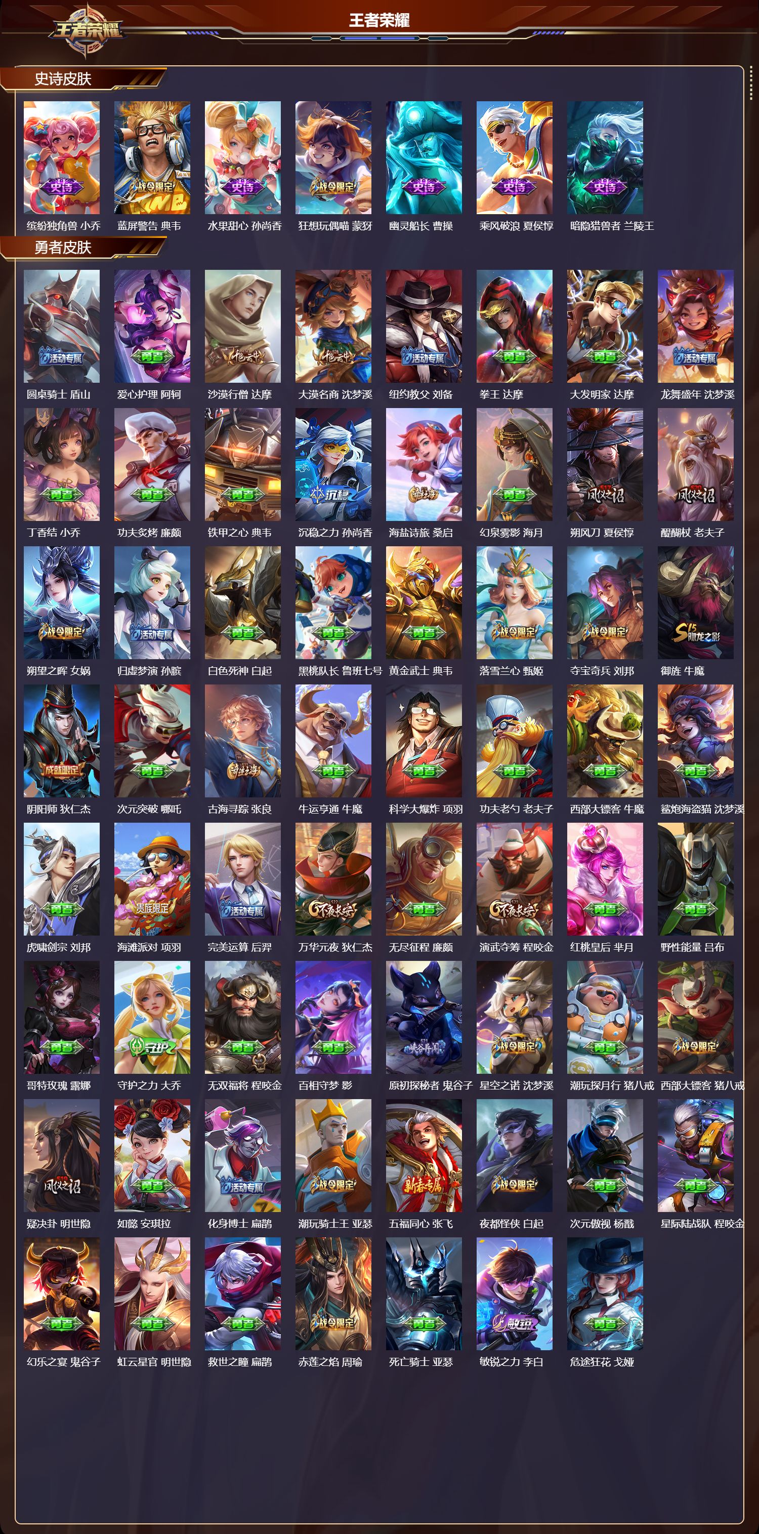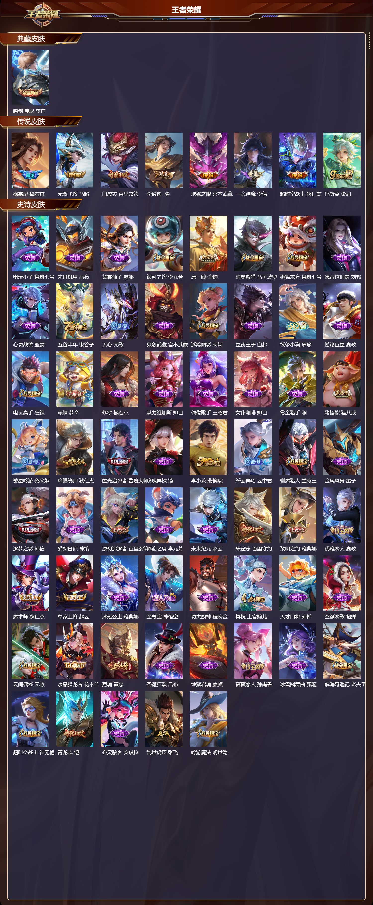 【68,史诗皮肤】电玩小子,鲁班七号,末日机甲,吕布,紫霞仙子,露娜,银河之约,李元芳,唐三藏,金蝉,暗影游猎,马可波罗,狮舞东方,鲁班七号,德古拉伯爵,刘邦,心灵战警,亚瑟,五谷丰年,鬼谷子,无心,元歌,鬼剑武藏,宫本武藏,迷踪丽影,阿轲,星夜王子,白起,线条小狗,周瑜,摇滚巨星,嬴政,电玩高手,狂铁,顽趣,梦奇,修罗,橘右京,魅力维加斯,妲己,偶像歌手,王昭君,女仆咖啡,妲己,赏金猎手,澜,猪悟能,猪八戒,繁星吟游,蔡文姬,鹰眼统帅,狄仁杰,匿光启智者,鲁班大师,玫瑰异探,镜,李小龙,裴擒虎,纤云弄巧,云中君,驯魔猎人,兰陵王,金属风暴,墨子,逐梦之影,韩信,猫狗日记,孙策,原初追逐者,百里玄策,逐浪之夏,李元芳,未来纪元,赵云,朱雀志,百里守约,黎明之约,雅典娜,优雅恋人,嬴政,魔术师,狄仁杰,皇家上将,赵云,冰冠公主,雅典娜,至尊宝,孙悟空,功夫厨神,程咬金,梁祝,上官婉儿,天才门将,刘禅,圣诞恋歌,貂蝉,云间偶戏,元歌,水晶猎龙者,花木兰,烈魂,黄忠,圣诞狂欢,吕布,地狱岩魂,廉颇,蔷薇恋人,孙尚香,冰雪圆舞曲,甄姬,航海奇遇记,老夫子,超时空战士,钟无艳,青龙志,铠,心灵骇客,安琪拉,乱世虎臣,张飞,吟游魔法,明世隐,缤纷独角兽,小乔,蓝屏警告,典韦,水果甜心,孙尚香,狂想玩偶喵,蒙犽,幽灵船长,曹操,乘风破浪,夏侯惇,暗隐猎兽者,兰陵王,
