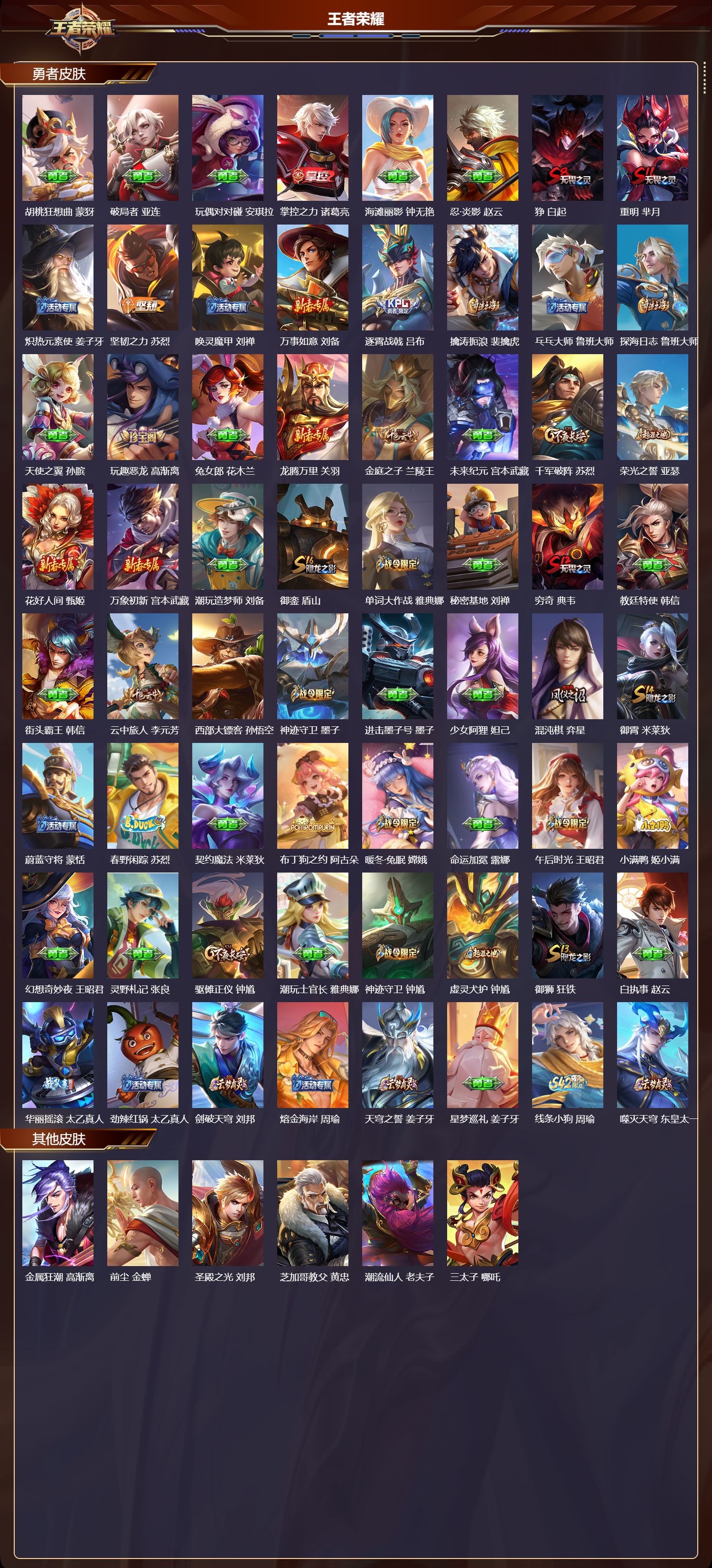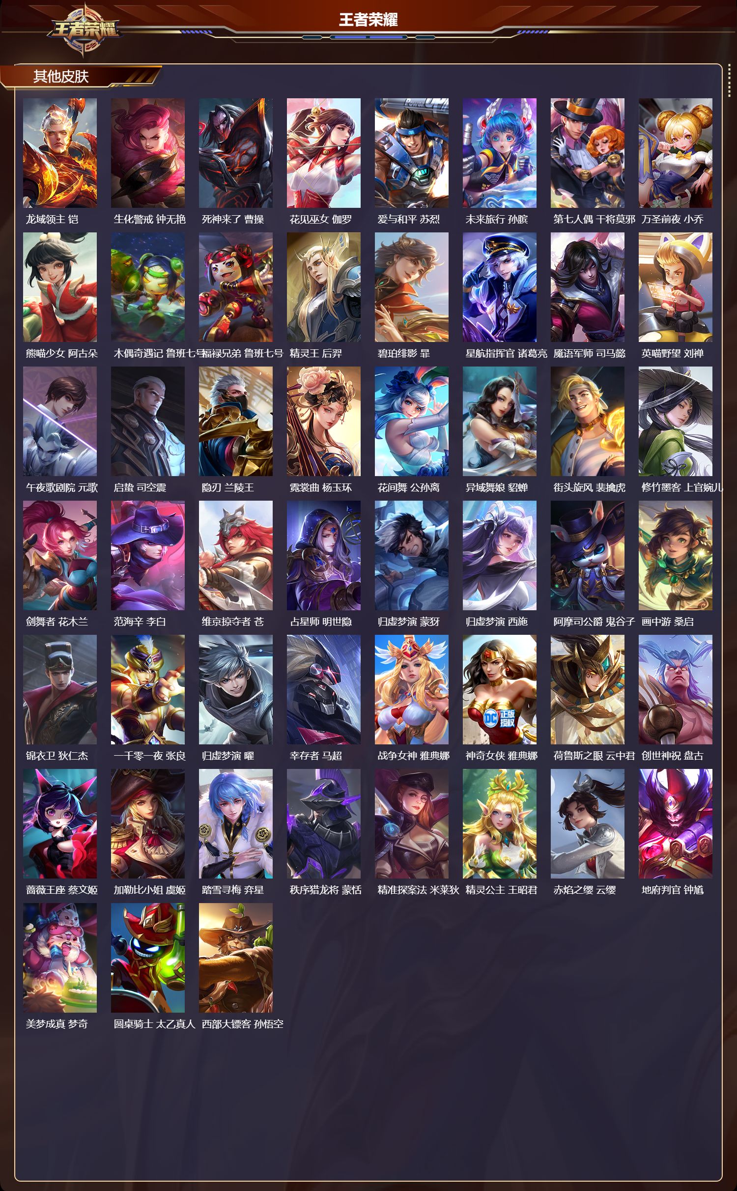 【57,其他皮肤】金属狂潮,高渐离,前尘,金蝉,圣殿之光,刘邦,芝加哥教父,黄忠,潮流仙人,老夫子,三太子,哪吒,龙域领主,铠,生化警戒,钟无艳,死神来了,曹操,花见巫女,伽罗,爱与和平,苏烈,未来旅行,孙膑,第七人偶,干将莫邪,万圣前夜,小乔,熊喵少女,阿古朵,木偶奇遇记,鲁班七号,福禄兄弟,鲁班七号,精灵王,后羿,碧珀绯影,暃,星航指挥官,诸葛亮,魇语军师,司马懿,英喵野望,刘禅,午夜歌剧院,元歌,启蛰,司空震,隐刃,兰陵王,霓裳曲,杨玉环,花间舞,公孙离,异域舞娘,貂蝉,街头旋风,裴擒虎,修竹墨客,上官婉儿,剑舞者,花木兰,范海辛,李白,维京掠夺者,苍,占星师,明世隐,归虚梦演,蒙犽,归虚梦演,西施,阿摩司公爵,鬼谷子,画中游,桑启,锦衣卫,狄仁杰,一千零一夜,张良,归虚梦演,曜,幸存者,马超,战争女神,雅典娜,神奇女侠,雅典娜,荷鲁斯之眼,云中君,创世神祝,盘古,蔷薇王座,蔡文姬,加勒比小姐,虞姬,踏雪寻梅,弈星,秩序猎龙将,蒙恬,精准探案法,米莱狄,精灵公主,王昭君,赤焰之缨,云缨,地府判官,钟馗,美梦成真,梦奇,圆桌骑士,太乙真人,西部大镖客,孙悟空,