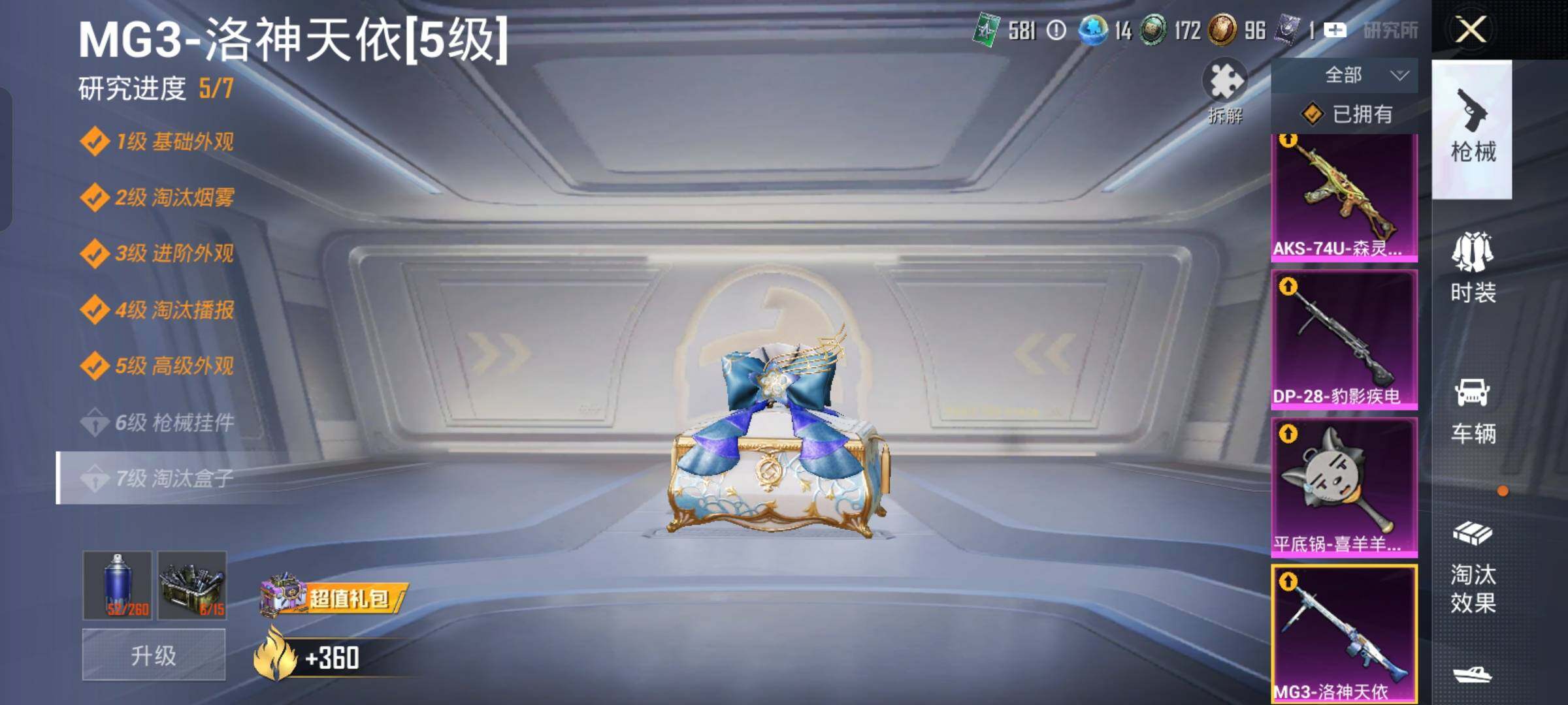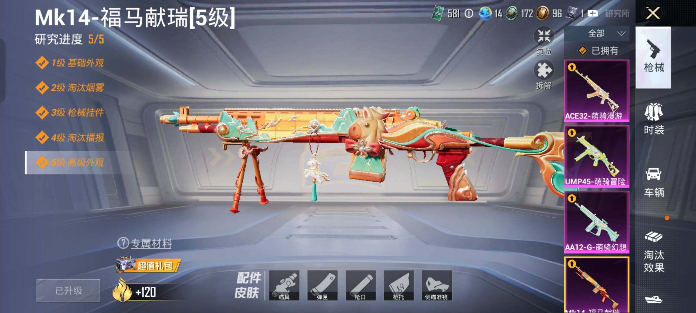 【8特效枪】,AKS-74U-森灵之息,(4级),DP-28-豹影疾电,(5级),MG3-洛神天依,(5级),Mk14-福马献瑞,(5级),AA12-G-萌骑幻想,(4级),UMP45-萌骑冒险,(2级),ACE32-萌骑漫游,(2级),平底锅-喜羊羊与灰太狼,(3级),