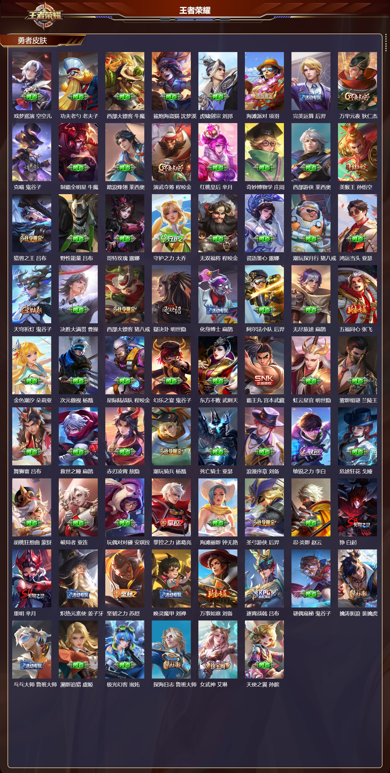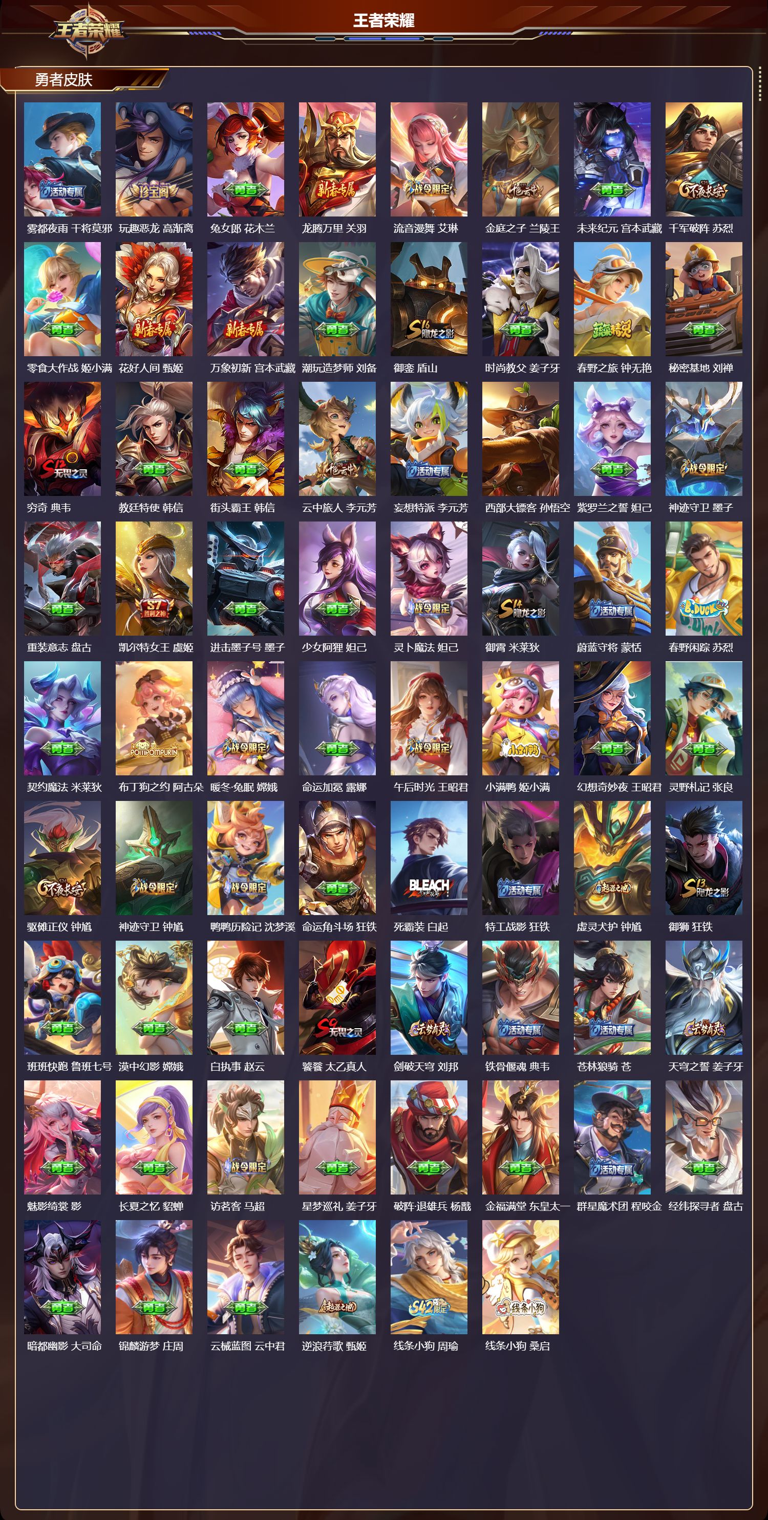 【185,勇者皮肤】时空谍影,海诺,玲珑珍味,西施,圆桌骑士,盾山,烛龙,曹操,爱心护理,阿轲,太极少年,赵怀真,星际陆战队,达摩,沙漠行僧,达摩,大漠名商,沈梦溪,暖冬絮语,程咬金,缤纷绘卷,张良,纽约教父,刘备,拳王,达摩,大发明家,达摩,龙舞盛年,沈梦溪,乐园追猎者,白起,丁香结,小乔,功夫炙烤,廉颇,铁甲之心,典韦,沉稳之力,孙尚香,幻夜卜梦,芈月,海盐诗旅,桑启,幻泉雾影,海月,朔风刀,夏侯惇,醍醐杖,老夫子,朔望之晖,女娲,归虚梦演,孙膑,汉昭烈帝,刘备,白色死神,白起,黄金武士,典韦,落雪兰心,甄姬,御旌,牛魔,阴阳师,狄仁杰,炼金王,扁鹊,径山谋武,孙权,致命风华,阿轲,次元突破,哪吒,古海寻踪,张良,牛运亨通,牛魔,戏梦巡演,空空儿,功夫老勺,老夫子,西部大镖客,牛魔,鲨炮海盗猫,沈梦溪,虎啸剑宗,刘邦,海滩派对,项羽,完美运算,后羿,万华元夜,狄仁杰,克喵,鬼谷子,制霸全明星,牛魔,踏浪烽翎,莱西奥,演武夺筹,程咬金,红桃皇后,芈月,奇妙博物学,庄周,西部游侠,莱西奥,美猴王,孙悟空,猎兽之王,吕布,野性能量,吕布,哥特玫瑰,露娜,守护之力,大乔,无双福将,程咬金,瓷语鉴心,露娜,潮玩探月行,猪八戒,鸿运当头,亚瑟,天穹祈灯,鬼谷子,决胜大满贯,曹操,西部大镖客,猪八戒,疑决卦,明世隐,化身博士,扁鹊,阿尔法小队,后羿,无尽旅途,扁鹊,五福同心,张飞,金色潮汐,朵莉亚,次元傲视,杨戬,星际陆战队,程咬金,幻乐之宴,鬼谷子,东方不败,武则天,霸王丸,宫本武藏,虹云星官,明世隐,雾影缉谜,兰陵王,舞狮寰,吕布,救世之瞳,扁鹊,赤刃凌霄,敖隐,潮玩骑兵,杨戬,死亡骑士,亚瑟,浪漫序章,刘备,敏锐之力,李白,危途狂花,戈娅,胡桃狂想曲,蒙犽,破局者,亚连,玩偶对对碰,安琪拉,掌控之力,诸葛亮,海滩丽影,钟无艳,圣弓游侠,后羿,忍·炎影,赵云,狰,白起,重明,芈月,炽热元素使,姜子牙,坚韧之力,苏烈,唤灵魔甲,刘禅,万事如意,刘备,逐霄战戟,吕布,谜偶窥秘,鬼谷子,擒涛扼浪,裴擒虎,乓乓大师,鲁班大师,溯影追猎,虞姬,极光幻客,蚩奼,探海日志,鲁班大师,女武神,艾琳,天使之翼,孙膑,雾都夜雨,干将莫邪,玩趣恶龙,高渐离,兔女郎,花木兰,龙腾万里,关羽,流音漫舞,艾琳,金庭之子,兰陵王,未来纪元,宫本武藏,千军破阵,苏烈,零食大作战,姬小满,花好人间,甄姬,万象初新,宫本武藏,潮玩造梦师,刘备,御銮,盾山,时尚教父,姜子牙,春野之旅,钟无艳,秘密基地,刘禅,穷奇,典韦,教廷特使,韩信,街头霸王,韩信,云中旅人,李元芳,妄想特派,李元芳,西部大镖客,孙悟空,紫罗兰之誓,妲己,神迹守卫,墨子,重装意志,盘古,凯尔特女王,虞姬,进击墨子号,墨子,少女阿狸,妲己,灵卜魔法,妲己,御霄,米莱狄,蔚蓝守将,蒙恬,春野闲踪,苏烈,契约魔法,米莱狄,布丁狗之约,阿古朵,暖冬·兔眠,嫦娥,命运加冕,露娜,午后时光,王昭君,小满鸭,姬小满,幻想奇妙夜,王昭君,灵野札记,张良,驱傩正仪,钟馗,神迹守卫,钟馗,鸭鸭历险记,沈梦溪,命运角斗场,狂铁,死霸装,白起,特工战影,狂铁,虚灵犬护,钟馗,御狮,狂铁,班班快跑,鲁班七号,漠中幻影,嫦娥,白执事,赵云,饕餮,太乙真人,剑破天穹,刘邦,铁骨偃魂,典韦,苍林狼骑,苍,天穹之誓,姜子牙,魅影绮裳,影,长夏之忆,貂蝉,访茗客,马超,星梦巡礼,姜子牙,破阵·退雄兵,杨戬,金福满堂,东皇太一,群星魔术团,程咬金,经纬探寻者,盘古,暗都幽影,大司命,锦麟游梦,庄周,云械蓝图,云中君,逆浪荇歌,甄姬,线条小狗,周瑜,线条小狗,桑启,百相守梦,老夫子,噬灭天穹,东皇太一,灵卦秘语,少司缘,怪诞之夜,米莱狄,爆裂喵拳,达摩,玫蓝誓约,戈娅,