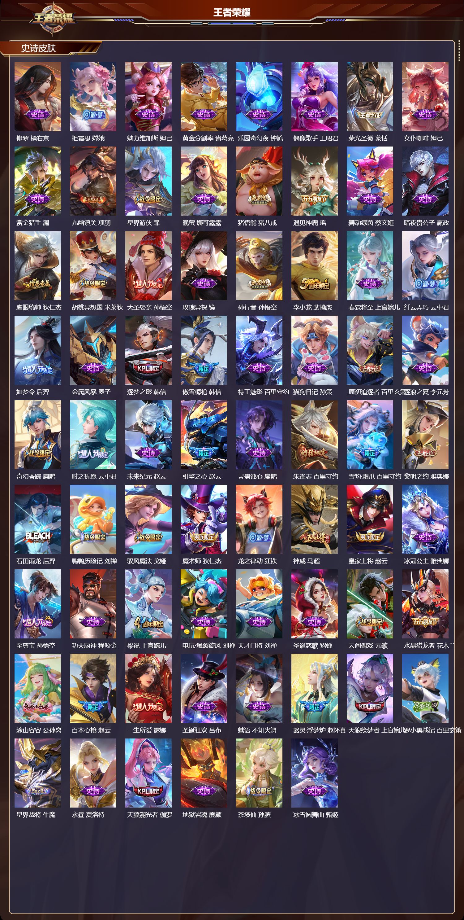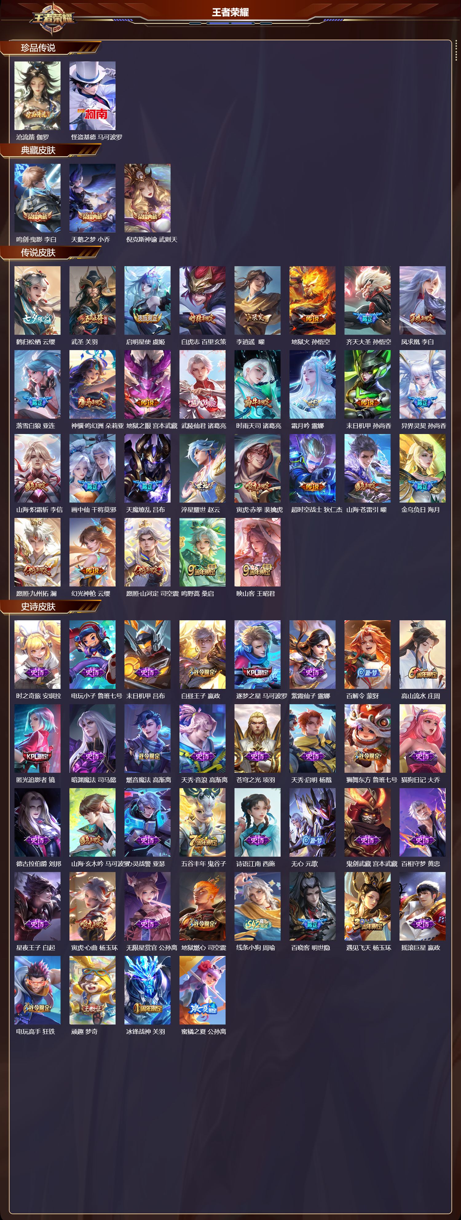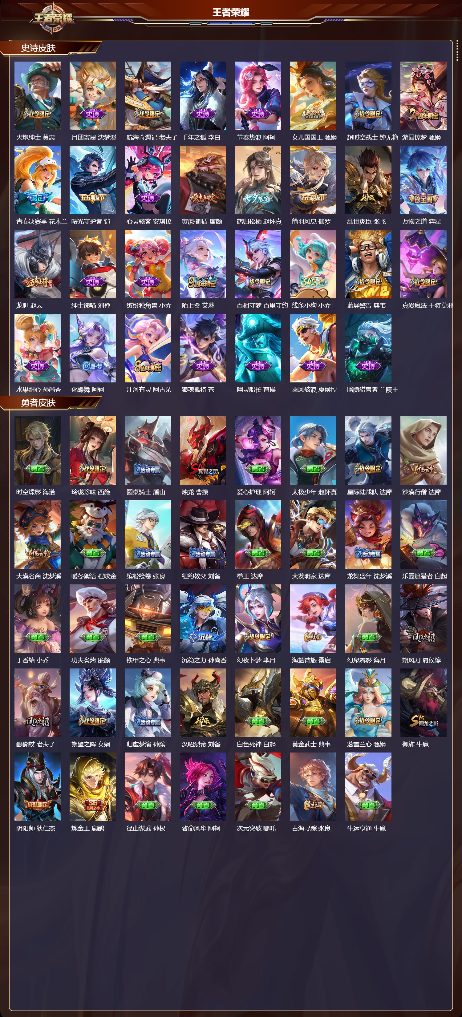 【137,史诗皮肤】时之奇旅,安琪拉,电玩小子,鲁班七号,末日机甲,吕布,白昼王子,嬴政,逐梦之星,马可波罗,紫霞仙子,露娜,百解令,蒙犽,高山流水,庄周,匿光追影者,镜,暗渊魔法,司马懿,燃音魔法,高渐离,天秀·音浪,高渐离,苍穹之光,项羽,天秀·启明,杨戬,狮舞东方,鲁班七号,猫狗日记,大乔,德古拉伯爵,刘邦,山海·玄木吟,马可波罗,心灵战警,亚瑟,五谷丰年,鬼谷子,诗语江南,西施,无心,元歌,鬼剑武藏,宫本武藏,百相守梦,黄忠,星夜王子,白起,寅虎·心曲,杨玉环,无限星赏官,公孙离,地狱燃心,司空震,线条小狗,周瑜,百晓客,明世隐,遇见飞天,杨玉环,摇滚巨星,嬴政,电玩高手,狂铁,顽趣,梦奇,冰锋战神,关羽,蜜橘之夏,公孙离,修罗,橘右京,拒霜思,嫦娥,魅力维加斯,妲己,黄金分割率,诸葛亮,乐园奇幻夜,钟馗,偶像歌手,王昭君,荣光圣徽,蒙恬,女仆咖啡,妲己,赏金猎手,澜,九幽镇关,项羽,星界游侠,暃,晚萤,娜可露露,猪悟能,猪八戒,遇见神鹿,瑶,舞动绿茵,蔡文姬,暗夜贵公子,嬴政,鹰眼统帅,狄仁杰,胡桃异想国,米莱狄,大圣娶亲,孙悟空,玫瑰异探,镜,孙行者,孙悟空,李小龙,裴擒虎,春霖将至,上官婉儿,纤云弄巧,云中君,如梦令,后羿,金属风暴,墨子,逐梦之影,韩信,傲雪梅枪,韩信,特工魅影,百里守约,猫狗日记,孙策,原初追逐者,百里玄策,逐浪之夏,李元芳,奇幻香踪,扁鹊,时之祈愿,云中君,未来纪元,赵云,引擎之心,赵云,灵蛊蚀心,扁鹊,朱雀志,百里守约,雪豹·霜爪,百里守约,黎明之约,雅典娜,石田雨龙,后羿,鸭鸭历险记,刘禅,驭风魔法,戈娅,魔术师,狄仁杰,龙之律动,狂铁,神威,马超,皇家上将,赵云,冰冠公主,雅典娜,至尊宝,孙悟空,功夫厨神,程咬金,梁祝,上官婉儿,电玩·爆裂旋风,刘禅,天才门将,刘禅,圣诞恋歌,貂蝉,云间偶戏,元歌,水晶猎龙者,花木兰,涂山容容,公孙离,百木心枪,赵云,一生所爱,露娜,圣诞狂欢,吕布,魅语,不知火舞,器灵·浮梦炉,赵怀真,天狼绘梦者,上官婉儿,罗小黑战记,百里玄策,星界战将,牛魔,永昼,夏洛特,天狼溯光者,伽罗,地狱岩魂,廉颇,茶境仙,孙膑,冰雪圆舞曲,甄姬,火炮绅士,黄忠,月团寄思,沈梦溪,航海奇遇记,老夫子,千年之狐,李白,节奏热浪,阿轲,女儿国国王,甄姬,超时空战士,钟无艳,游园惊梦,甄姬,青春决赛季,花木兰,曙光守护者,铠,心灵骇客,安琪拉,寅虎·御盾,廉颇,鹤归松栖,赵怀真,箭羽风息,伽罗,乱世虎臣,张飞,万物之道,弈星,龙胆,赵云,绅士熊喵,刘禅,缤纷独角兽,小乔,陌上桑,艾琳,百相守梦,百里守约,线条小狗,小乔,蓝屏警告,典韦,真爱魔法,干将莫邪,水果甜心,孙尚香,化蝶舞,阿轲,江河有灵,阿古朵,狼魂孤将,苍,幽灵船长,曹操,乘风破浪,夏侯惇,暗隐猎兽者,兰陵王,
