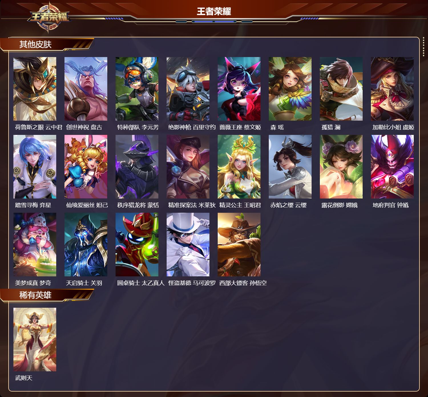 【85,其他皮肤】沧流箭,伽罗,伊势巫女,大乔,金属狂潮,高渐离,前尘,金蝉,战争骑士,夏侯惇,圣殿之光,刘邦,芝加哥教父,黄忠,潮流仙人,老夫子,三太子,哪吒,棒球奇才,沈梦溪,极冰防御线,盾山,龙域领主,铠,生化警戒,钟无艳,死神来了,曹操,超能战警,曹操,花见巫女,伽罗,爱与和平,苏烈,未来旅行,孙膑,第七人偶,干将莫邪,万圣前夜,小乔,灼热之刃,李信,熊喵少女,阿古朵,海之征途,孙策,木偶奇遇记,鲁班七号,福禄兄弟,鲁班七号,帝国元帅,项羽,精灵王,后羿,绯红之刃,露娜,冰刃幻境,镜,碧珀绯影,暃,海军大将,周瑜,星航指挥官,诸葛亮,魇语军师,司马懿,英喵野望,刘禅,午夜歌剧院,元歌,启蛰,司空震,隐刃,兰陵王,霓裳曲,杨玉环,花间舞,公孙离,异域舞娘,貂蝉,街头旋风,裴擒虎,归虚梦演,鲁班大师,东海龙王,东皇太一,修竹墨客,上官婉儿,剑舞者,花木兰,范海辛,李白,维京掠夺者,苍,占星师,明世隐,归虚梦演,蒙犽,激情绿茵,马可波罗,埃及法老,杨戬,归虚梦演,西施,阿摩司公爵,鬼谷子,画中游,桑启,年年有余,猪八戒,天堂福音,张良,尼罗河女神,女娲,锦衣卫,狄仁杰,一千零一夜,张良,归虚梦演,曜,华尔街大亨,程咬金,威尼斯狂欢,百里玄策,幸存者,马超,战争女神,雅典娜,荷鲁斯之眼,云中君,创世神祝,盘古,特种部队,李元芳,绝影神枪,百里守约,蔷薇王座,蔡文姬,森,瑶,孤猎,澜,加勒比小姐,虞姬,踏雪寻梅,弈星,仙境爱丽丝,妲己,秩序猎龙将,蒙恬,精准探案法,米莱狄,精灵公主,王昭君,赤焰之缨,云缨,露花倒影,嫦娥,地府判官,钟馗,美梦成真,梦奇,天启骑士,关羽,圆桌骑士,太乙真人,怪盗基德,马可波罗,西部大镖客,孙悟空,