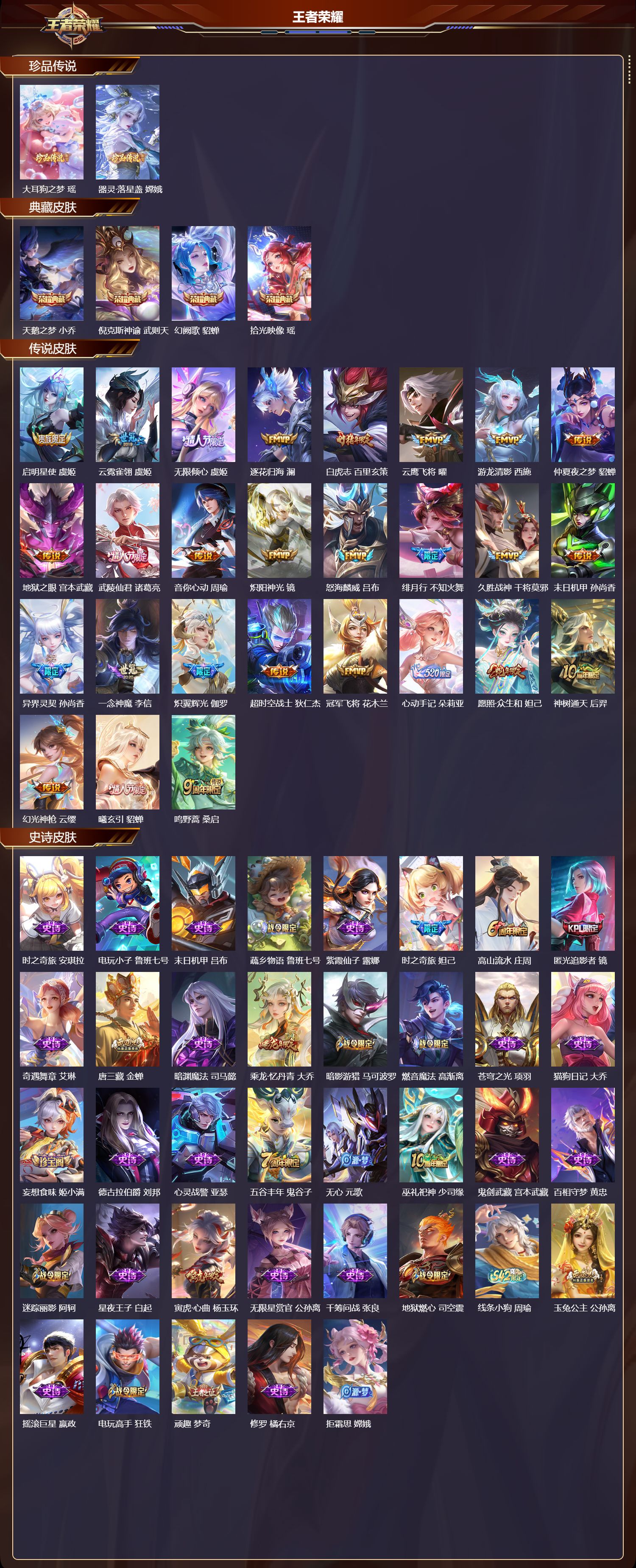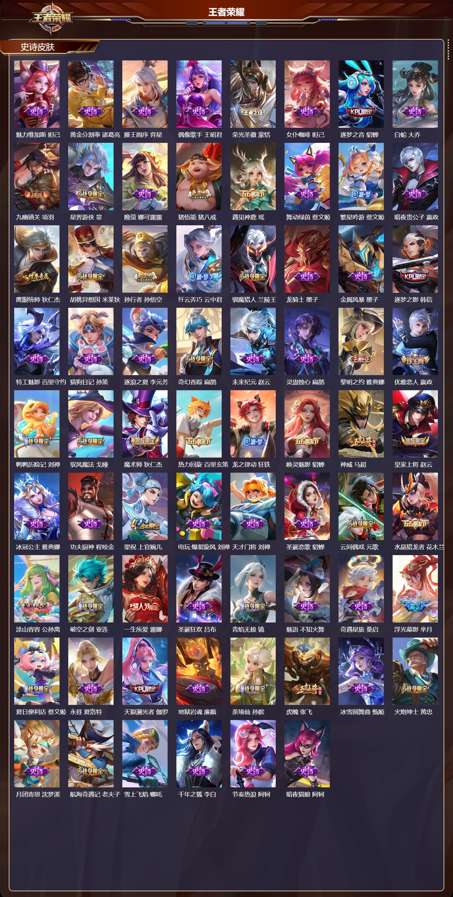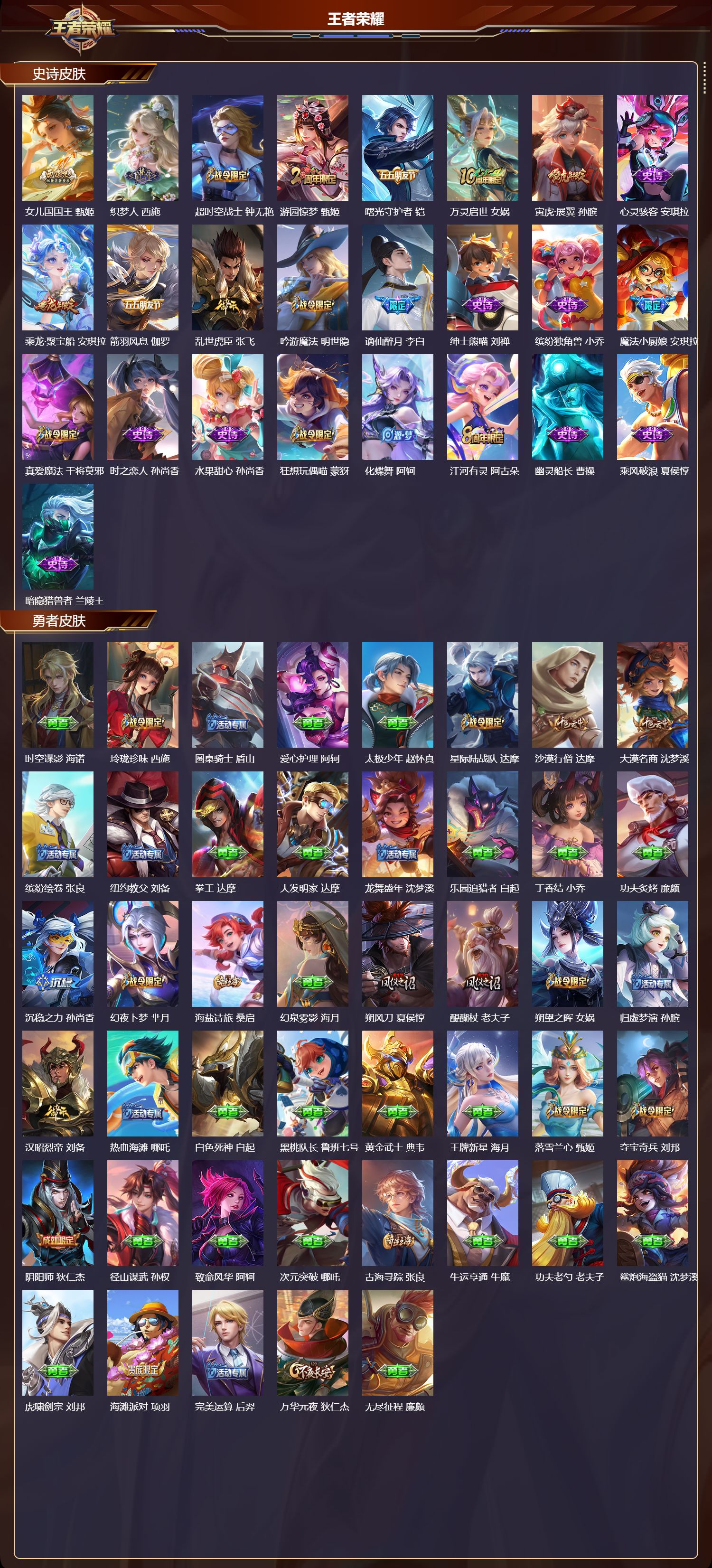 【132,史诗皮肤】时之奇旅,安琪拉,电玩小子,鲁班七号,末日机甲,吕布,蔬乡物语,鲁班七号,紫霞仙子,露娜,时之奇旅,妲己,高山流水,庄周,匿光追影者,镜,奇遇舞章,艾琳,唐三藏,金蝉,暗渊魔法,司马懿,乘龙·忆丹青,大乔,暗影游猎,马可波罗,燃音魔法,高渐离,苍穹之光,项羽,猫狗日记,大乔,妄想食味,姬小满,德古拉伯爵,刘邦,心灵战警,亚瑟,五谷丰年,鬼谷子,无心,元歌,巫礼祀神,少司缘,鬼剑武藏,宫本武藏,百相守梦,黄忠,迷踪丽影,阿轲,星夜王子,白起,寅虎·心曲,杨玉环,无限星赏官,公孙离,千筹问战,张良,地狱燃心,司空震,线条小狗,周瑜,玉兔公主,公孙离,摇滚巨星,嬴政,电玩高手,狂铁,顽趣,梦奇,修罗,橘右京,拒霜思,嫦娥,魅力维加斯,妲己,黄金分割率,诸葛亮,滕王阁序,弈星,偶像歌手,王昭君,荣光圣徽,蒙恬,女仆咖啡,妲己,逐梦之音,貂蝉,白蛇,大乔,九幽镇关,项羽,星界游侠,暃,晚萤,娜可露露,猪悟能,猪八戒,遇见神鹿,瑶,舞动绿茵,蔡文姬,繁星吟游,蔡文姬,暗夜贵公子,嬴政,鹰眼统帅,狄仁杰,胡桃异想国,米莱狄,孙行者,孙悟空,纤云弄巧,云中君,驯魔猎人,兰陵王,龙骑士,墨子,金属风暴,墨子,逐梦之影,韩信,特工魅影,百里守约,猫狗日记,孙策,逐浪之夏,李元芳,奇幻香踪,扁鹊,未来纪元,赵云,灵蛊蚀心,扁鹊,黎明之约,雅典娜,优雅恋人,嬴政,鸭鸭历险记,刘禅,驭风魔法,戈娅,魔术师,狄仁杰,热力回旋,百里玄策,龙之律动,狂铁,唤灵魅影,貂蝉,神威,马超,皇家上将,赵云,冰冠公主,雅典娜,功夫厨神,程咬金,梁祝,上官婉儿,电玩·爆裂旋风,刘禅,天才门将,刘禅,圣诞恋歌,貂蝉,云间偶戏,元歌,水晶猎龙者,花木兰,涂山容容,公孙离,破空之剑,亚连,一生所爱,露娜,圣诞狂欢,吕布,青焰无极,镜,魅语,不知火舞,奇遇星旅,桑启,浮光幕影,芈月,夏日便利店,蔡文姬,永昼,夏洛特,天狼溯光者,伽罗,地狱岩魂,廉颇,茶境仙,孙膑,虎魄,张飞,冰雪圆舞曲,甄姬,火炮绅士,黄忠,月团寄思,沈梦溪,航海奇遇记,老夫子,雪上飞焰,哪吒,千年之狐,李白,节奏热浪,阿轲,暗夜猫娘,阿轲,女儿国国王,甄姬,织梦人,西施,超时空战士,钟无艳,游园惊梦,甄姬,曙光守护者,铠,万灵启世,女娲,寅虎·展翼,孙膑,心灵骇客,安琪拉,乘龙·聚宝船,安琪拉,箭羽风息,伽罗,乱世虎臣,张飞,吟游魔法,明世隐,谪仙醉月,李白,绅士熊喵,刘禅,缤纷独角兽,小乔,魔法小厨娘,安琪拉,真爱魔法,干将莫邪,时之恋人,孙尚香,水果甜心,孙尚香,狂想玩偶喵,蒙犽,化蝶舞,阿轲,江河有灵,阿古朵,幽灵船长,曹操,乘风破浪,夏侯惇,暗隐猎兽者,兰陵王,