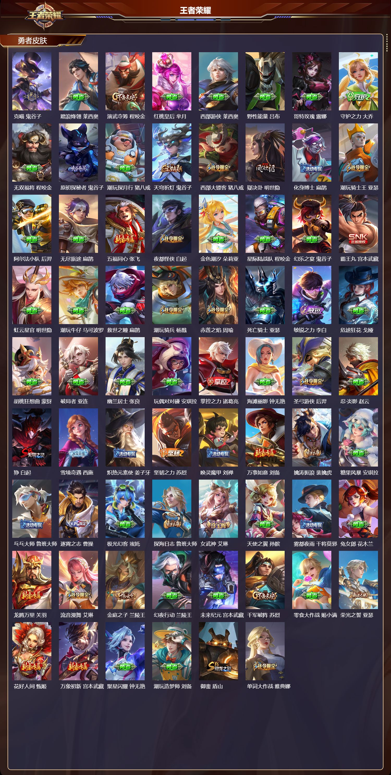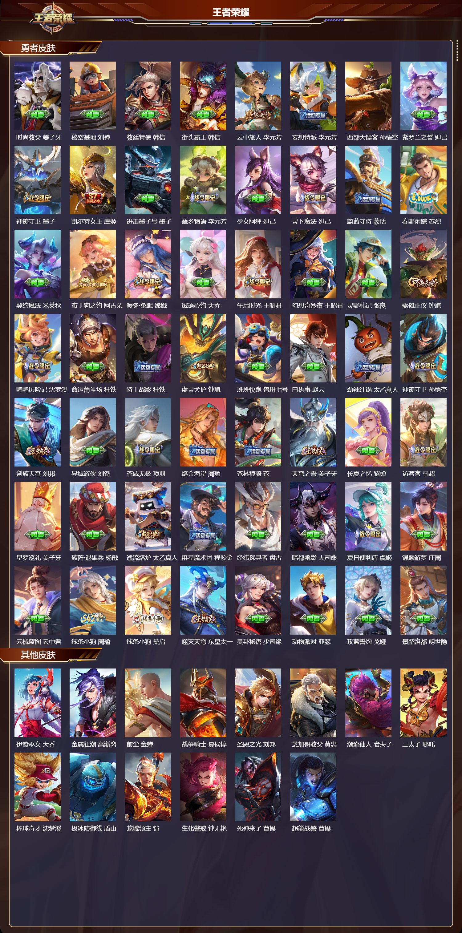 【171,勇者皮肤】时空谍影,海诺,玲珑珍味,西施,圆桌骑士,盾山,爱心护理,阿轲,太极少年,赵怀真,星际陆战队,达摩,沙漠行僧,达摩,大漠名商,沈梦溪,缤纷绘卷,张良,纽约教父,刘备,拳王,达摩,大发明家,达摩,龙舞盛年,沈梦溪,乐园追猎者,白起,丁香结,小乔,功夫炙烤,廉颇,沉稳之力,孙尚香,幻夜卜梦,芈月,海盐诗旅,桑启,幻泉雾影,海月,朔风刀,夏侯惇,醍醐杖,老夫子,朔望之晖,女娲,归虚梦演,孙膑,汉昭烈帝,刘备,热血海滩,哪吒,白色死神,白起,黑桃队长,鲁班七号,黄金武士,典韦,王牌新星,海月,落雪兰心,甄姬,夺宝奇兵,刘邦,阴阳师,狄仁杰,径山谋武,孙权,致命风华,阿轲,次元突破,哪吒,古海寻踪,张良,牛运亨通,牛魔,功夫老勺,老夫子,鲨炮海盗猫,沈梦溪,虎啸剑宗,刘邦,海滩派对,项羽,完美运算,后羿,万华元夜,狄仁杰,无尽征程,廉颇,克喵,鬼谷子,踏浪烽翎,莱西奥,演武夺筹,程咬金,红桃皇后,芈月,西部游侠,莱西奥,野性能量,吕布,哥特玫瑰,露娜,守护之力,大乔,无双福将,程咬金,原初探秘者,鬼谷子,潮玩探月行,猪八戒,天穹祈灯,鬼谷子,西部大镖客,猪八戒,疑决卦,明世隐,化身博士,扁鹊,潮玩骑士王,亚瑟,阿尔法小队,后羿,无尽旅途,扁鹊,五福同心,张飞,夜都怪侠,白起,金色潮汐,朵莉亚,星际陆战队,程咬金,幻乐之宴,鬼谷子,霸王丸,宫本武藏,虹云星官,明世隐,潮玩牛仔,马可波罗,救世之瞳,扁鹊,潮玩骑兵,杨戬,赤莲之焰,周瑜,死亡骑士,亚瑟,敏锐之力,李白,危途狂花,戈娅,胡桃狂想曲,蒙犽,破局者,亚连,幽兰居士,张良,玩偶对对碰,安琪拉,掌控之力,诸葛亮,海滩丽影,钟无艳,圣弓游侠,后羿,忍·炎影,赵云,狰,白起,雪境奇遇,西施,炽热元素使,姜子牙,坚韧之力,苏烈,唤灵魔甲,刘禅,万事如意,刘备,擒涛扼浪,裴擒虎,糖果风暴,安琪拉,乓乓大师,鲁班大师,逐霄之志,曹操,极光幻客,蚩奼,探海日志,鲁班大师,女武神,艾琳,天使之翼,孙膑,雾都夜雨,干将莫邪,兔女郎,花木兰,龙腾万里,关羽,流音漫舞,艾琳,金庭之子,兰陵王,幻夜行动,兰陵王,未来纪元,宫本武藏,千军破阵,苏烈,零食大作战,姬小满,荣光之誓,亚瑟,花好人间,甄姬,万象初新,宫本武藏,聚星闪耀,钟无艳,潮玩造梦师,刘备,御銮,盾山,单词大作战,雅典娜,时尚教父,姜子牙,秘密基地,刘禅,教廷特使,韩信,街头霸王,韩信,云中旅人,李元芳,妄想特派,李元芳,西部大镖客,孙悟空,紫罗兰之誓,妲己,神迹守卫,墨子,凯尔特女王,虞姬,进击墨子号,墨子,蔬乡物语,李元芳,少女阿狸,妲己,灵卜魔法,妲己,蔚蓝守将,蒙恬,春野闲踪,苏烈,契约魔法,米莱狄,布丁狗之约,阿古朵,暖冬·兔眠,嫦娥,绒语心约,大乔,午后时光,王昭君,幻想奇妙夜,王昭君,灵野札记,张良,驱傩正仪,钟馗,鸭鸭历险记,沈梦溪,命运角斗场,狂铁,特工战影,狂铁,虚灵犬护,钟馗,班班快跑,鲁班七号,白执事,赵云,劲辣红锅,太乙真人,神迹守卫,孙悟空,剑破天穹,刘邦,异域游侠,刘备,苍威无极,项羽,熔金海岸,周瑜,苍林狼骑,苍,天穹之誓,姜子牙,长夏之忆,貂蝉,访茗客,马超,星梦巡礼,姜子牙,破阵·退雄兵,杨戬,谧流熔炉,太乙真人,群星魔术团,程咬金,经纬探寻者,盘古,暗都幽影,大司命,夏日便利店,虞姬,锦麟游梦,庄周,云械蓝图,云中君,线条小狗,周瑜,线条小狗,桑启,噬灭天穹,东皇太一,灵卦秘语,少司缘,动物派对,亚瑟,玫蓝誓约,戈娅,景韶洛都,明世隐,