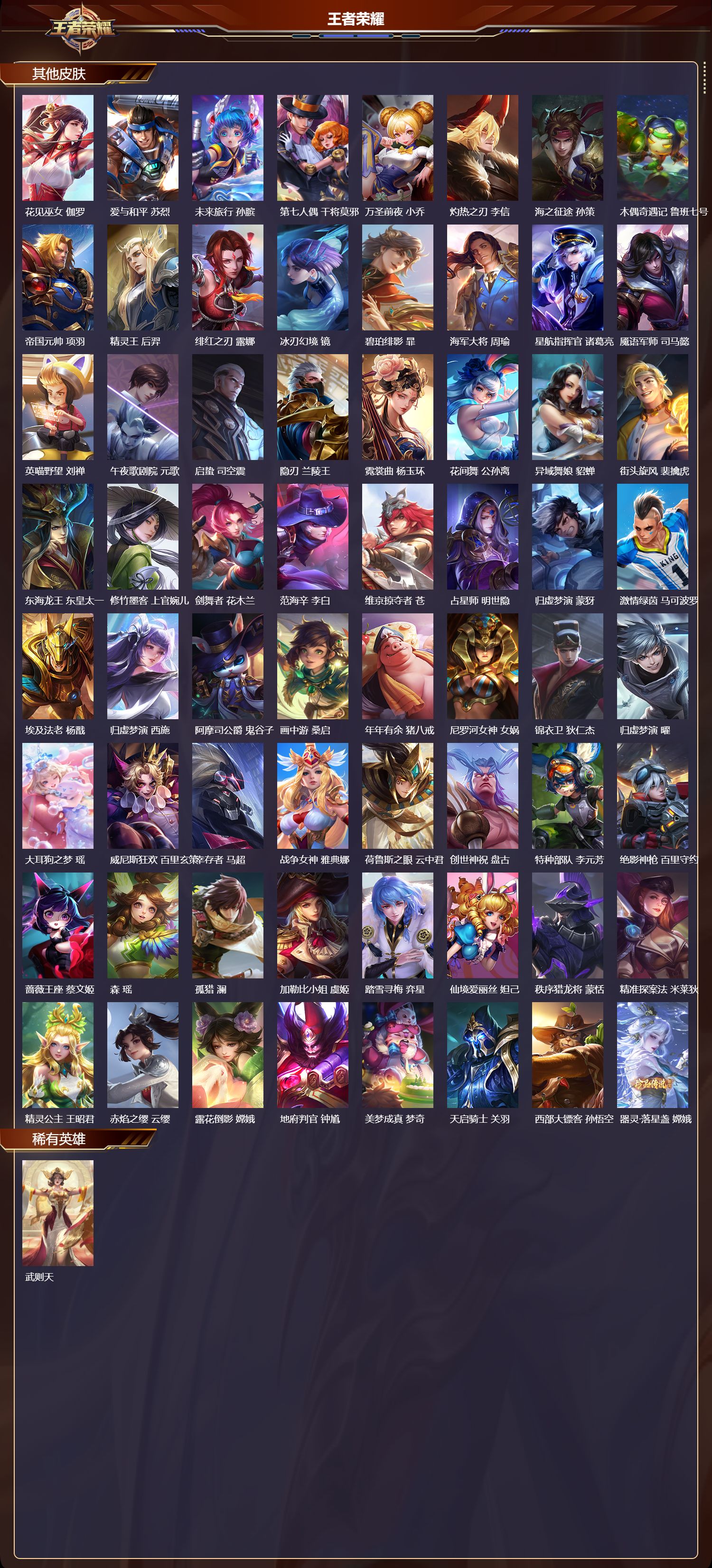 【78,其他皮肤】伊势巫女,大乔,金属狂潮,高渐离,前尘,金蝉,战争骑士,夏侯惇,圣殿之光,刘邦,芝加哥教父,黄忠,潮流仙人,老夫子,三太子,哪吒,棒球奇才,沈梦溪,极冰防御线,盾山,龙域领主,铠,生化警戒,钟无艳,死神来了,曹操,超能战警,曹操,花见巫女,伽罗,爱与和平,苏烈,未来旅行,孙膑,第七人偶,干将莫邪,万圣前夜,小乔,灼热之刃,李信,海之征途,孙策,木偶奇遇记,鲁班七号,帝国元帅,项羽,精灵王,后羿,绯红之刃,露娜,冰刃幻境,镜,碧珀绯影,暃,海军大将,周瑜,星航指挥官,诸葛亮,魇语军师,司马懿,英喵野望,刘禅,午夜歌剧院,元歌,启蛰,司空震,隐刃,兰陵王,霓裳曲,杨玉环,花间舞,公孙离,异域舞娘,貂蝉,街头旋风,裴擒虎,东海龙王,东皇太一,修竹墨客,上官婉儿,剑舞者,花木兰,范海辛,李白,维京掠夺者,苍,占星师,明世隐,归虚梦演,蒙犽,激情绿茵,马可波罗,埃及法老,杨戬,归虚梦演,西施,阿摩司公爵,鬼谷子,画中游,桑启,年年有余,猪八戒,尼罗河女神,女娲,锦衣卫,狄仁杰,归虚梦演,曜,大耳狗之梦,瑶,威尼斯狂欢,百里玄策,幸存者,马超,战争女神,雅典娜,荷鲁斯之眼,云中君,创世神祝,盘古,特种部队,李元芳,绝影神枪,百里守约,蔷薇王座,蔡文姬,森,瑶,孤猎,澜,加勒比小姐,虞姬,踏雪寻梅,弈星,仙境爱丽丝,妲己,秩序猎龙将,蒙恬,精准探案法,米莱狄,精灵公主,王昭君,赤焰之缨,云缨,露花倒影,嫦娥,地府判官,钟馗,美梦成真,梦奇,天启骑士,关羽,西部大镖客,孙悟空,器灵·落星盏,嫦娥,