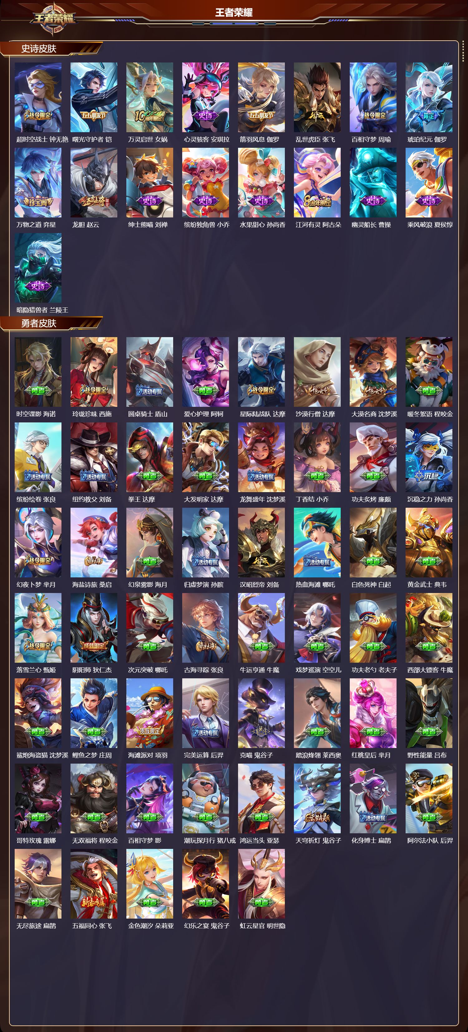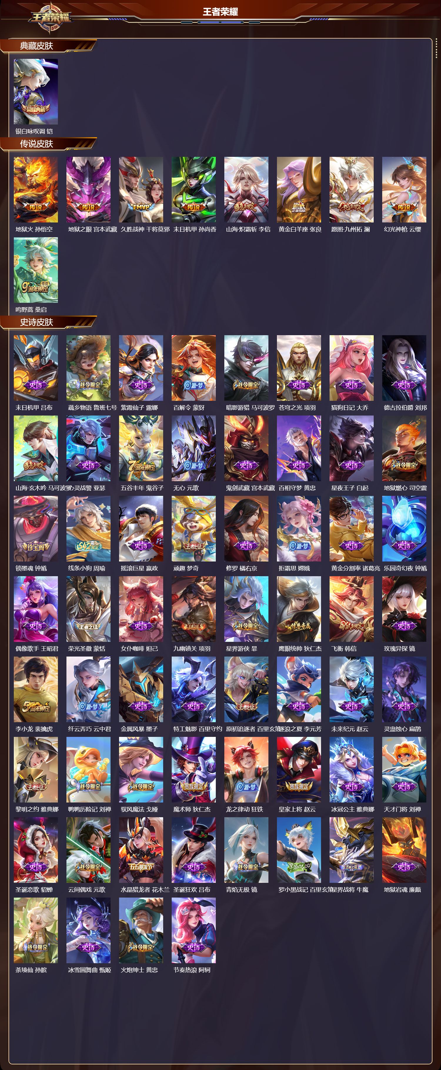 【77,史诗皮肤】末日机甲,吕布,蔬乡物语,鲁班七号,紫霞仙子,露娜,百解令,蒙犽,暗影游猎,马可波罗,苍穹之光,项羽,猫狗日记,大乔,德古拉伯爵,刘邦,山海·玄木吟,马可波罗,心灵战警,亚瑟,五谷丰年,鬼谷子,无心,元歌,鬼剑武藏,宫本武藏,百相守梦,黄忠,星夜王子,白起,地狱燃心,司空震,锁墨魂,钟馗,线条小狗,周瑜,摇滚巨星,嬴政,顽趣,梦奇,修罗,橘右京,拒霜思,嫦娥,黄金分割率,诸葛亮,乐园奇幻夜,钟馗,偶像歌手,王昭君,荣光圣徽,蒙恬,女仆咖啡,妲己,九幽镇关,项羽,星界游侠,暃,鹰眼统帅,狄仁杰,飞衡,韩信,玫瑰异探,镜,李小龙,裴擒虎,纤云弄巧,云中君,金属风暴,墨子,特工魅影,百里守约,原初追逐者,百里玄策,逐浪之夏,李元芳,未来纪元,赵云,灵蛊蚀心,扁鹊,黎明之约,雅典娜,鸭鸭历险记,刘禅,驭风魔法,戈娅,魔术师,狄仁杰,龙之律动,狂铁,皇家上将,赵云,冰冠公主,雅典娜,天才门将,刘禅,圣诞恋歌,貂蝉,云间偶戏,元歌,水晶猎龙者,花木兰,圣诞狂欢,吕布,青焰无极,镜,罗小黑战记,百里玄策,星界战将,牛魔,地狱岩魂,廉颇,茶境仙,孙膑,冰雪圆舞曲,甄姬,火炮绅士,黄忠,节奏热浪,阿轲,超时空战士,钟无艳,曙光守护者,铠,万灵启世,女娲,心灵骇客,安琪拉,箭羽风息,伽罗,乱世虎臣,张飞,百相守梦,周瑜,琥珀纪元,伽罗,万物之道,弈星,龙胆,赵云,绅士熊喵,刘禅,缤纷独角兽,小乔,水果甜心,孙尚香,江河有灵,阿古朵,幽灵船长,曹操,乘风破浪,夏侯惇,暗隐猎兽者,兰陵王,