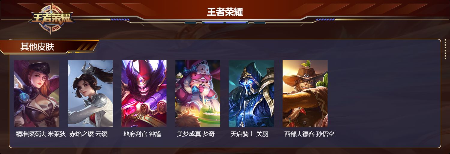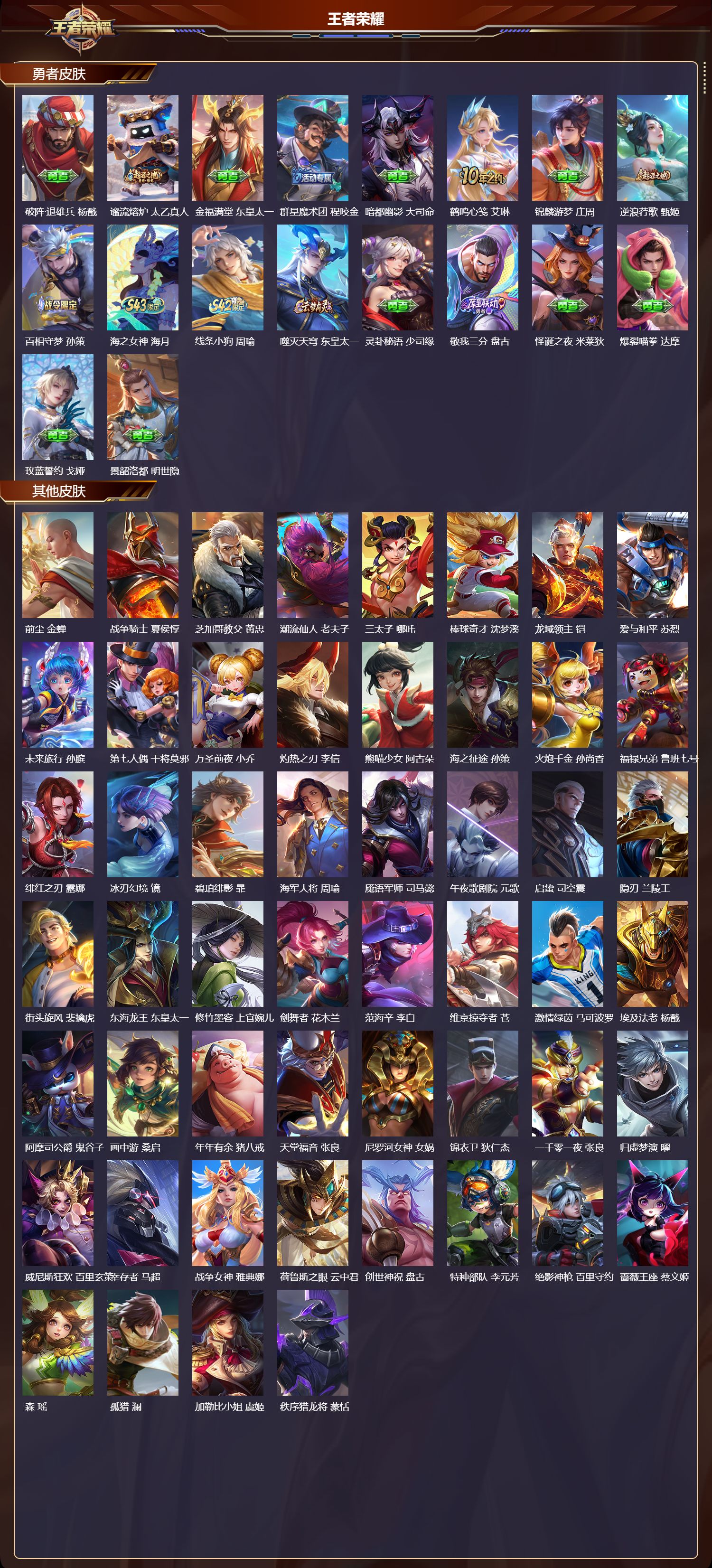 【58,其他皮肤】前尘,金蝉,战争骑士,夏侯惇,芝加哥教父,黄忠,潮流仙人,老夫子,三太子,哪吒,棒球奇才,沈梦溪,龙域领主,铠,爱与和平,苏烈,未来旅行,孙膑,第七人偶,干将莫邪,万圣前夜,小乔,灼热之刃,李信,熊喵少女,阿古朵,海之征途,孙策,火炮千金,孙尚香,福禄兄弟,鲁班七号,绯红之刃,露娜,冰刃幻境,镜,碧珀绯影,暃,海军大将,周瑜,魇语军师,司马懿,午夜歌剧院,元歌,启蛰,司空震,隐刃,兰陵王,街头旋风,裴擒虎,东海龙王,东皇太一,修竹墨客,上官婉儿,剑舞者,花木兰,范海辛,李白,维京掠夺者,苍,激情绿茵,马可波罗,埃及法老,杨戬,阿摩司公爵,鬼谷子,画中游,桑启,年年有余,猪八戒,天堂福音,张良,尼罗河女神,女娲,锦衣卫,狄仁杰,一千零一夜,张良,归虚梦演,曜,威尼斯狂欢,百里玄策,幸存者,马超,战争女神,雅典娜,荷鲁斯之眼,云中君,创世神祝,盘古,特种部队,李元芳,绝影神枪,百里守约,蔷薇王座,蔡文姬,森,瑶,孤猎,澜,加勒比小姐,虞姬,秩序猎龙将,蒙恬,精准探案法,米莱狄,赤焰之缨,云缨,地府判官,钟馗,美梦成真,梦奇,天启骑士,关羽,西部大镖客,孙悟空,