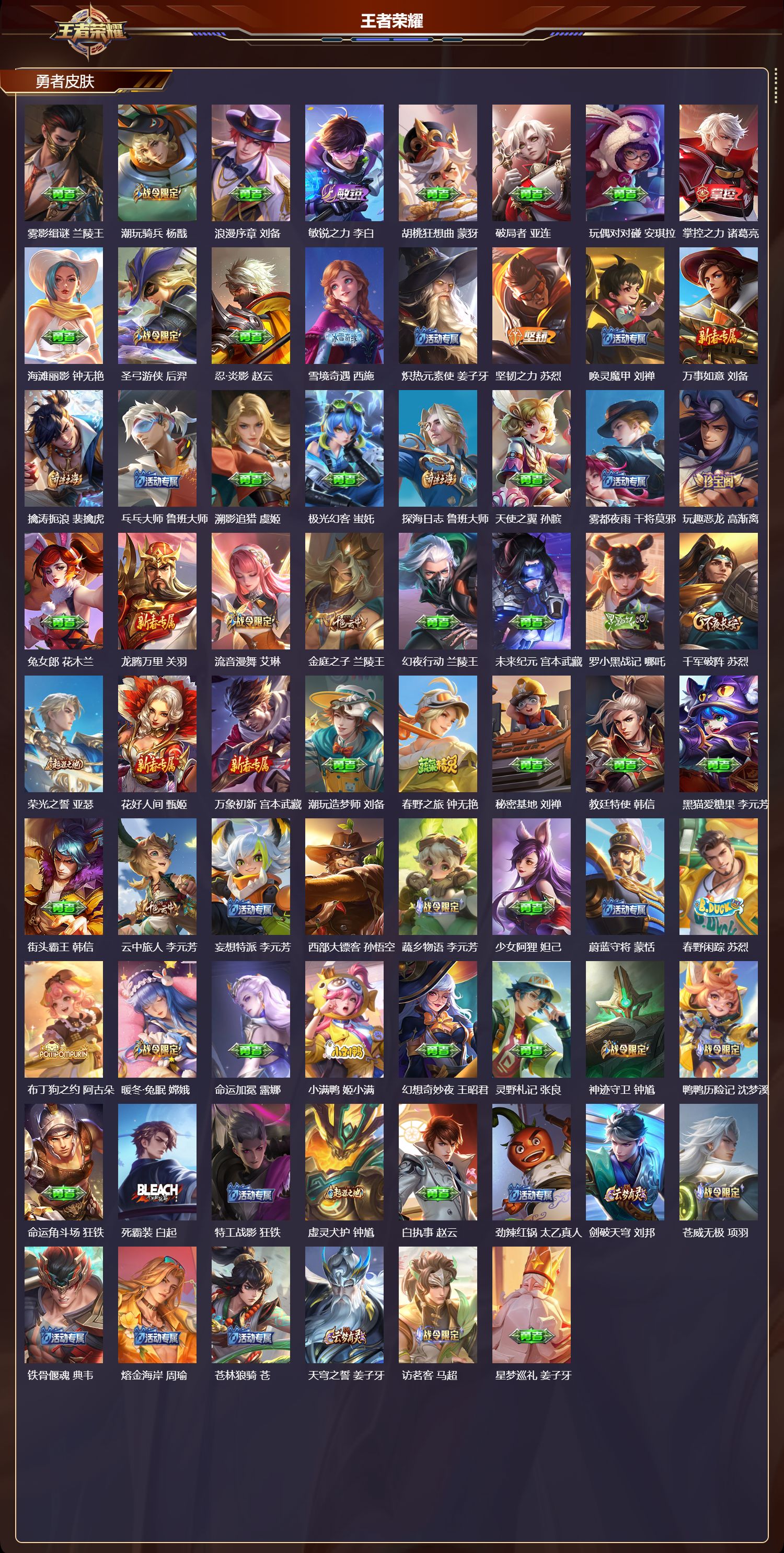 【141,勇者皮肤】时空谍影,海诺,玲珑珍味,西施,圆桌骑士,盾山,爱心护理,阿轲,星际陆战队,达摩,沙漠行僧,达摩,大漠名商,沈梦溪,暖冬絮语,程咬金,缤纷绘卷,张良,纽约教父,刘备,拳王,达摩,大发明家,达摩,龙舞盛年,沈梦溪,丁香结,小乔,功夫炙烤,廉颇,沉稳之力,孙尚香,幻夜卜梦,芈月,海盐诗旅,桑启,幻泉雾影,海月,归虚梦演,孙膑,汉昭烈帝,刘备,热血海滩,哪吒,白色死神,白起,黄金武士,典韦,落雪兰心,甄姬,阴阳师,狄仁杰,次元突破,哪吒,古海寻踪,张良,牛运亨通,牛魔,戏梦巡演,空空儿,功夫老勺,老夫子,西部大镖客,牛魔,鲨炮海盗猫,沈梦溪,鲤鱼之梦,庄周,海滩派对,项羽,完美运算,后羿,克喵,鬼谷子,踏浪烽翎,莱西奥,红桃皇后,芈月,野性能量,吕布,哥特玫瑰,露娜,无双福将,程咬金,百相守梦,影,潮玩探月行,猪八戒,鸿运当头,亚瑟,天穹祈灯,鬼谷子,化身博士,扁鹊,阿尔法小队,后羿,无尽旅途,扁鹊,五福同心,张飞,金色潮汐,朵莉亚,幻乐之宴,鬼谷子,虹云星官,明世隐,雾影缉谜,兰陵王,潮玩骑兵,杨戬,浪漫序章,刘备,敏锐之力,李白,胡桃狂想曲,蒙犽,破局者,亚连,玩偶对对碰,安琪拉,掌控之力,诸葛亮,海滩丽影,钟无艳,圣弓游侠,后羿,忍·炎影,赵云,雪境奇遇,西施,炽热元素使,姜子牙,坚韧之力,苏烈,唤灵魔甲,刘禅,万事如意,刘备,擒涛扼浪,裴擒虎,乓乓大师,鲁班大师,溯影追猎,虞姬,极光幻客,蚩奼,探海日志,鲁班大师,天使之翼,孙膑,雾都夜雨,干将莫邪,玩趣恶龙,高渐离,兔女郎,花木兰,龙腾万里,关羽,流音漫舞,艾琳,金庭之子,兰陵王,幻夜行动,兰陵王,未来纪元,宫本武藏,罗小黑战记,哪吒,千军破阵,苏烈,荣光之誓,亚瑟,花好人间,甄姬,万象初新,宫本武藏,潮玩造梦师,刘备,春野之旅,钟无艳,秘密基地,刘禅,教廷特使,韩信,黑猫爱糖果,李元芳,街头霸王,韩信,云中旅人,李元芳,妄想特派,李元芳,西部大镖客,孙悟空,蔬乡物语,李元芳,少女阿狸,妲己,蔚蓝守将,蒙恬,春野闲踪,苏烈,布丁狗之约,阿古朵,暖冬·兔眠,嫦娥,命运加冕,露娜,小满鸭,姬小满,幻想奇妙夜,王昭君,灵野札记,张良,神迹守卫,钟馗,鸭鸭历险记,沈梦溪,命运角斗场,狂铁,死霸装,白起,特工战影,狂铁,虚灵犬护,钟馗,白执事,赵云,劲辣红锅,太乙真人,剑破天穹,刘邦,苍威无极,项羽,铁骨偃魂,典韦,熔金海岸,周瑜,苍林狼骑,苍,天穹之誓,姜子牙,访茗客,马超,星梦巡礼,姜子牙,破阵·退雄兵,杨戬,谧流熔炉,太乙真人,金福满堂,东皇太一,群星魔术团,程咬金,暗都幽影,大司命,鹤鸣心笺,艾琳,锦麟游梦,庄周,逆浪荇歌,甄姬,百相守梦,孙策,海之女神,海月,线条小狗,周瑜,噬灭天穹,东皇太一,灵卦秘语,少司缘,敬我三分,盘古,怪诞之夜,米莱狄,爆裂喵拳,达摩,玫蓝誓约,戈娅,景韶洛都,明世隐,