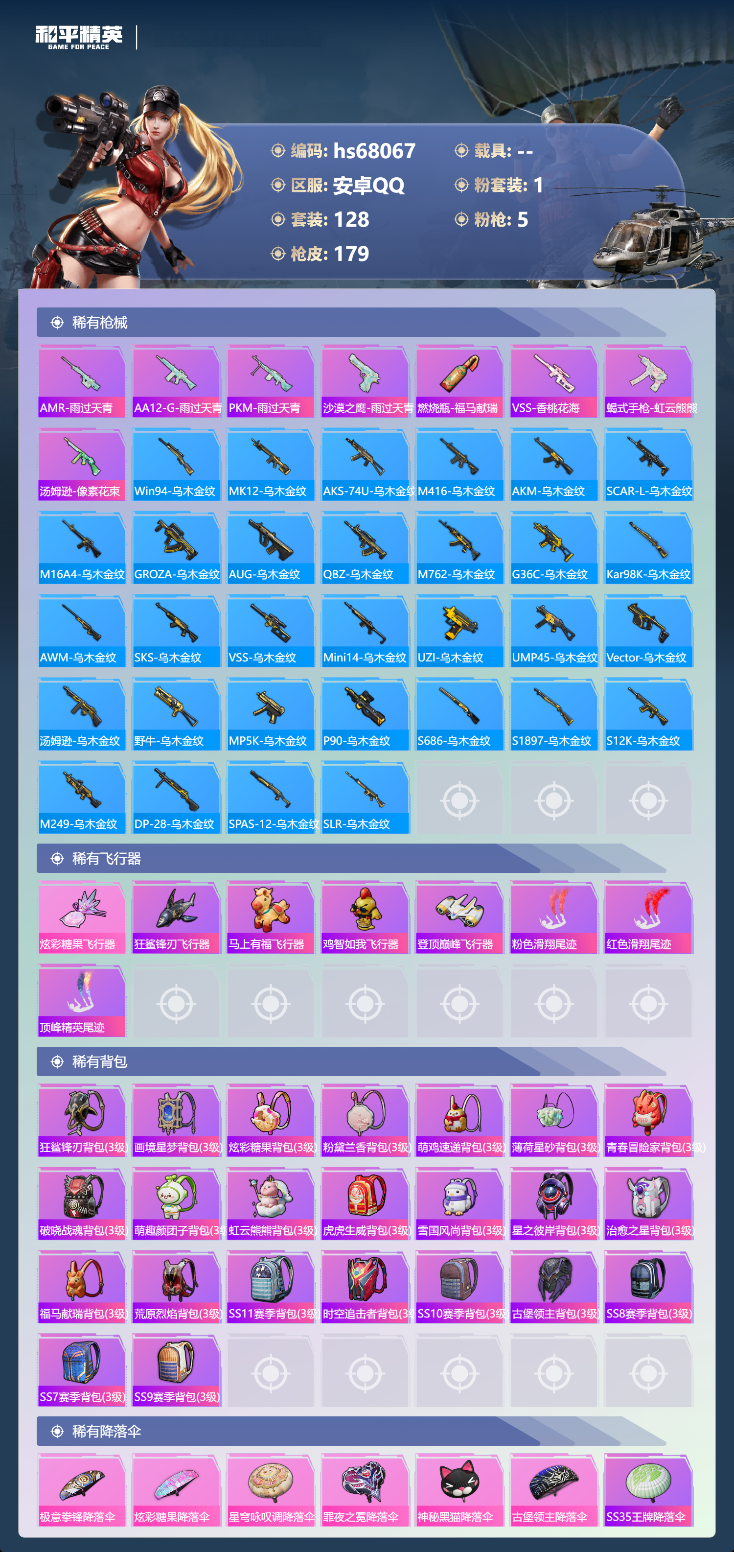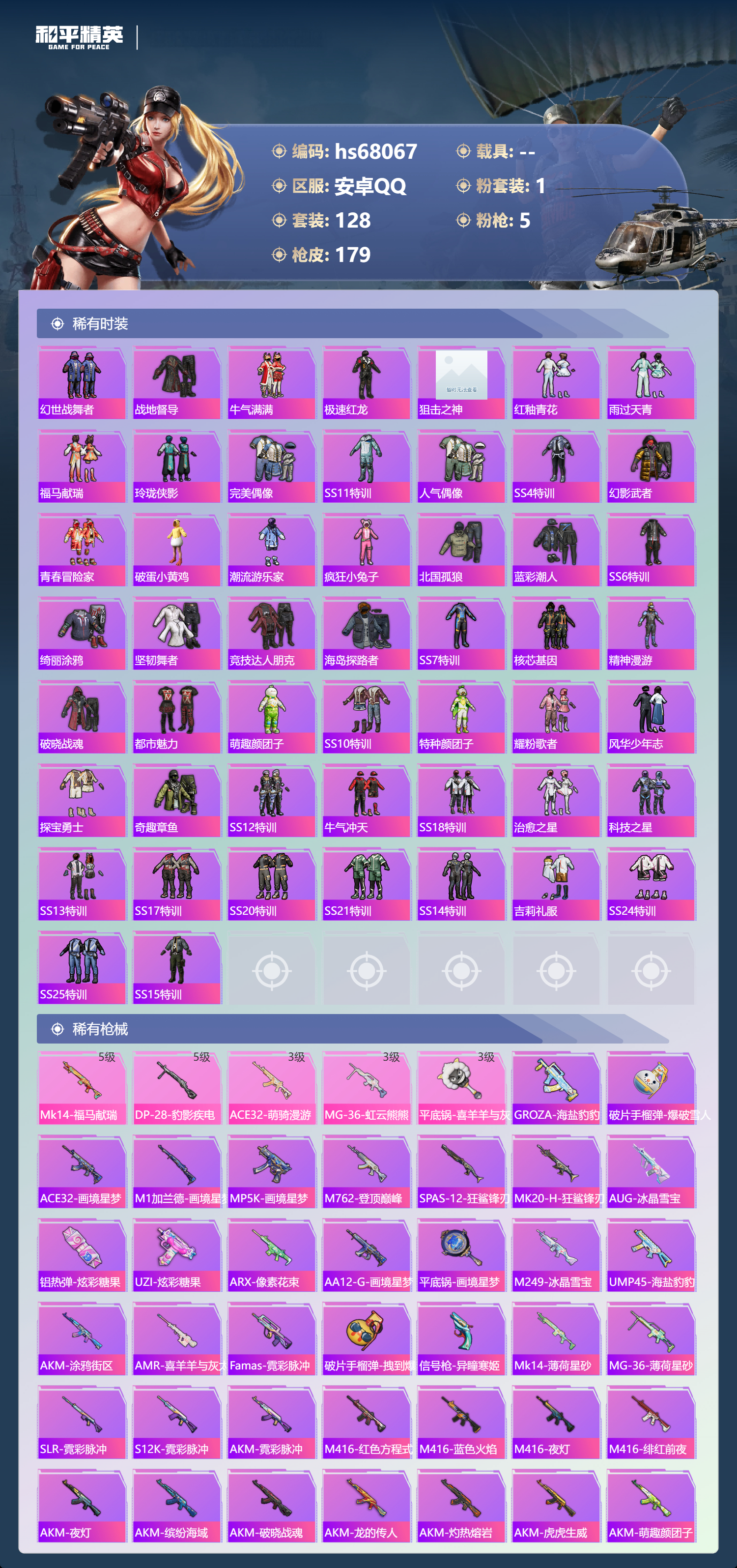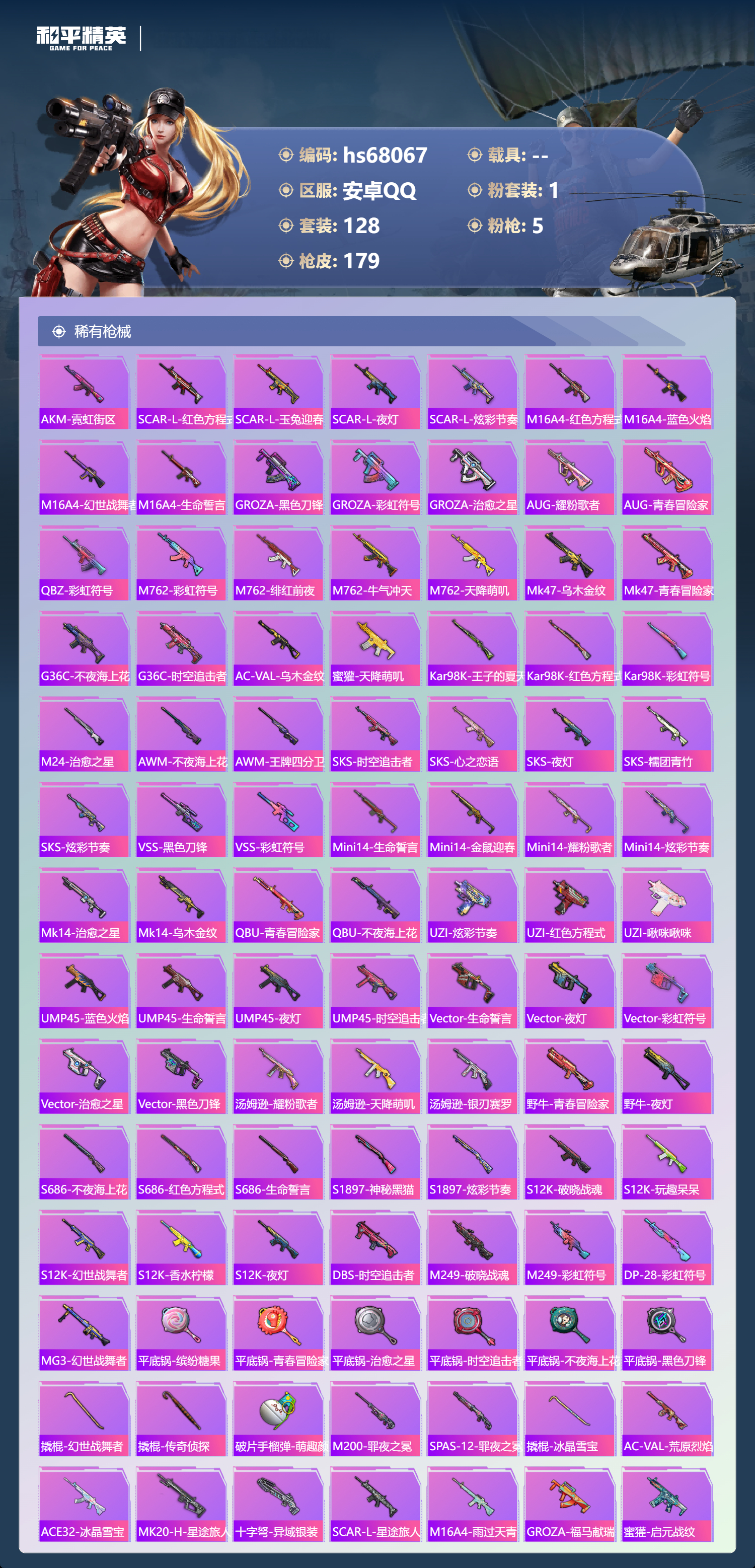 【179稀有枪械】Mk14-福马献瑞/5级,DP-28-豹影疾电/5级,ACE32-萌骑漫游/3级,MG-36-虹云熊熊/3级,平底锅-喜羊羊与灰太狼/3级,GROZA-海盐豹豹,Win94-乌木金纹,MK12-乌木金纹,破片手榴弹-爆破雪人,ACE32-画境星梦,M1加兰德-画境星梦,MP5K-画境星梦,M762-登顶巅峰,SPAS-12-狂鲨锋刃,MK20-H-狂鲨锋刃,AUG-冰晶雪宝,铝热弹-炫彩糖果,UZI-炫彩糖果,ARX-像素花束,AA12-G-画境星梦,平底锅-画境星梦,M249-冰晶雪宝,UMP45-海盐豹豹,AKS-74U-乌木金纹,AKM-涂鸦街区,AMR-喜羊羊与灰太狼,Famas-霓彩脉冲,破片手榴弹-拽到爆炸,信号枪-异瞳寒姬,Mk14-薄荷星砂,MG-36-薄荷星砂,SLR-霓彩脉冲,S12K-霓彩脉冲,AKM-霓彩脉冲,M416-红色方程式,M416-乌木金纹,M416-蓝色火焰,M416-夜灯,M416-绯红前夜,AKM-夜灯,AKM-乌木金纹,AKM-缤纷海域,AKM-破晓战魂,AKM-龙的传人,AKM-灼热熔岩,AKM-虎虎生威,AKM-萌趣颜团子,AKM-霓虹街区,SCAR-L-红色方程式,SCAR-L-玉兔迎春,SCAR-L-乌木金纹,SCAR-L-夜灯,SCAR-L-炫彩节奏,M16A4-红色方程式,M16A4-蓝色火焰,M16A4-幻世战舞者,M16A4-乌木金纹,M16A4-生命誓言,GROZA-乌木金纹,GROZA-黑色刀锋,GROZA-彩虹符号,GROZA-治愈之星,AUG-乌木金纹,AUG-耀粉歌者,AUG-青春冒险家,QBZ-乌木金纹,QBZ-彩虹符号,M762-乌木金纹,M762-彩虹符号,M762-绯红前夜,M762-牛气冲天,M762-天降萌叽,Mk47-乌木金纹,Mk47-青春冒险家,G36C-不夜海上花,G36C-乌木金纹,G36C-时空追击者,AC-VAL-乌木金纹,蜜獾-天降萌叽,Kar98K-乌木金纹,Kar98K-王子的夏天,Kar98K-红色方程式,Kar98K-彩虹符号,M24-治愈之星,AWM-乌木金纹,AWM-不夜海上花,AWM-王牌四分卫,SKS-时空追击者,SKS-乌木金纹,SKS-心之恋语,SKS-夜灯,SKS-糯团青竹,SKS-炫彩节奏,VSS-乌木金纹,VSS-黑色刀锋,VSS-彩虹符号,Mini14-生命誓言,Mini14-金鼠迎春,Mini14-耀粉歌者,Mini14-乌木金纹,Mini14-炫彩节奏,Mk14-治愈之星,Mk14-乌木金纹,QBU-青春冒险家,QBU-不夜海上花,UZI-炫彩节奏,UZI-乌木金纹,UZI-红色方程式,UZI-啾咪啾咪,UMP45-蓝色火焰,UMP45-生命誓言,UMP45-乌木金纹,UMP45-夜灯,UMP45-时空追击者,Vector-乌木金纹,Vector-生命誓言,Vector-夜灯,Vector-彩虹符号,Vector-治愈之星,Vector-黑色刀锋,汤姆逊-耀粉歌者,汤姆逊-天降萌叽,汤姆逊-乌木金纹,汤姆逊-银刃赛罗,野牛-乌木金纹,野牛-青春冒险家,野牛-夜灯,MP5K-乌木金纹,P90-乌木金纹,S686-不夜海上花,S686-乌木金纹,S686-红色方程式,S686-生命誓言,S1897-神秘黑猫,S1897-乌木金纹,S1897-炫彩节奏,S12K-破晓战魂,S12K-玩趣呆呆,S12K-幻世战舞者,S12K-乌木金纹,S12K-香水柠檬,S12K-夜灯,DBS-时空追击者,M249-破晓战魂,M249-彩虹符号,M249-乌木金纹,DP-28-彩虹符号,DP-28-乌木金纹,MG3-幻世战舞者,平底锅-缤纷糖果,平底锅-青春冒险家,平底锅-治愈之星,平底锅-时空追击者,平底锅-不夜海上花,平底锅-黑色刀锋,撬棍-幻世战舞者,撬棍-传奇侦探,破片手榴弹-萌趣颜团子,M200-罪夜之冕,SPAS-12-罪夜之冕,撬棍-冰晶雪宝,AC-VAL-荒原烈焰,ACE32-冰晶雪宝,MK20-H-星途旅人,十字弩-异域银装,SCAR-L-星途旅人,SPAS-12-乌木金纹,M16A4-雨过天青,GROZA-福马献瑞,蜜獾-启元战纹,AMR-雨过天青,SLR-乌木金纹,AA12-G-雨过天青,PKM-雨过天青,沙漠之鹰-雨过天青,燃烧瓶-福马献瑞,VSS-香桃花海,蝎式手枪-虹云熊熊,汤姆逊-像素花束