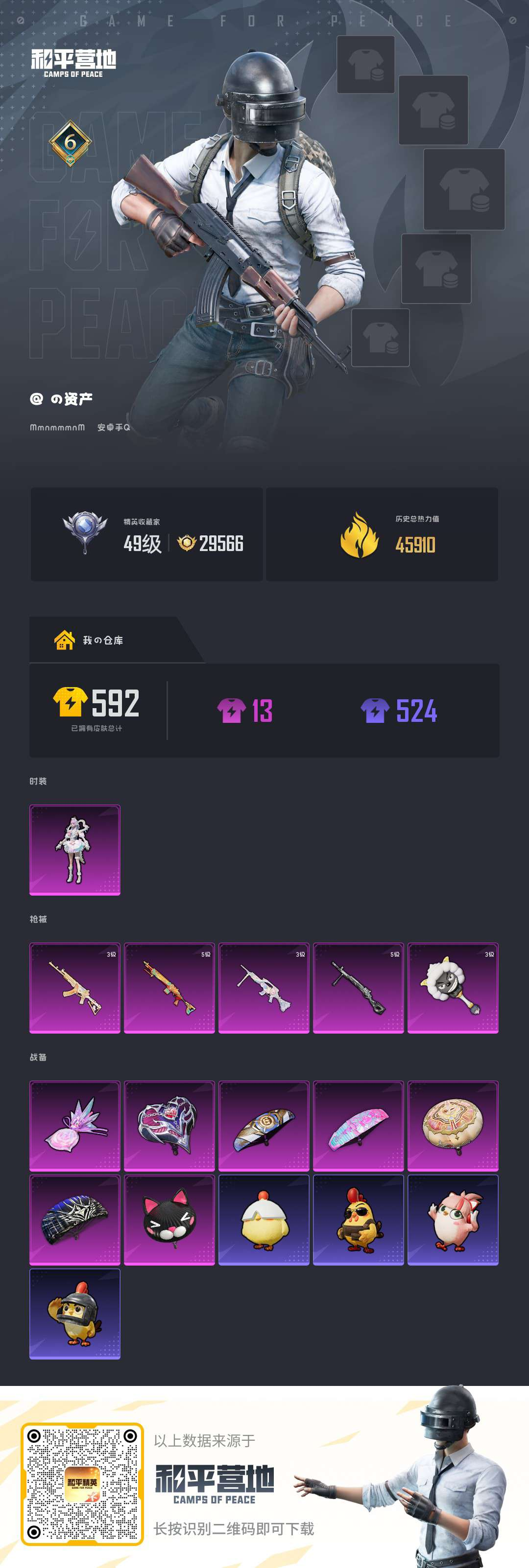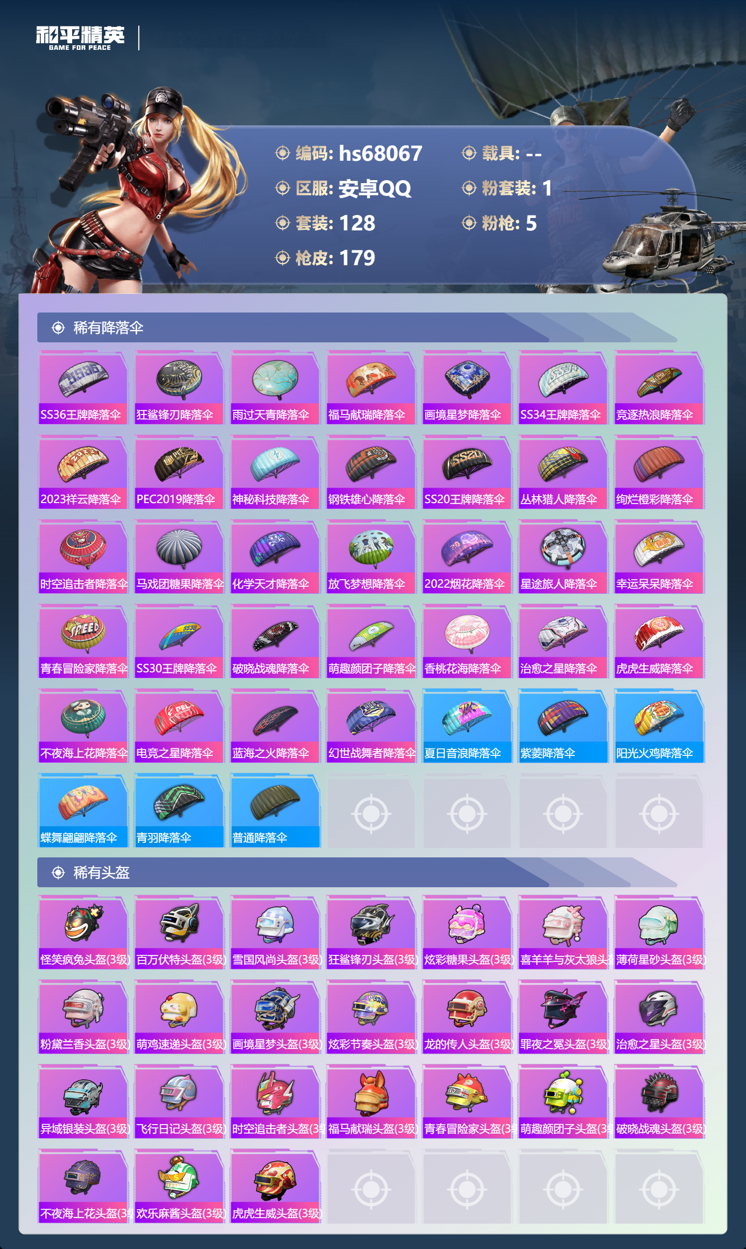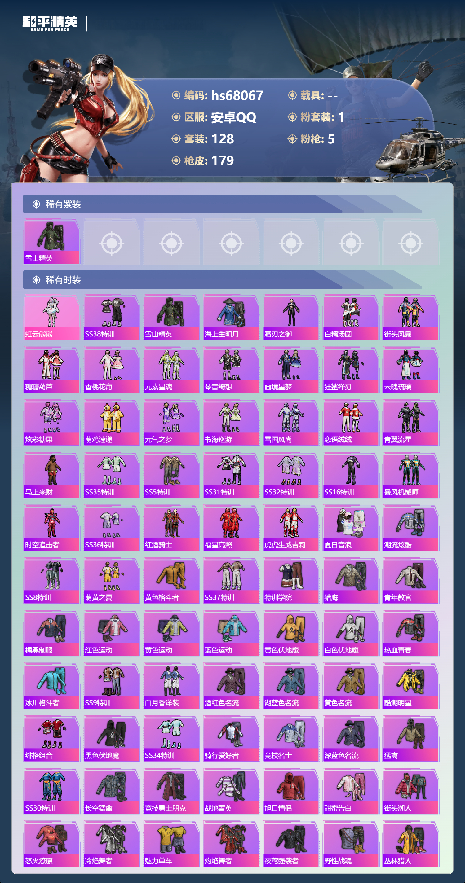 【179稀有枪械】Mk14-福马献瑞/5级,DP-28-豹影疾电/5级,ACE32-萌骑漫游/3级,MG-36-虹云熊熊/3级,平底锅-喜羊羊与灰太狼/3级,GROZA-海盐豹豹,Win94-乌木金纹,MK12-乌木金纹,破片手榴弹-爆破雪人,ACE32-画境星梦,M1加兰德-画境星梦,MP5K-画境星梦,M762-登顶巅峰,SPAS-12-狂鲨锋刃,MK20-H-狂鲨锋刃,AUG-冰晶雪宝,铝热弹-炫彩糖果,UZI-炫彩糖果,ARX-像素花束,AA12-G-画境星梦,平底锅-画境星梦,M249-冰晶雪宝,UMP45-海盐豹豹,AKS-74U-乌木金纹,AKM-涂鸦街区,AMR-喜羊羊与灰太狼,Famas-霓彩脉冲,破片手榴弹-拽到爆炸,信号枪-异瞳寒姬,Mk14-薄荷星砂,MG-36-薄荷星砂,SLR-霓彩脉冲,S12K-霓彩脉冲,AKM-霓彩脉冲,M416-红色方程式,M416-乌木金纹,M416-蓝色火焰,M416-夜灯,M416-绯红前夜,AKM-夜灯,AKM-乌木金纹,AKM-缤纷海域,AKM-破晓战魂,AKM-龙的传人,AKM-灼热熔岩,AKM-虎虎生威,AKM-萌趣颜团子,AKM-霓虹街区,SCAR-L-红色方程式,SCAR-L-玉兔迎春,SCAR-L-乌木金纹,SCAR-L-夜灯,SCAR-L-炫彩节奏,M16A4-红色方程式,M16A4-蓝色火焰,M16A4-幻世战舞者,M16A4-乌木金纹,M16A4-生命誓言,GROZA-乌木金纹,GROZA-黑色刀锋,GROZA-彩虹符号,GROZA-治愈之星,AUG-乌木金纹,AUG-耀粉歌者,AUG-青春冒险家,QBZ-乌木金纹,QBZ-彩虹符号,M762-乌木金纹,M762-彩虹符号,M762-绯红前夜,M762-牛气冲天,M762-天降萌叽,Mk47-乌木金纹,Mk47-青春冒险家,G36C-不夜海上花,G36C-乌木金纹,G36C-时空追击者,AC-VAL-乌木金纹,蜜獾-天降萌叽,Kar98K-乌木金纹,Kar98K-王子的夏天,Kar98K-红色方程式,Kar98K-彩虹符号,M24-治愈之星,AWM-乌木金纹,AWM-不夜海上花,AWM-王牌四分卫,SKS-时空追击者,SKS-乌木金纹,SKS-心之恋语,SKS-夜灯,SKS-糯团青竹,SKS-炫彩节奏,VSS-乌木金纹,VSS-黑色刀锋,VSS-彩虹符号,Mini14-生命誓言,Mini14-金鼠迎春,Mini14-耀粉歌者,Mini14-乌木金纹,Mini14-炫彩节奏,Mk14-治愈之星,Mk14-乌木金纹,QBU-青春冒险家,QBU-不夜海上花,UZI-炫彩节奏,UZI-乌木金纹,UZI-红色方程式,UZI-啾咪啾咪,UMP45-蓝色火焰,UMP45-生命誓言,UMP45-乌木金纹,UMP45-夜灯,UMP45-时空追击者,Vector-乌木金纹,Vector-生命誓言,Vector-夜灯,Vector-彩虹符号,Vector-治愈之星,Vector-黑色刀锋,汤姆逊-耀粉歌者,汤姆逊-天降萌叽,汤姆逊-乌木金纹,汤姆逊-银刃赛罗,野牛-乌木金纹,野牛-青春冒险家,野牛-夜灯,MP5K-乌木金纹,P90-乌木金纹,S686-不夜海上花,S686-乌木金纹,S686-红色方程式,S686-生命誓言,S1897-神秘黑猫,S1897-乌木金纹,S1897-炫彩节奏,S12K-破晓战魂,S12K-玩趣呆呆,S12K-幻世战舞者,S12K-乌木金纹,S12K-香水柠檬,S12K-夜灯,DBS-时空追击者,M249-破晓战魂,M249-彩虹符号,M249-乌木金纹,DP-28-彩虹符号,DP-28-乌木金纹,MG3-幻世战舞者,平底锅-缤纷糖果,平底锅-青春冒险家,平底锅-治愈之星,平底锅-时空追击者,平底锅-不夜海上花,平底锅-黑色刀锋,撬棍-幻世战舞者,撬棍-传奇侦探,破片手榴弹-萌趣颜团子,M200-罪夜之冕,SPAS-12-罪夜之冕,撬棍-冰晶雪宝,AC-VAL-荒原烈焰,ACE32-冰晶雪宝,MK20-H-星途旅人,十字弩-异域银装,SCAR-L-星途旅人,SPAS-12-乌木金纹,M16A4-雨过天青,GROZA-福马献瑞,蜜獾-启元战纹,AMR-雨过天青,SLR-乌木金纹,AA12-G-雨过天青,PKM-雨过天青,沙漠之鹰-雨过天青,燃烧瓶-福马献瑞,VSS-香桃花海,蝎式手枪-虹云熊熊,汤姆逊-像素花束