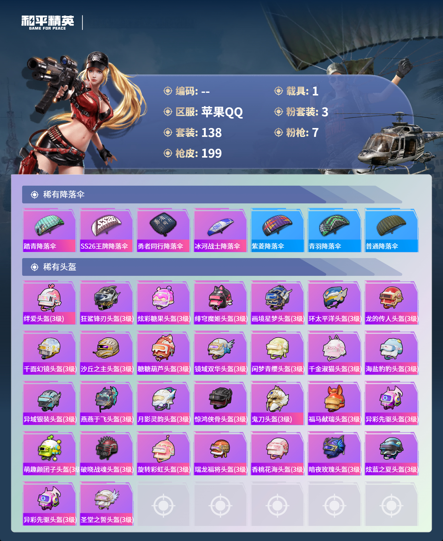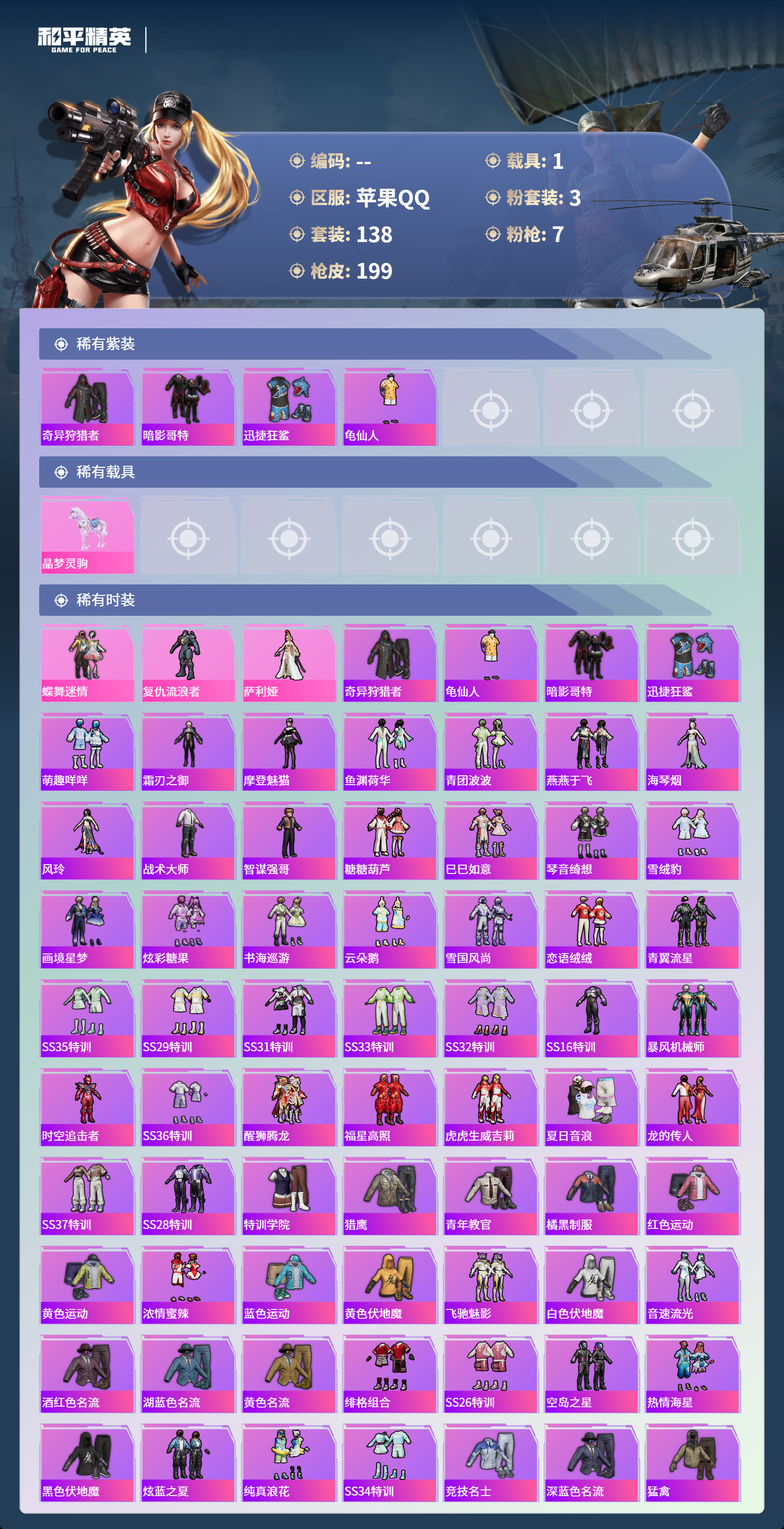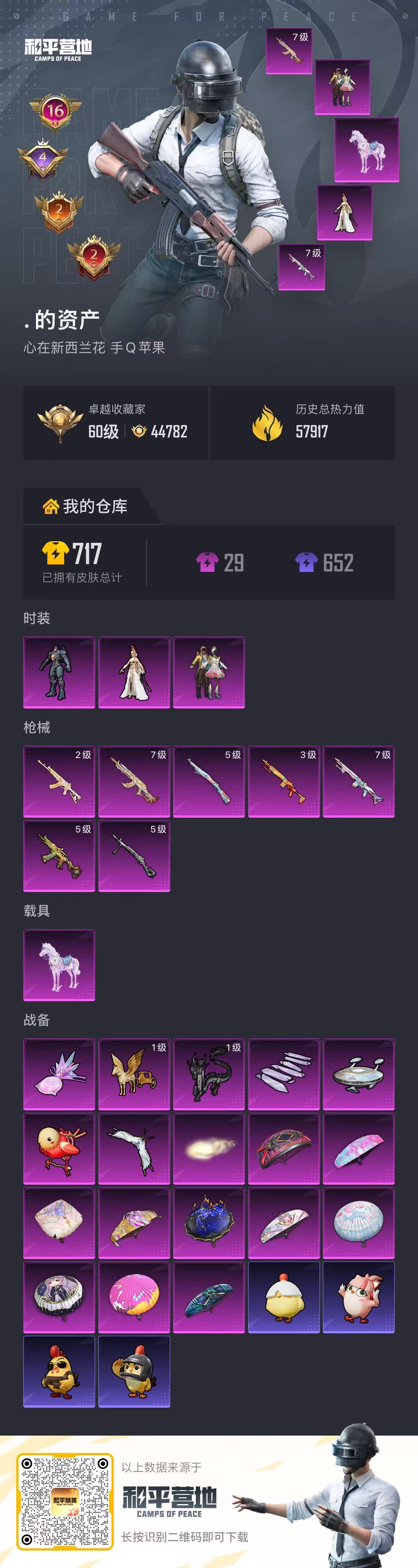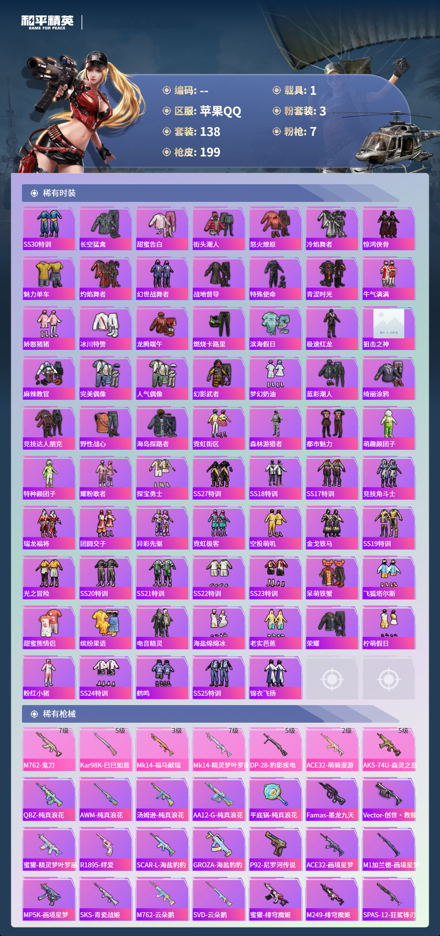 PX_2550098-苹果手Q-16王牌印记-3粉装-7特效枪-1载具-57917热力值-138套装-199枪皮-4卓越印记-2传奇印记