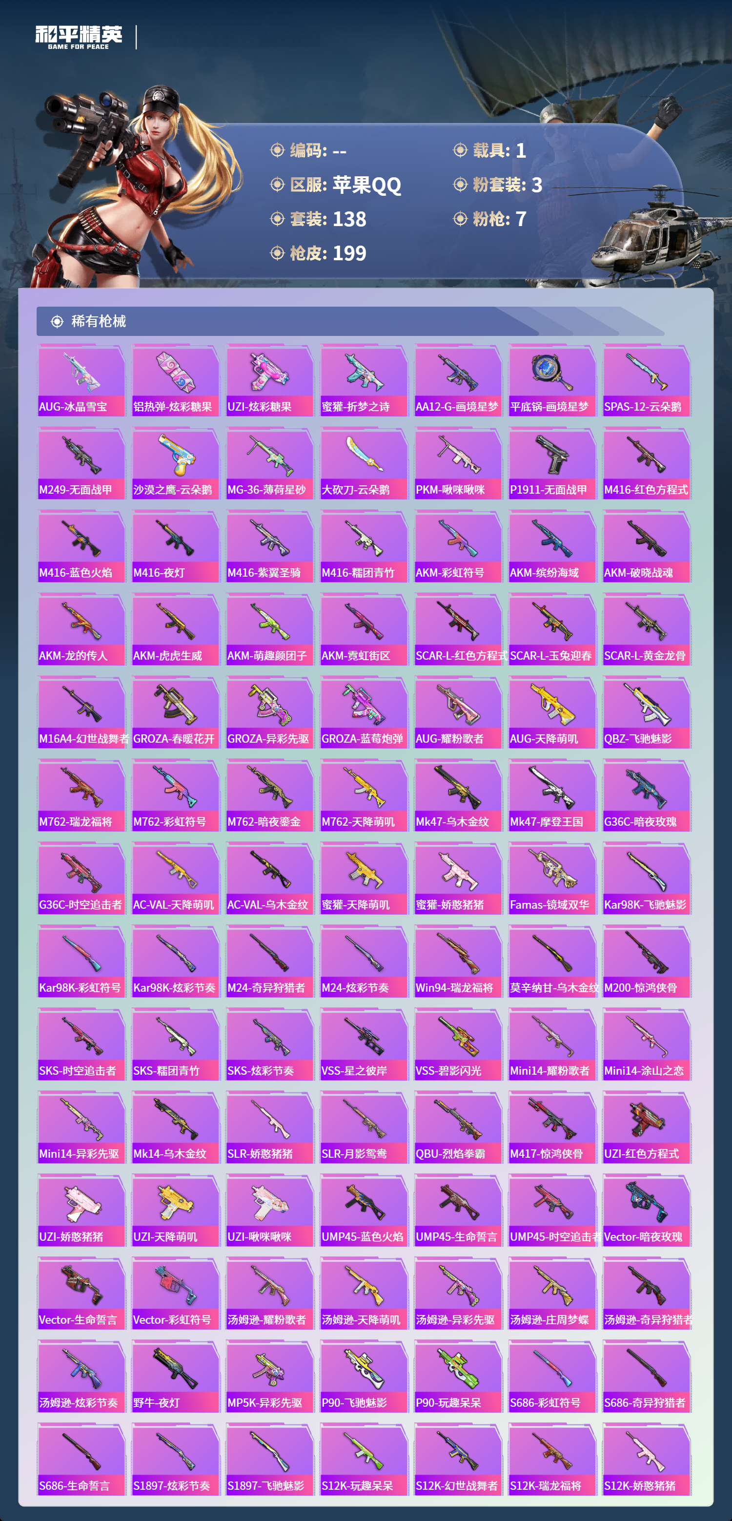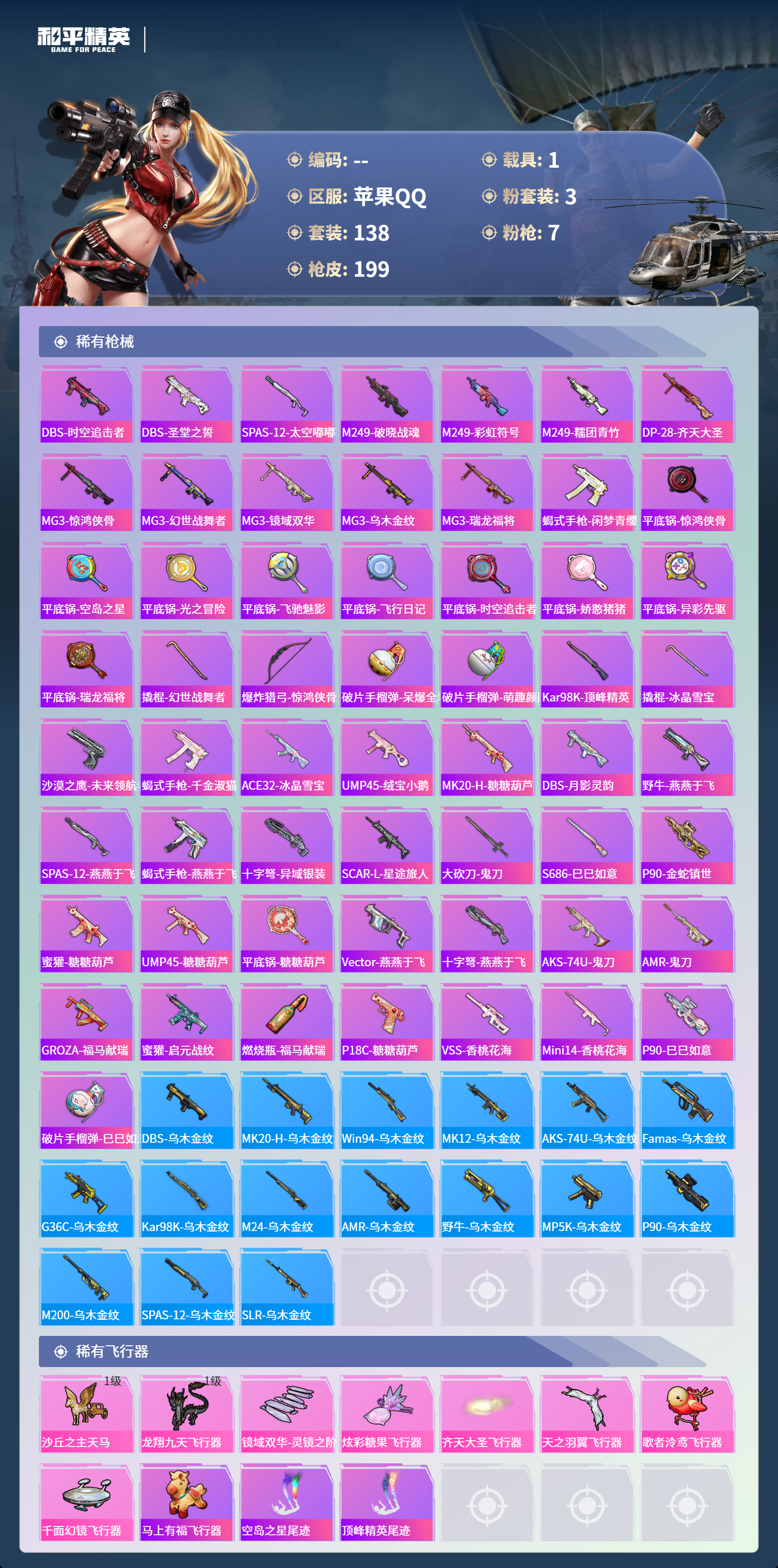 【199稀有枪械】M762-鬼刀/7级,Kar98K-巳巳如意/5级,Mk14-福马献瑞/3级,Mk14-精灵梦叶罗丽/7级,DP-28-豹影疾电/5级,ACE32-萌骑漫游/2级,AKS-74U-森灵之息/5级,QBZ-纯真浪花,AWM-纯真浪花,汤姆逊-纯真浪花,DBS-乌木金纹,AA12-G-纯真浪花,平底锅-纯真浪花,Famas-墨龙九天,Vector-创世·救赎,蜜獾-精灵梦叶罗丽,R1895-绊爱,SCAR-L-海盐豹豹,GROZA-海盐豹豹,P92-尼罗河传说,MK20-H-乌木金纹,Win94-乌木金纹,MK12-乌木金纹,ACE32-画境星梦,M1加兰德-画境星梦,MP5K-画境星梦,SKS-青瓷战姬,M762-云朵鹅,SVD-云朵鹅,蜜獾-绯穹魔姬,M249-绯穹魔姬,SPAS-12-狂鲨锋刃,AUG-冰晶雪宝,铝热弹-炫彩糖果,UZI-炫彩糖果,蜜獾-折梦之诗,AA12-G-画境星梦,平底锅-画境星梦,AKS-74U-乌木金纹,Famas-乌木金纹,SPAS-12-云朵鹅,M249-无面战甲,沙漠之鹰-云朵鹅,MG-36-薄荷星砂,大砍刀-云朵鹅,PKM-啾咪啾咪,P1911-无面战甲,M416-红色方程式,M416-蓝色火焰,M416-夜灯,M416-紫翼圣骑,M416-糯团青竹,AKM-彩虹符号,AKM-缤纷海域,AKM-破晓战魂,AKM-龙的传人,AKM-虎虎生威,AKM-萌趣颜团子,AKM-霓虹街区,SCAR-L-红色方程式,SCAR-L-玉兔迎春,SCAR-L-黄金龙骨,M16A4-幻世战舞者,GROZA-春暖花开,GROZA-异彩先驱,GROZA-蓝莓炮弹,AUG-耀粉歌者,AUG-天降萌叽,QBZ-飞驰魅影,M762-瑞龙福将,M762-彩虹符号,M762-暗夜鎏金,M762-天降萌叽,Mk47-乌木金纹,Mk47-摩登王国,G36C-乌木金纹,G36C-暗夜玫瑰,G36C-时空追击者,AC-VAL-天降萌叽,AC-VAL-乌木金纹,蜜獾-天降萌叽,蜜獾-娇憨猪猪,Famas-镜域双华,Kar98K-乌木金纹,Kar98K-飞驰魅影,Kar98K-彩虹符号,Kar98K-炫彩节奏,M24-乌木金纹,M24-奇异狩猎者,M24-炫彩节奏,Win94-瑞龙福将,莫辛纳甘-乌木金纹,AMR-乌木金纹,M200-惊鸿侠骨,SKS-时空追击者,SKS-糯团青竹,SKS-炫彩节奏,VSS-星之彼岸,VSS-碧影闪光,Mini14-耀粉歌者,Mini14-涂山之恋,Mini14-异彩先驱,Mk14-乌木金纹,SLR-娇憨猪猪,SLR-月影鸳鸯,QBU-烈焰拳霸,M417-惊鸿侠骨,UZI-红色方程式,UZI-娇憨猪猪,UZI-天降萌叽,UZI-啾咪啾咪,UMP45-蓝色火焰,UMP45-生命誓言,UMP45-时空追击者,Vector-暗夜玫瑰,Vector-生命誓言,Vector-彩虹符号,汤姆逊-耀粉歌者,汤姆逊-天降萌叽,汤姆逊-异彩先驱,汤姆逊-庄周梦蝶,汤姆逊-奇异狩猎者,汤姆逊-炫彩节奏,野牛-乌木金纹,野牛-夜灯,MP5K-异彩先驱,MP5K-乌木金纹,P90-乌木金纹,P90-飞驰魅影,P90-玩趣呆呆,S686-彩虹符号,S686-奇异狩猎者,S686-生命誓言,S1897-炫彩节奏,S1897-飞驰魅影,S12K-玩趣呆呆,S12K-幻世战舞者,S12K-瑞龙福将,S12K-娇憨猪猪,DBS-时空追击者,DBS-圣堂之誓,SPAS-12-太空嘟嘟,M249-破晓战魂,M249-彩虹符号,M249-糯团青竹,DP-28-齐天大圣,MG3-惊鸿侠骨,MG3-幻世战舞者,MG3-镜域双华,MG3-乌木金纹,MG3-瑞龙福将,蝎式手枪-闲梦青缨,平底锅-惊鸿侠骨,平底锅-空岛之星,平底锅-光之冒险,平底锅-飞驰魅影,平底锅-飞行日记,平底锅-时空追击者,平底锅-娇憨猪猪,平底锅-异彩先驱,平底锅-瑞龙福将,撬棍-幻世战舞者,爆炸猎弓-惊鸿侠骨,破片手榴弹-呆爆全场,破片手榴弹-萌趣颜团子,Kar98K-顶峰精英,撬棍-冰晶雪宝,沙漠之鹰-未来领航者,蝎式手枪-千金淑猫,ACE32-冰晶雪宝,UMP45-绒宝小鹅,MK20-H-糖糖葫芦,DBS-月影灵韵,野牛-燕燕于飞,M200-乌木金纹,SPAS-12-燕燕于飞,蝎式手枪-燕燕于飞,十字弩-异域银装,SCAR-L-星途旅人,大砍刀-鬼刀,S686-巳巳如意,P90-金蛇镇世,蜜獾-糖糖葫芦,UMP45-糖糖葫芦,SPAS-12-乌木金纹,平底锅-糖糖葫芦,Vector-燕燕于飞,十字弩-燕燕于飞,AKS-74U-鬼刀,AMR-鬼刀,GROZA-福马献瑞,蜜獾-启元战纹,SLR-乌木金纹,燃烧瓶-福马献瑞,P18C-糖糖葫芦,VSS-香桃花海,Mini14-香桃花海,P90-巳巳如意,破片手榴弹-巳巳如意