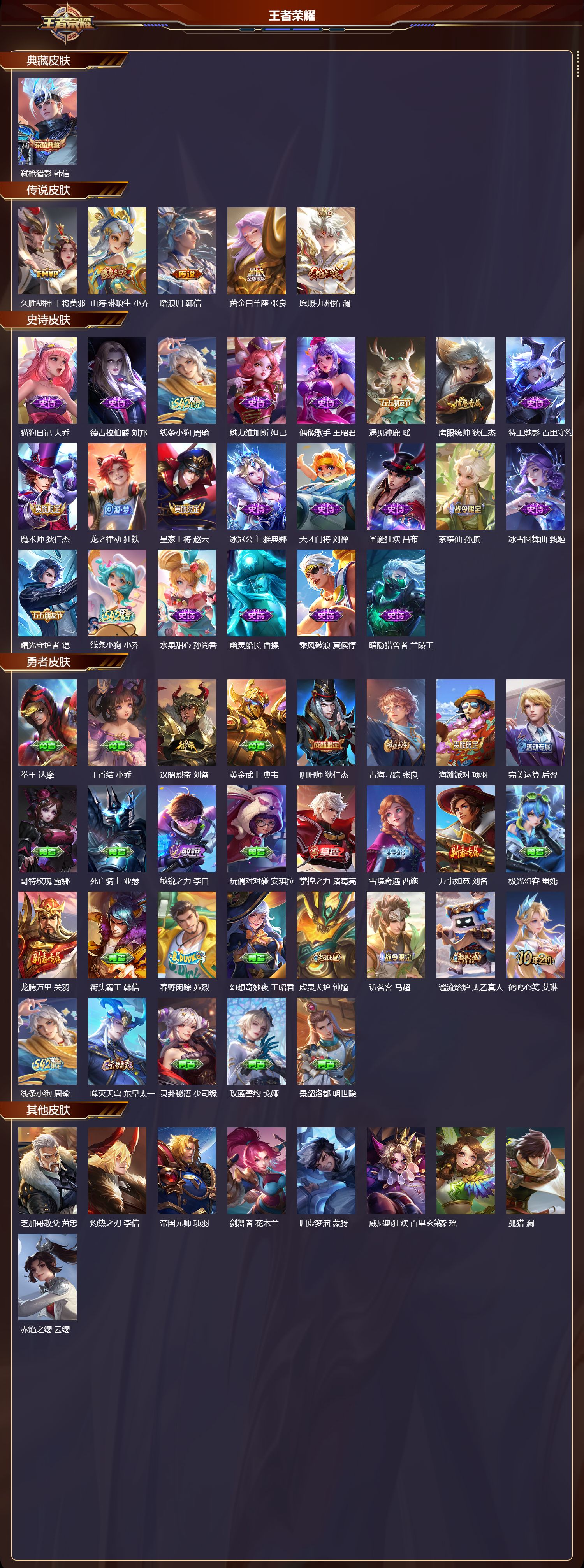【29,勇者皮肤】拳王,达摩,丁香结,小乔,汉昭烈帝,刘备,黄金武士,典韦,阴阳师,狄仁杰,古海寻踪,张良,海滩派对,项羽,完美运算,后羿,哥特玫瑰,露娜,死亡骑士,亚瑟,敏锐之力,李白,玩偶对对碰,安琪拉,掌控之力,诸葛亮,雪境奇遇,西施,万事如意,刘备,极光幻客,蚩奼,龙腾万里,关羽,街头霸王,韩信,春野闲踪,苏烈,幻想奇妙夜,王昭君,虚灵犬护,钟馗,访茗客,马超,谧流熔炉,太乙真人,鹤鸣心笺,艾琳,线条小狗,周瑜,噬灭天穹,东皇太一,灵卦秘语,少司缘,玫蓝誓约,戈娅,景韶洛都,明世隐,