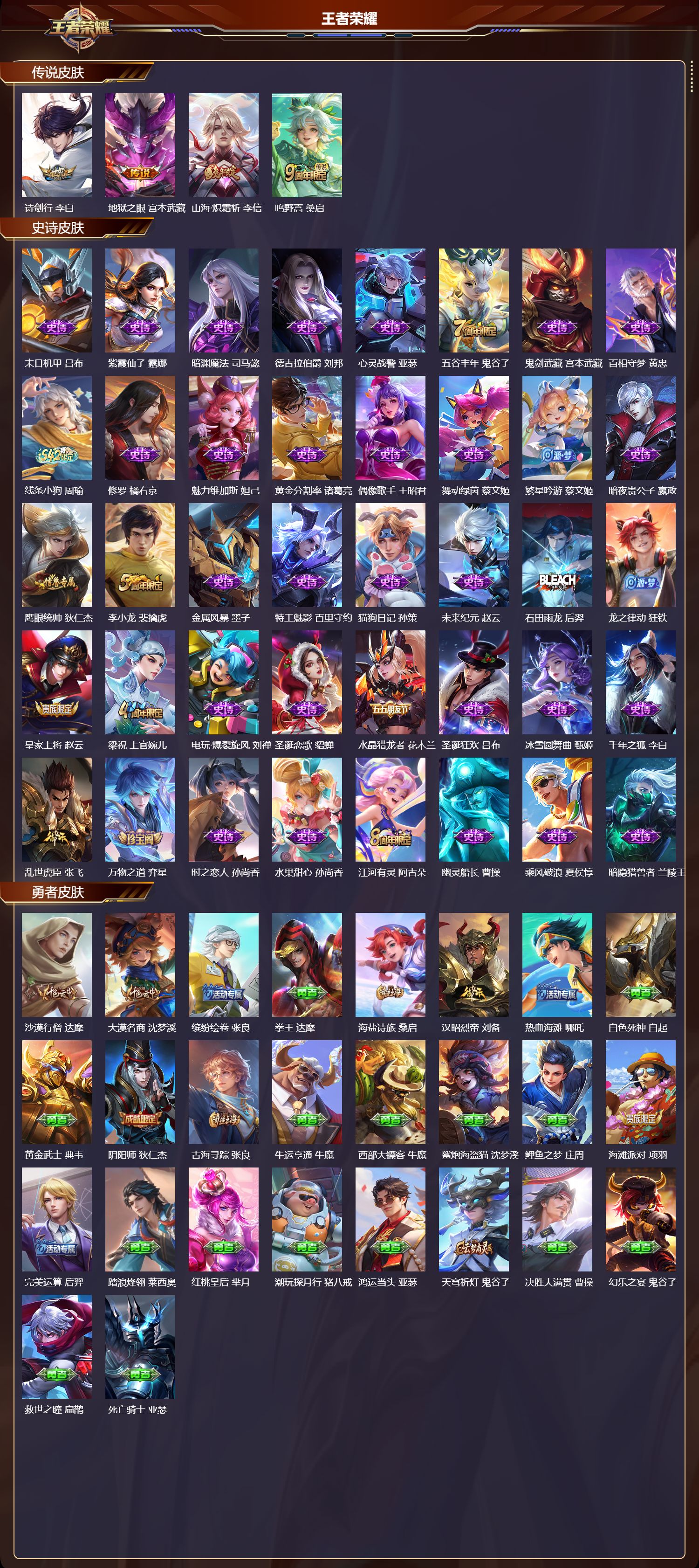 【40,史诗皮肤】末日机甲,吕布,紫霞仙子,露娜,暗渊魔法,司马懿,德古拉伯爵,刘邦,心灵战警,亚瑟,五谷丰年,鬼谷子,鬼剑武藏,宫本武藏,百相守梦,黄忠,线条小狗,周瑜,修罗,橘右京,魅力维加斯,妲己,黄金分割率,诸葛亮,偶像歌手,王昭君,舞动绿茵,蔡文姬,繁星吟游,蔡文姬,暗夜贵公子,嬴政,鹰眼统帅,狄仁杰,李小龙,裴擒虎,金属风暴,墨子,特工魅影,百里守约,猫狗日记,孙策,未来纪元,赵云,石田雨龙,后羿,龙之律动,狂铁,皇家上将,赵云,梁祝,上官婉儿,电玩·爆裂旋风,刘禅,圣诞恋歌,貂蝉,水晶猎龙者,花木兰,圣诞狂欢,吕布,冰雪圆舞曲,甄姬,千年之狐,李白,乱世虎臣,张飞,万物之道,弈星,时之恋人,孙尚香,水果甜心,孙尚香,江河有灵,阿古朵,幽灵船长,曹操,乘风破浪,夏侯惇,暗隐猎兽者,兰陵王,