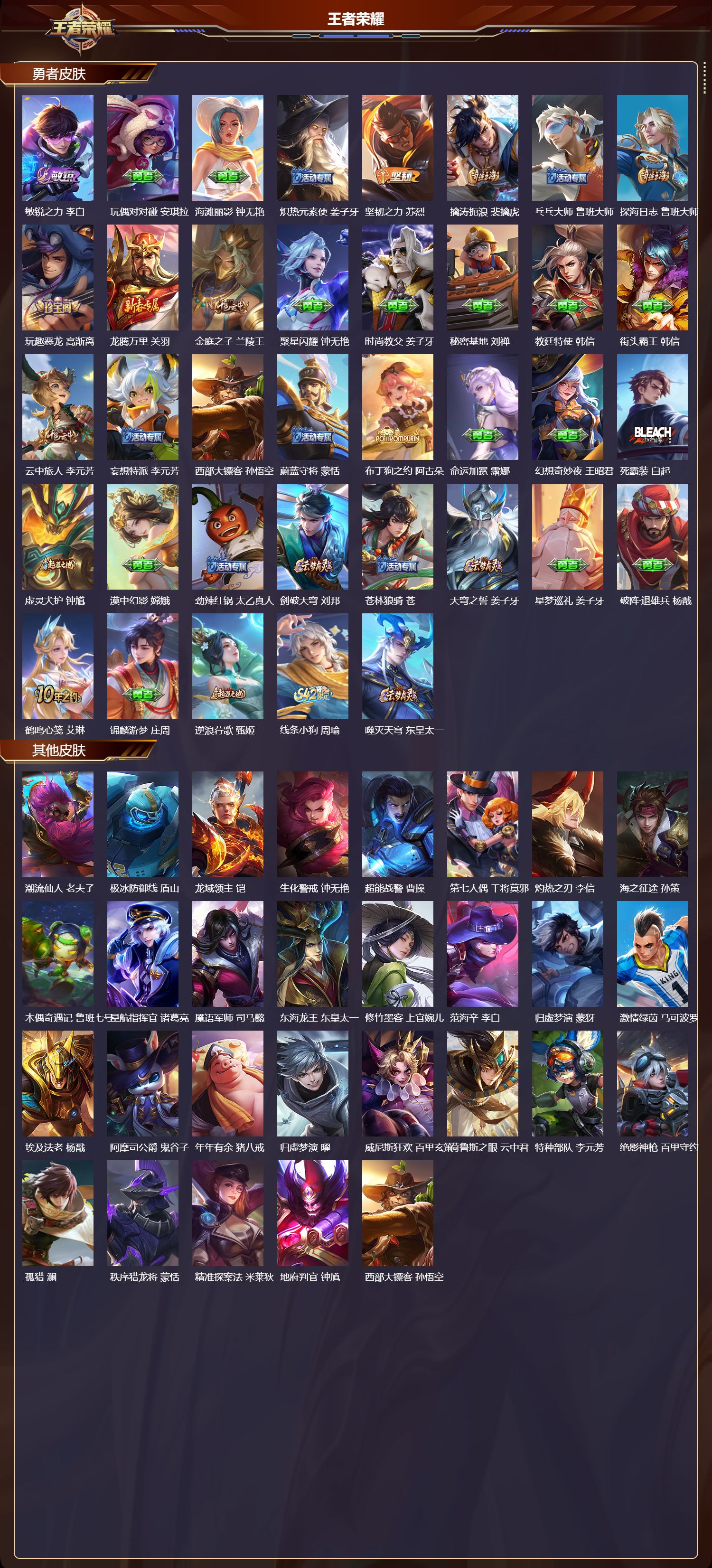 【63,勇者皮肤】沙漠行僧,达摩,大漠名商,沈梦溪,缤纷绘卷,张良,拳王,达摩,海盐诗旅,桑启,汉昭烈帝,刘备,热血海滩,哪吒,白色死神,白起,黄金武士,典韦,阴阳师,狄仁杰,古海寻踪,张良,牛运亨通,牛魔,西部大镖客,牛魔,鲨炮海盗猫,沈梦溪,鲤鱼之梦,庄周,海滩派对,项羽,完美运算,后羿,踏浪烽翎,莱西奥,红桃皇后,芈月,潮玩探月行,猪八戒,鸿运当头,亚瑟,天穹祈灯,鬼谷子,决胜大满贯,曹操,幻乐之宴,鬼谷子,救世之瞳,扁鹊,死亡骑士,亚瑟,敏锐之力,李白,玩偶对对碰,安琪拉,海滩丽影,钟无艳,炽热元素使,姜子牙,坚韧之力,苏烈,擒涛扼浪,裴擒虎,乓乓大师,鲁班大师,探海日志,鲁班大师,玩趣恶龙,高渐离,龙腾万里,关羽,金庭之子,兰陵王,聚星闪耀,钟无艳,时尚教父,姜子牙,秘密基地,刘禅,教廷特使,韩信,街头霸王,韩信,云中旅人,李元芳,妄想特派,李元芳,西部大镖客,孙悟空,蔚蓝守将,蒙恬,布丁狗之约,阿古朵,命运加冕,露娜,幻想奇妙夜,王昭君,死霸装,白起,虚灵犬护,钟馗,漠中幻影,嫦娥,劲辣红锅,太乙真人,剑破天穹,刘邦,苍林狼骑,苍,天穹之誓,姜子牙,星梦巡礼,姜子牙,破阵·退雄兵,杨戬,鹤鸣心笺,艾琳,锦麟游梦,庄周,逆浪荇歌,甄姬,线条小狗,周瑜,噬灭天穹,东皇太一,