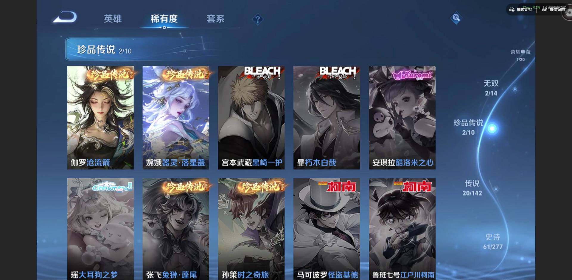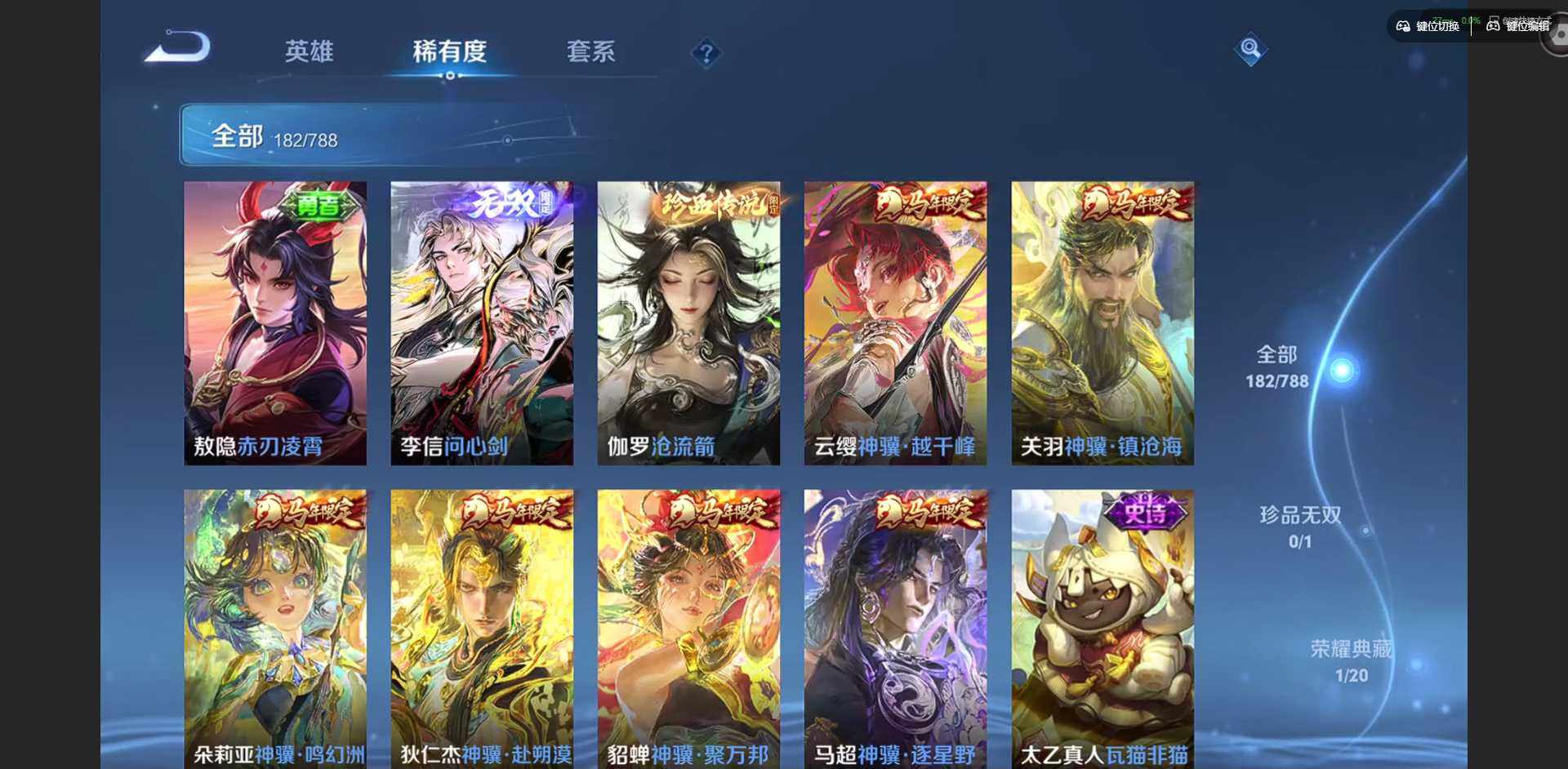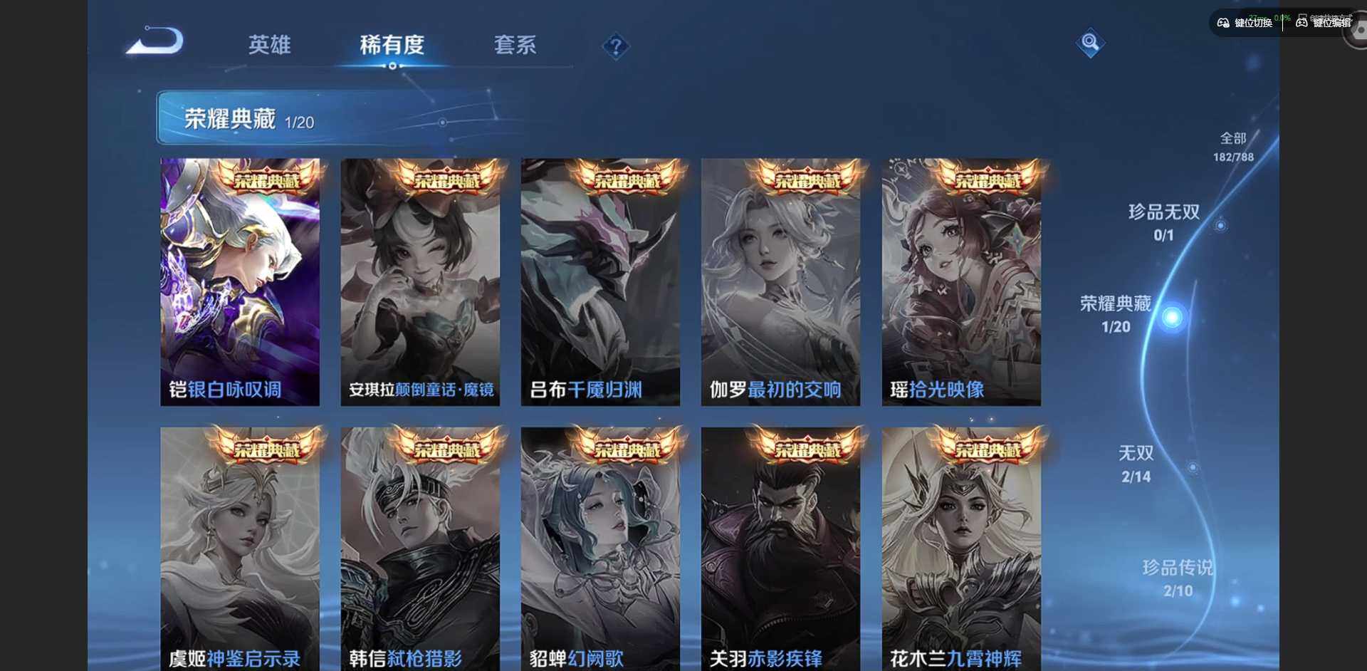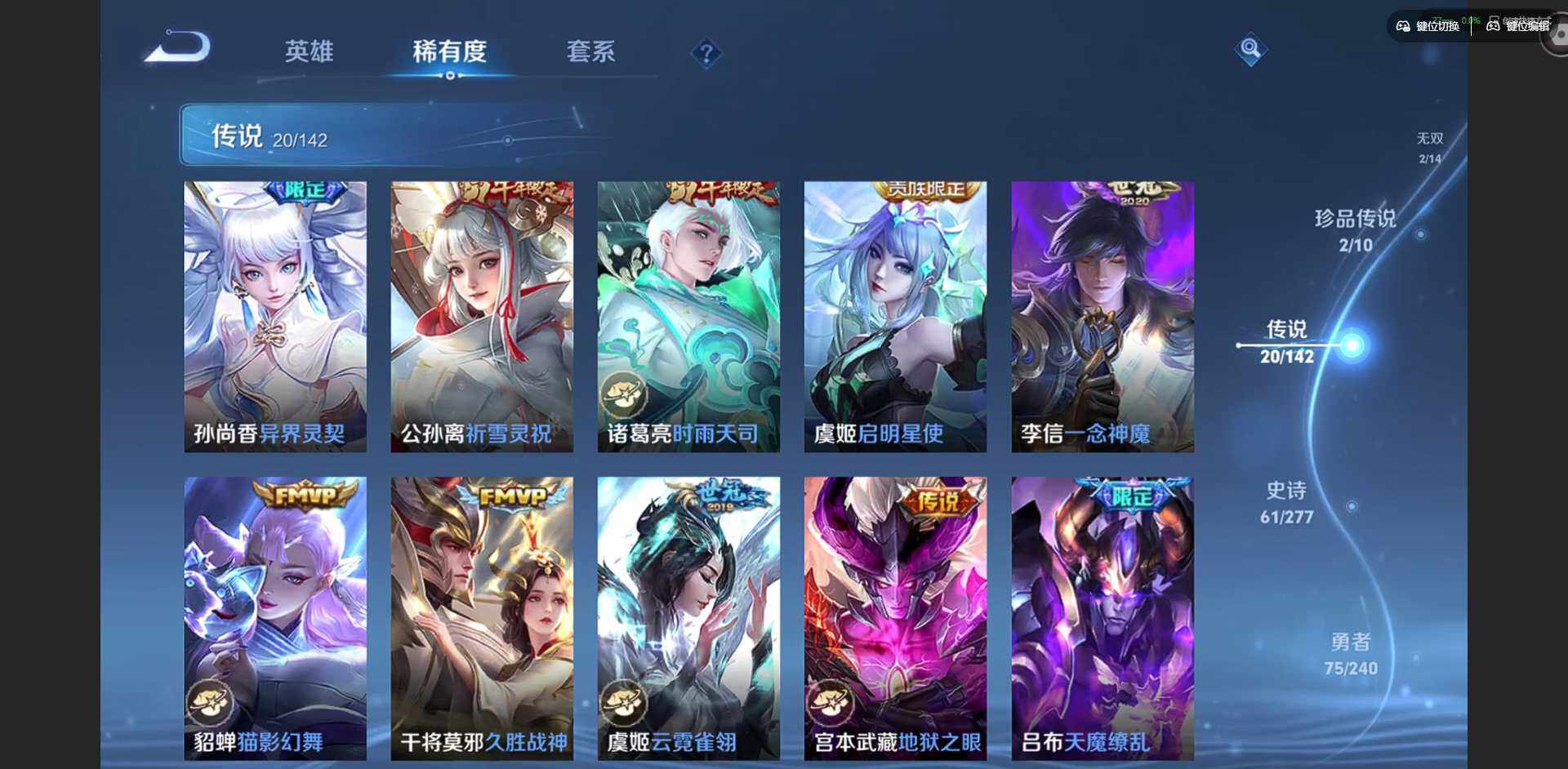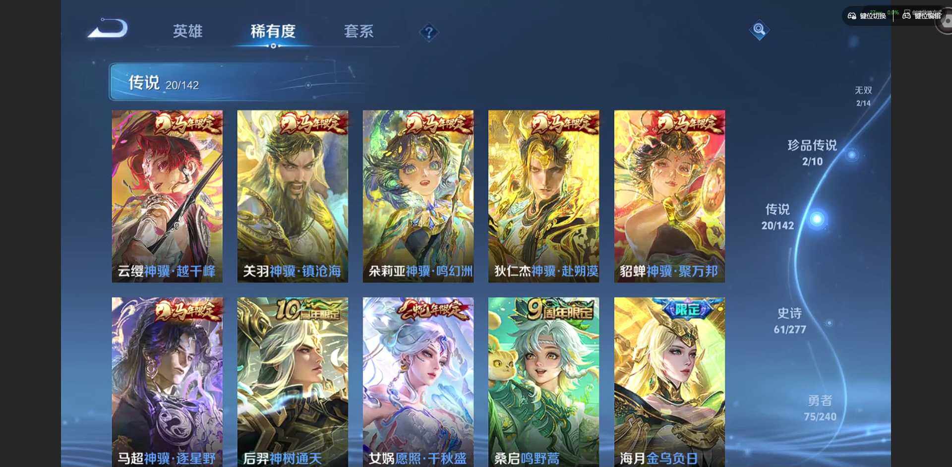 【传说皮肤】:云缨神骥越千峰,关羽神骥镇沧海,朵莉亚神骥鸣幻洲,狄仁杰神骥赴朔漠,貂蝉神骥聚万邦,马超神骥逐星野,后羿神树通天,女娲愿照千秋盛,桑启鸣野蒿,海月金乌负日,孙尚香异界灵契,公孙离祈雪灵祝,诸葛亮时雨天司,虞姬启明星使,李信一念神魔,貂蝉猫影幻舞,干将莫邪久胜战神,虞姬云霓雀翎,宫本武藏地狱之眼,吕布天魔缭乱