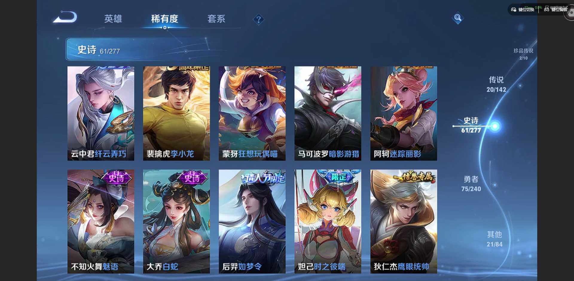 【史诗皮肤】:太乙真人瓦猫非猫,明世隐百晓客,周瑜线条小狗,小乔线条小狗,少司缘巫礼祀神,莱西奥光弋星穹,狂铁龙之律动,阿轲化蝶舞,赵怀真器灵浮梦炉,孙膑茶境仙,百里守约百相守梦,亚连破空之剑,姬小满妄想食味,戈娅驭风魔法,盘古冰霜神祇,钟馗乐园奇幻夜,沈梦溪月团寄思,杨戬天秀启明,花木兰默契交锋,元歌云间偶戏,云中君纤云弄巧,裴擒虎李小龙,蒙犽狂想玩偶喵,马可波罗暗影游猎,阿轲迷踪丽影,不知火舞魅语,大乔白蛇,后羿如梦令,妲己时之彼端,狄仁杰鹰眼统帅,孙策猫狗日记,阿轲节奏热浪,白起星夜王子,刘禅天才门将,蔡文姬舞动绿茵,百里守约特工魅影,安琪拉心灵骇客,亚瑟心灵战警,甄姬游园惊梦,兰陵王暗隐猎兽者,小乔缤纷独角兽,夏侯惇乘风破浪,刘邦德古拉伯爵,花木兰水晶猎龙者,张飞乱世虎臣,李白千年之狐,曹操幽灵船长,吕布圣诞狂欢,墨子金属风暴,妲己女仆咖啡,妲己魅力维加斯,嬴政摇滚巨星,孙尚香蔷薇恋人,宫本武藏鬼剑武藏,廉颇地狱岩魂,狄仁杰魔术师,王昭君偶像歌手,甄姬冰雪圆舞曲,赵云未来纪元,赵云皇家上将,露娜紫霞仙子