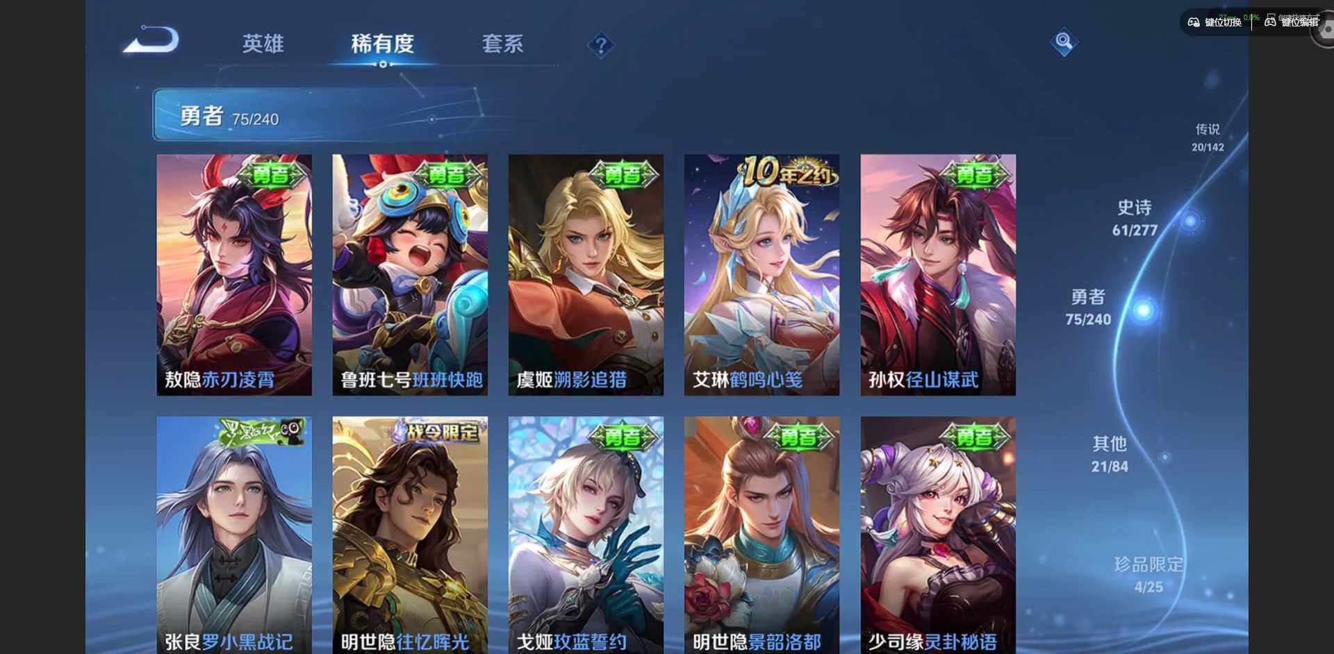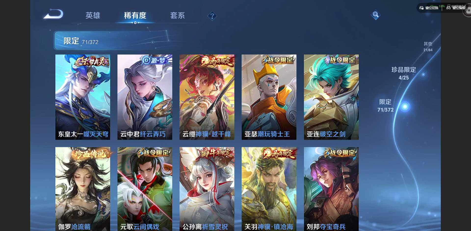 【限定皮肤】:狄仁杰阴阳师,赵云皇家上将,妲己时之彼端,孙尚香蔷薇恋人,孙尚香异界灵契,阿轲迷踪丽影,吕布天魔缭乱,元歌云间偶戏,甄姬游园惊梦,马可波罗暗影游猎,狄仁杰魔术师,狄仁杰万华元夜,项羽海滩派对,老夫子醍醐杖,刘邦夺宝奇兵,花木兰默契交锋,亚瑟潮玩骑士王,后羿如梦令,虞姬启明星使,钟馗驱傩正仪,雅典娜单词大作战,鬼谷子原初探秘者,诸葛亮时雨天司,苏烈千军破阵,弈星混沌棋,公孙离祈雪灵祝,沈梦溪星空之诺,明世隐疑决卦,裴擒虎李小龙,云中君纤云弄巧,猪八戒西部大镖客,西施玲珑珍味,蒙犽狂想玩偶喵,鲁班大师探海日志,盘古冰霜神祇,戈娅驭风魔法,艾琳流音漫舞,张良古海寻踪,鬼谷子天穹祈灯,姬小满妄想食味,海月金乌负日