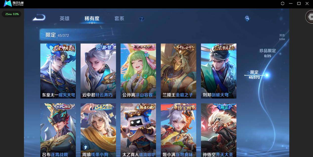 【限定皮肤】:狄仁杰阴阳师,赵云皇家上将,鲁班七号寅虎瑞焰,高渐离玩趣恶龙,狄仁杰魔术师,达摩沙漠行僧,项羽海滩派对,老夫子醍醐杖,兰陵王金庭之子,孙悟空齐天大圣,李元芳云中旅人,沈梦溪大漠名商,明世隐疑决卦,裴擒虎擒涛扼浪,云中君纤云弄巧,曜山海苍雷引,鲁班大师探海日志,桑启海盐诗旅,阿古朵江河有灵,张良古海寻踪,蒙犽百解令,鬼谷子天穹祈灯,姬小满妄想食味,孙策乘龙淬吴钩,赵云乘龙铭钟鼎,百里玄策超元猎域,刘邦剑破天穹,刘备异域游侠,周瑜熔金海岸