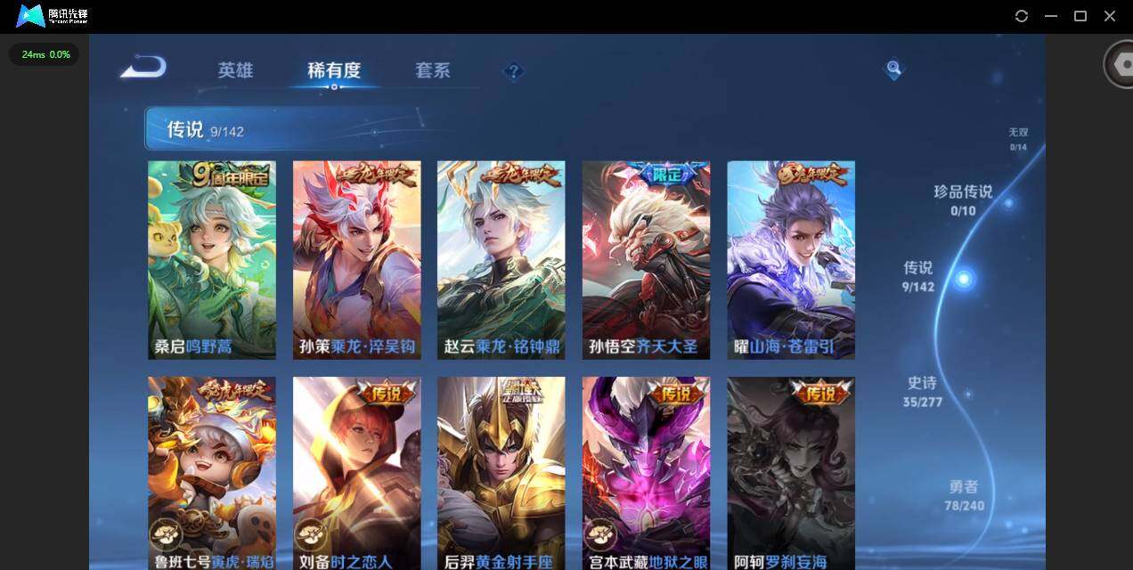 【传说皮肤】:桑启鸣野蒿,孙策乘龙淬吴钩,赵云乘龙铭钟鼎,孙悟空齐天大圣,曜山海苍雷引,鲁班七号寅虎瑞焰,刘备时之恋人,后羿黄金射手座,宫本武藏地狱之眼