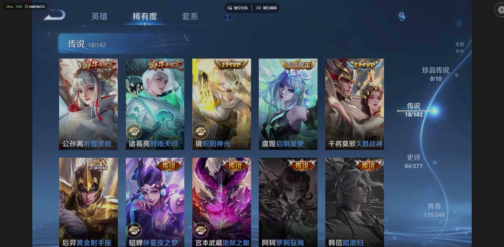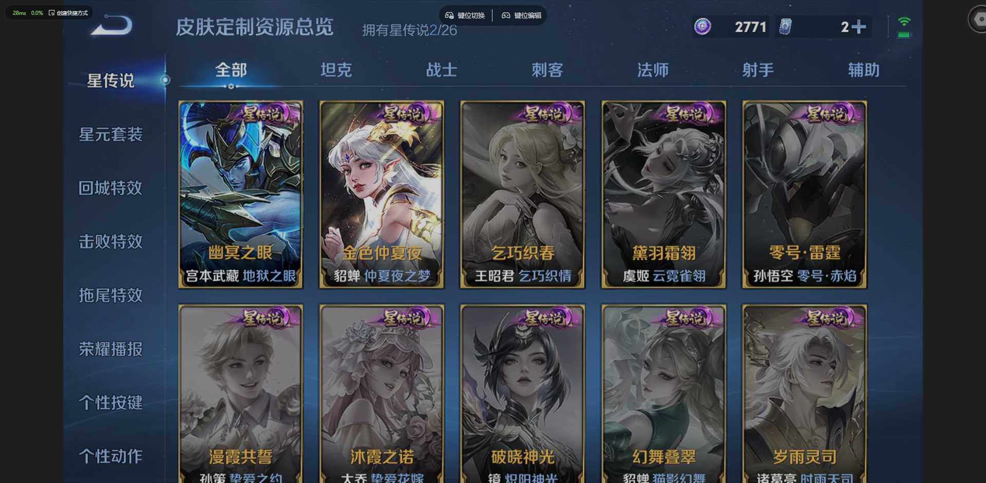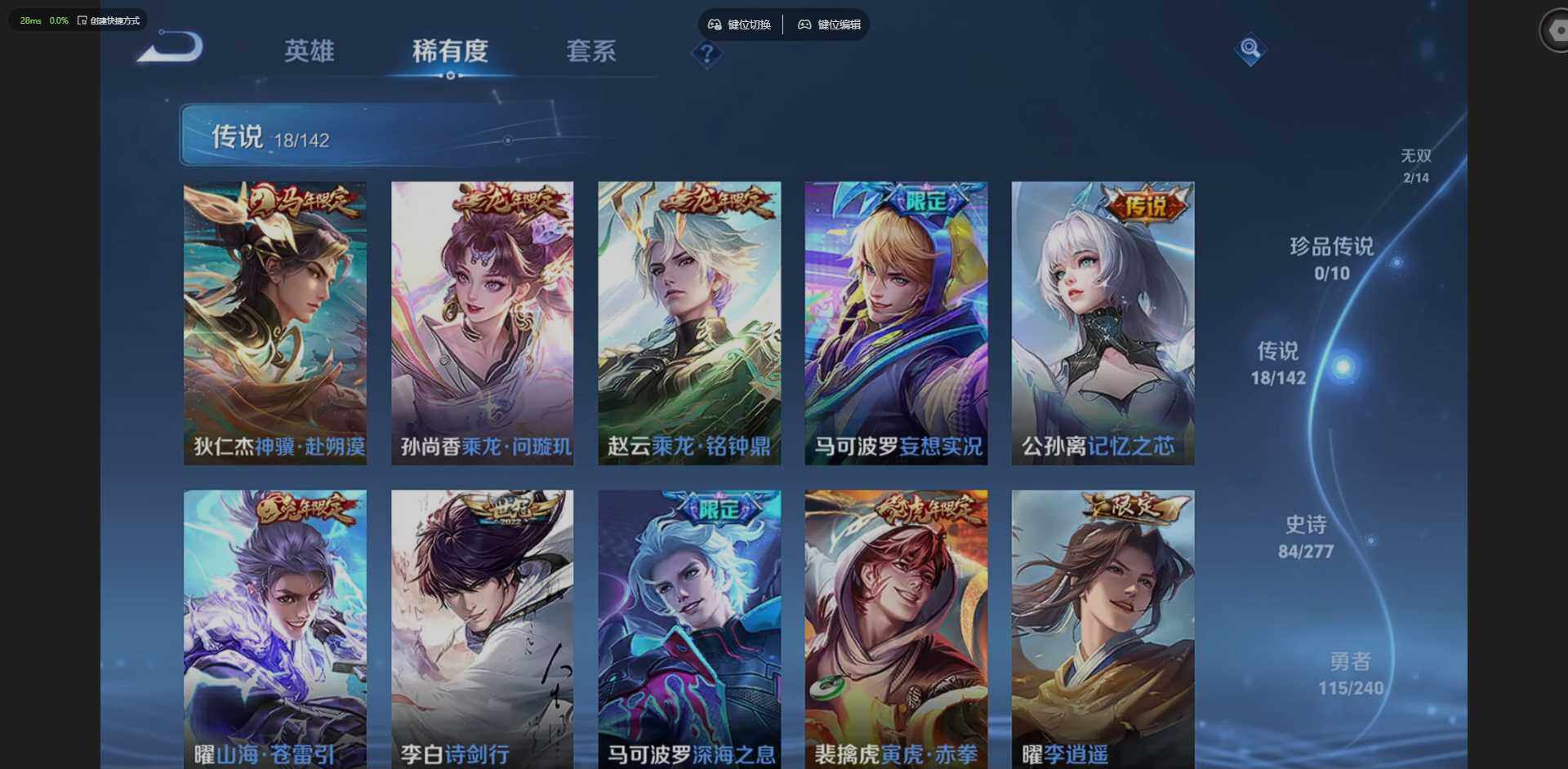 【传说皮肤】:狄仁杰神骥赴朔漠,孙尚香乘龙问璇玑,赵云乘龙铭钟鼎,马可波罗妄想实况,公孙离记忆之芯,曜山海苍雷引,李白诗剑行,马可波罗深海之息,裴擒虎寅虎赤拳,曜李逍遥,,公孙离祈雪灵祝,诸葛亮时雨天司,镜炽阳神光,虞姬启明星使,干将莫邪久胜战神,后羿黄金射手座,貂蝉仲夏夜之梦,宫本武藏地狱之眼