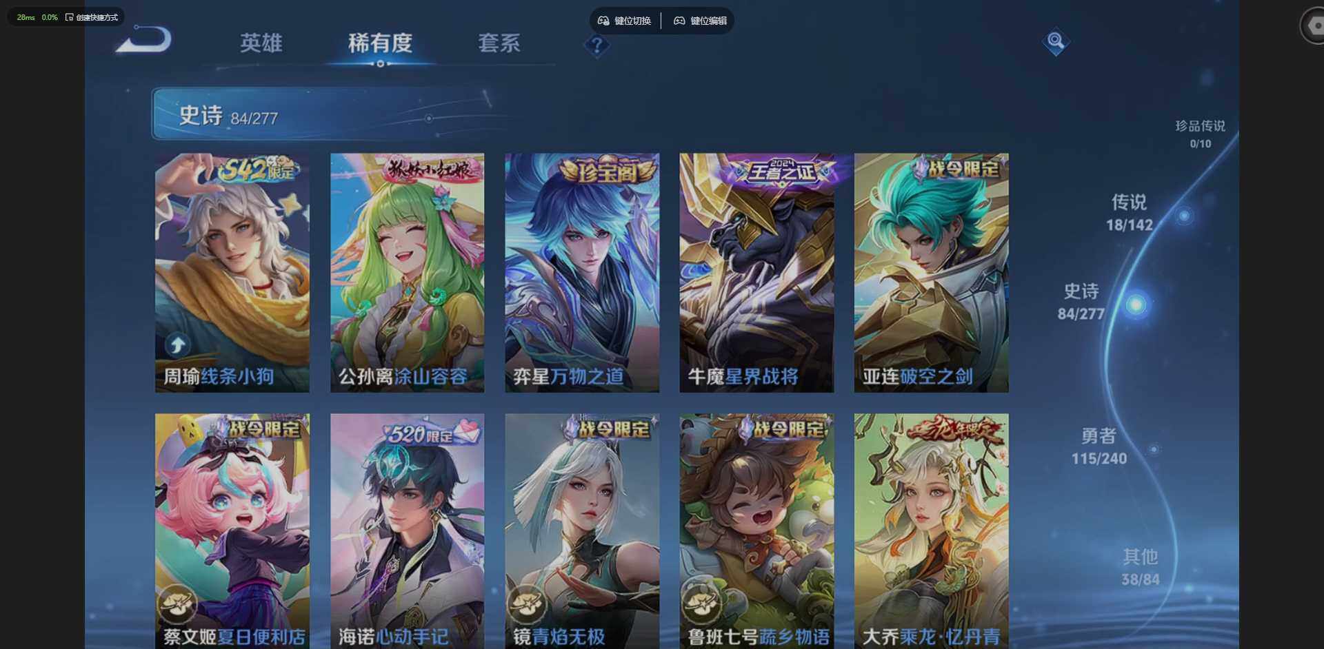 【史诗皮肤】:周瑜线条小狗,公孙离涂山容容,弈星万物之道,牛魔星界战将,亚连破空之剑,蔡文姬夏日便利店,海诺心动手记,镜青焰无极,鲁班七号蔬乡物语,大乔乘龙忆丹青,伽罗琥珀纪元,蒙恬荣光圣徽,高渐离燃音魔法,妲己灵卜魔法,蒙犽百解令,阿古朵江河有灵,司空震地狱燃心,赵怀真鹤归松栖,百里守约真我赫兹,暃星界游侠,梦奇顽趣,元歌无心,阿古朵顽趣,鬼谷子五谷丰年,弈星滕王阁序,公孙离玉兔公主,雅典娜黎明之约,嫦娥拒霜思,庄周高山流水,伽罗天狼溯光者,老夫子航海奇遇记,百里玄策热力回旋,西施诗语江南,元歌云间偶戏,云中君纤云弄巧,裴擒虎李小龙,百里玄策原初追逐者,马可波罗暗影游猎,孙尚香时之恋人,黄忠烈魂,不知火舞魅语,蔡文姬繁星吟游,公孙离无限星赏官,狄仁杰鹰眼统帅,大乔猫狗日记,孙策猫狗日记,杨玉环遇见飞天,阿轲节奏热浪,白起星夜王子,程咬金功夫厨神,李元芳逐浪之夏,公孙离蜜橘之夏,蔡文姬舞动绿茵,铠曙光守护者,百里守约特工魅影,亚瑟心灵战警,甄姬游园惊梦,诸葛亮黄金分割率,兰陵王暗隐猎兽者,小乔缤纷独角兽,夏侯惇乘风破浪,韩信逐梦之影,刘邦德古拉伯爵,花木兰水晶猎龙者,关羽冰锋战神,虞姬霸王别姬,吕布末日机甲,曹操幽灵船长,吕布圣诞狂欢,墨子金属风暴,妲己魅力维加斯,嬴政摇滚巨星,嬴政暗夜贵公子,嬴政优雅恋人,孙尚香水果甜心,孙尚香蔷薇恋人,宫本武藏鬼剑武藏,廉颇地狱岩魂,狄仁杰魔术师,甄姬冰雪圆舞曲,赵云未来纪元,赵云皇家上将,钟无艳王者之锤,露娜紫霞仙子,鲁班七号电玩小子