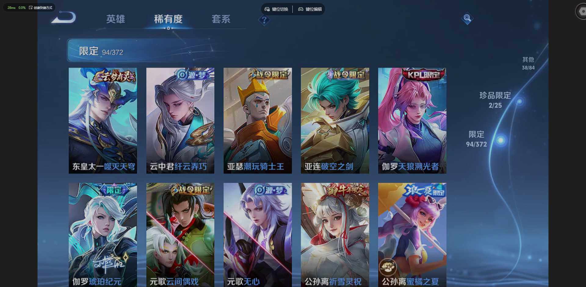 【限定皮肤】:公孙离离恨烟,蔡文姬夏日便利店,虞姬夏日便利店,姜子牙天穹之誓,狄仁杰阴阳师,赵云皇家上将,墨子神迹守卫,嬴政优雅恋人,孙尚香蔷薇恋人,庄周高山流水,高渐离死亡摇滚,钟无艳王者之锤,元歌云间偶戏,元歌无心,甄姬游园惊梦,马可波罗暗影游猎,马可波罗深海之息,马可波罗妄想实况,狄仁杰魔术师,狄仁杰万华元夜,达摩沙漠行僧,项羽海滩派对,老夫子醍醐杖,老夫子航海奇遇记,关羽冰锋战神,程咬金演武夺筹,韩信逐梦之影,兰陵王金庭之子,亚瑟潮玩骑士王,李元芳云中旅人,虞姬霸王别姬,虞姬启明星使,钟馗驱傩正仪,杨玉环遇见飞天,雅典娜黎明之约,蔡文姬繁星吟游,鬼谷子原初探秘者,鬼谷子五谷丰年,诸葛亮时雨天司,黄忠烈魂,苏烈千军破阵,百里玄策原初追逐者,弈星混沌棋,梦奇顽趣,公孙离蜜橘之夏,公孙离祈雪灵祝,公孙离玉兔公主,沈梦溪大漠名商,明世隐疑决卦,裴擒虎李小龙,裴擒虎寅虎赤拳,裴擒虎擒涛扼浪,云中君纤云弄巧,伽罗天狼溯光者,猪八戒西部大镖客,嫦娥拒霜思,嫦娥暖冬兔眠,曜李逍遥,,曜山海苍雷引,鲁班大师探海日志,桑启海盐诗旅,暃星界游侠,艾琳流音漫舞,赵怀真鹤归松栖,司空震地狱燃心,阿古朵江河有灵,张良古海寻踪,蒙犽百解令,蒙恬荣光圣徽,高渐离燃音魔法,妲己灵卜魔法,鬼谷子天穹祈灯,伽罗琥珀纪元,大乔乘龙忆丹青,孙尚香乘龙问璇玑,赵云乘龙铭钟鼎,沈梦溪龙舞盛年,鲁班七号蔬乡物语,李元芳蔬乡物语,刘邦剑破天穹,韩信群星魔术团,镜青焰无极,项羽苍威无极,海诺心动手记,刘备异域游侠,周瑜熔金海岸