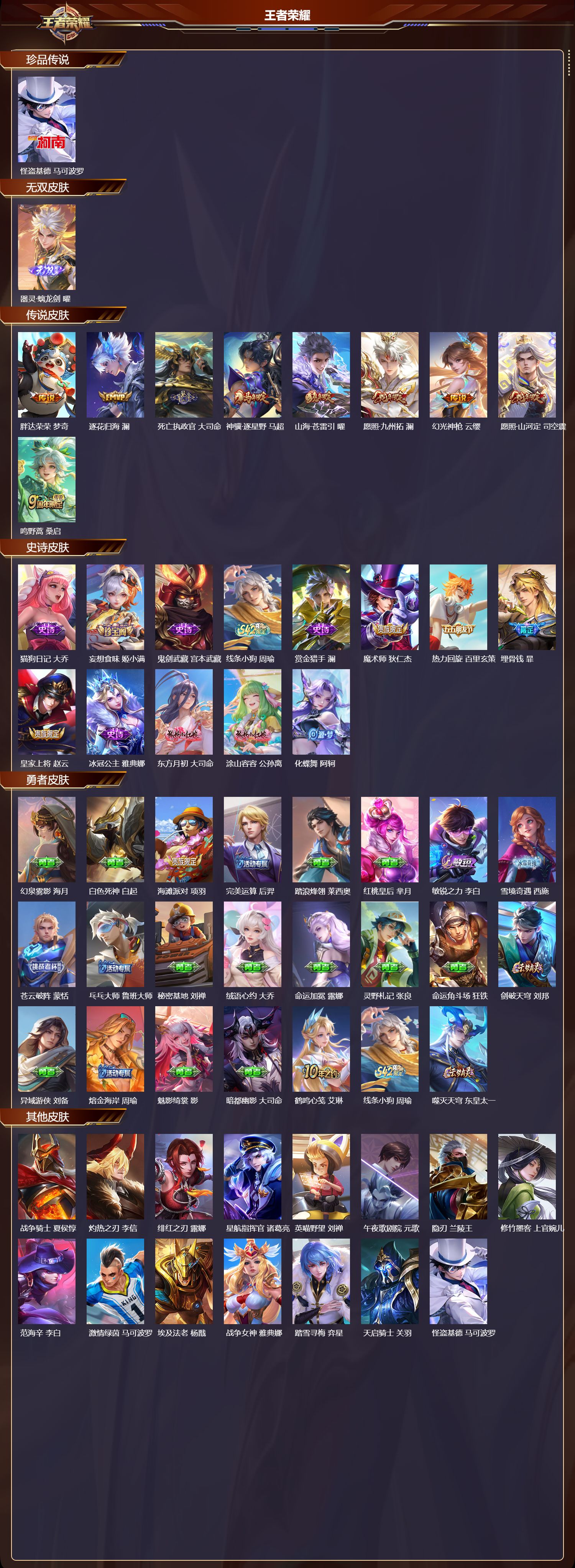 【9,传说皮肤】胖达荣荣,梦奇,逐花归海,澜,死亡执政官,大司命,神骥·逐星野,马超,山海·苍雷引,曜,愿照·九州拓,澜,幻光神枪,云缨,愿照·山河定,司空震,鸣野蒿,桑启,