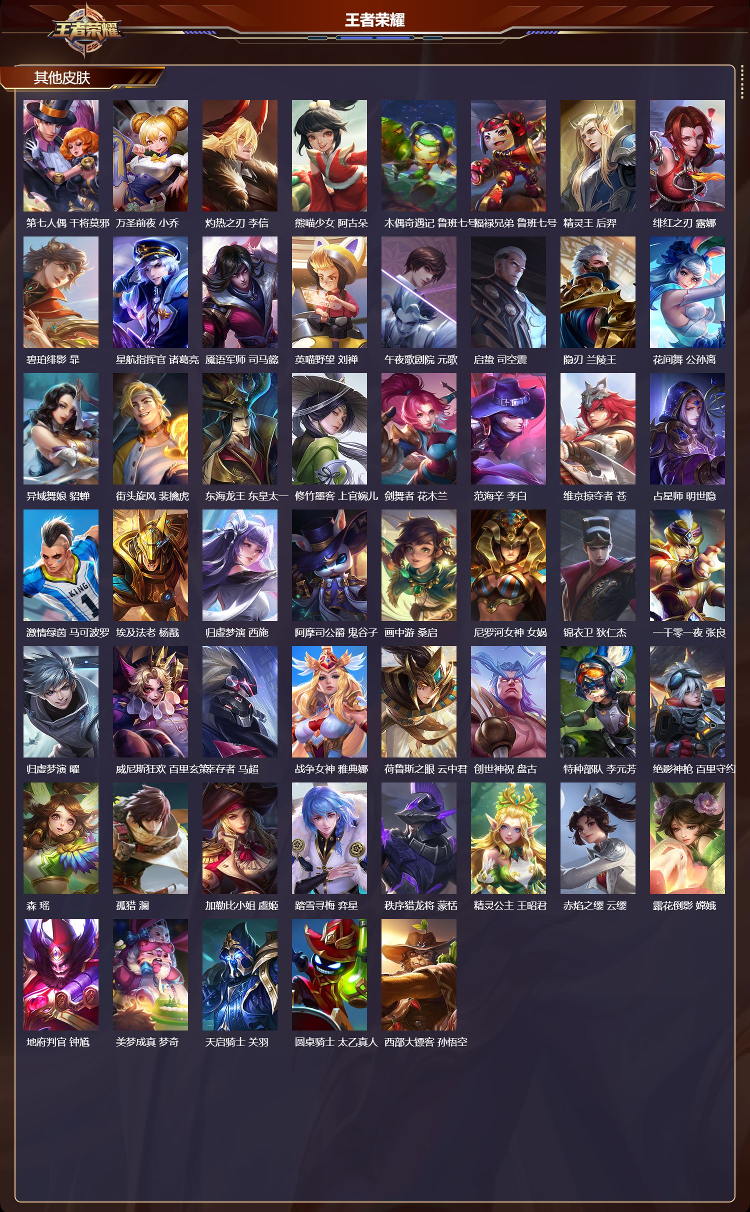 【65,其他皮肤】,伊势巫女,大乔,金属狂潮,高渐离,前尘,金蝉,战争骑士,夏侯惇,圣殿之光,刘邦,芝加哥教父,黄忠,潮流仙人,老夫子,三太子,哪吒,龙域领主,铠,超能战警,曹操,花见巫女,伽罗,未来旅行,孙膑,第七人偶,干将莫邪,万圣前夜,小乔,灼热之刃,李信,熊喵少女,阿古朵,木偶奇遇记,鲁班七号,福禄兄弟,鲁班七号,精灵王,后羿,绯红之刃,露娜,碧珀绯影,暃,星航指挥官,诸葛亮,魇语军师,司马懿,英喵野望,刘禅,午夜歌剧院,元歌,启蛰,司空震,隐刃,兰陵王,花间舞,公孙离,异域舞娘,貂蝉,街头旋风,裴擒虎,东海龙王,东皇太一,修竹墨客,上官婉儿,剑舞者,花木兰,范海辛,李白,维京掠夺者,苍,占星师,明世隐,激情绿茵,马可波罗,埃及法老,杨戬,归虚梦演,西施,阿摩司公爵,鬼谷子,画中游,桑启,尼罗河女神,女娲,锦衣卫,狄仁杰,一千零一夜,张良,归虚梦演,曜,威尼斯狂欢,百里玄策,幸存者,马超,战争女神,雅典娜,荷鲁斯之眼,云中君,创世神祝,盘古,特种部队,李元芳,绝影神枪,百里守约,森,瑶,孤猎,澜,加勒比小姐,虞姬,踏雪寻梅,弈星,秩序猎龙将,蒙恬,精灵公主,王昭君,赤焰之缨,云缨,露花倒影,嫦娥,地府判官,钟馗,美梦成真,梦奇,天启骑士,关羽,圆桌骑士,太乙真人,西部大镖客,孙悟空,