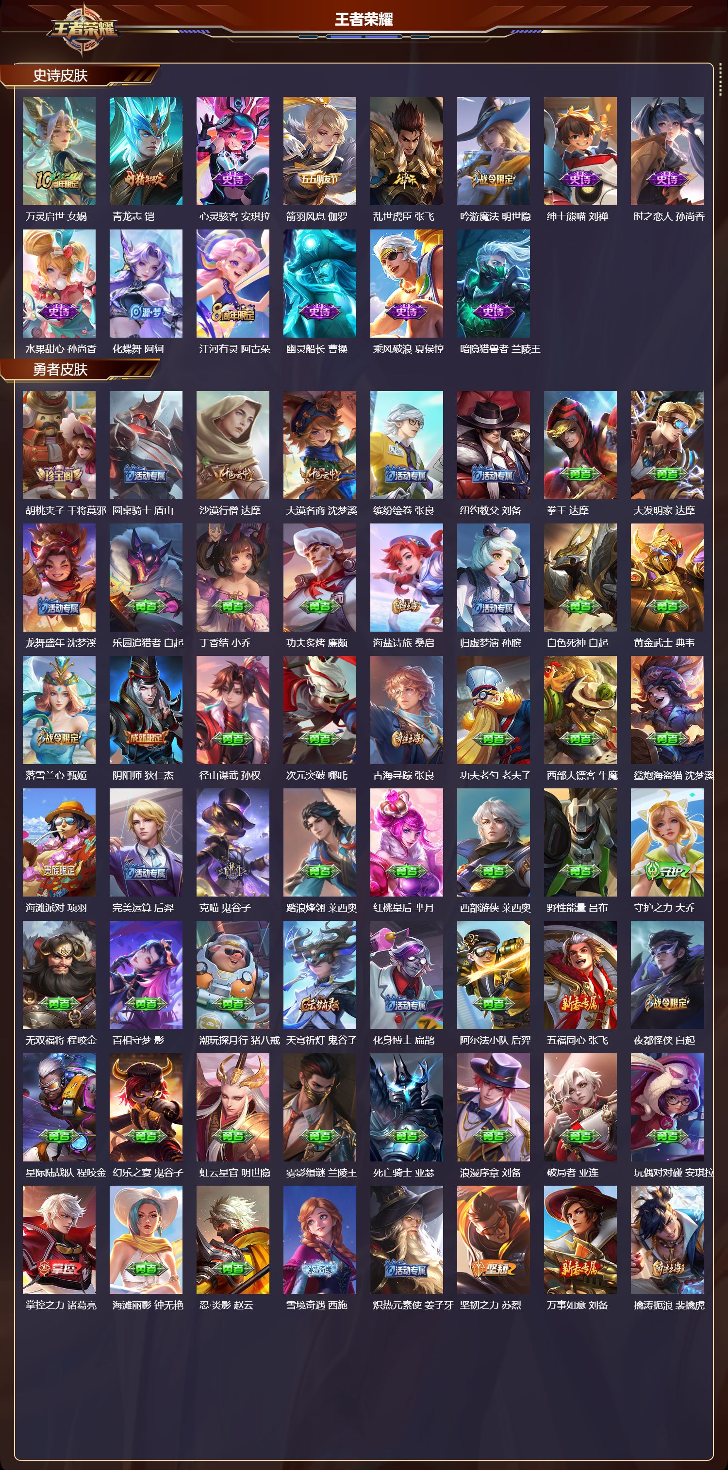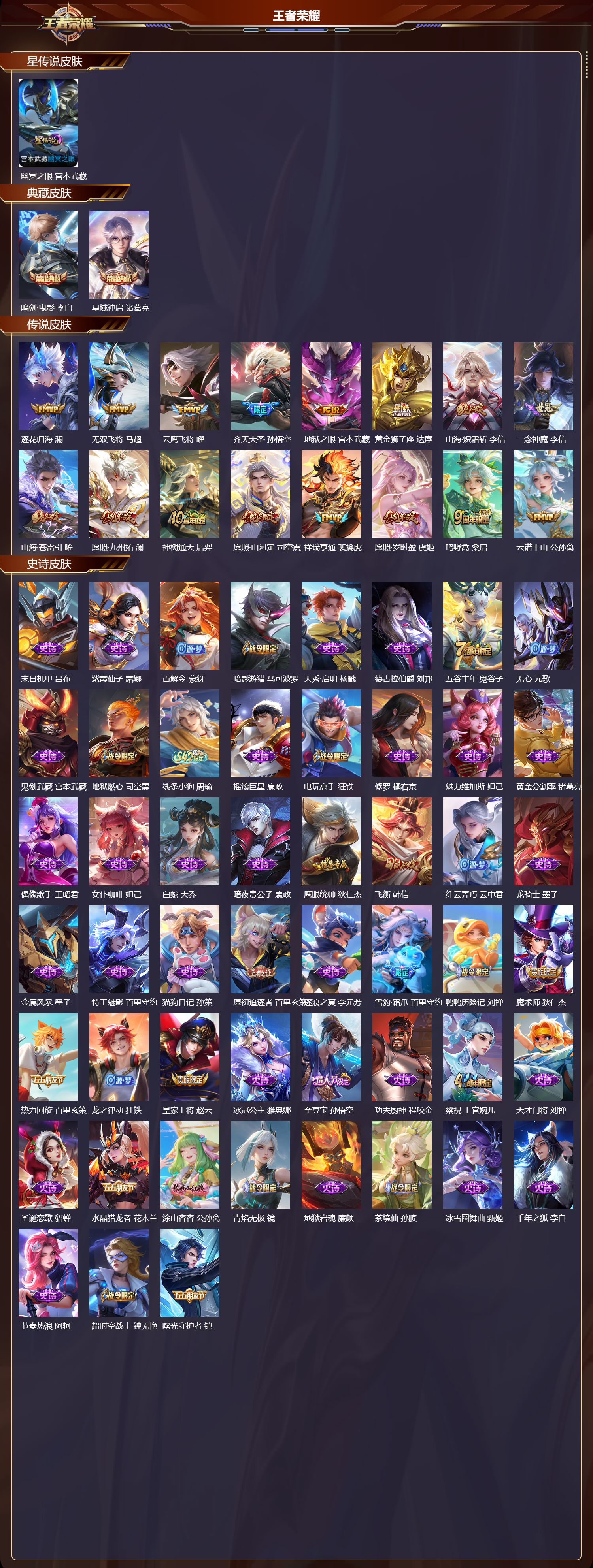 【65,史诗皮肤】,末日机甲,吕布,紫霞仙子,露娜,百解令,蒙犽,暗影游猎,马可波罗,天秀·启明,杨戬,德古拉伯爵,刘邦,五谷丰年,鬼谷子,无心,元歌,鬼剑武藏,宫本武藏,地狱燃心,司空震,线条小狗,周瑜,摇滚巨星,嬴政,电玩高手,狂铁,修罗,橘右京,魅力维加斯,妲己,黄金分割率,诸葛亮,偶像歌手,王昭君,女仆咖啡,妲己,白蛇,大乔,暗夜贵公子,嬴政,鹰眼统帅,狄仁杰,飞衡,韩信,纤云弄巧,云中君,龙骑士,墨子,金属风暴,墨子,特工魅影,百里守约,猫狗日记,孙策,原初追逐者,百里玄策,逐浪之夏,李元芳,雪豹·霜爪,百里守约,鸭鸭历险记,刘禅,魔术师,狄仁杰,热力回旋,百里玄策,龙之律动,狂铁,皇家上将,赵云,冰冠公主,雅典娜,至尊宝,孙悟空,功夫厨神,程咬金,梁祝,上官婉儿,天才门将,刘禅,圣诞恋歌,貂蝉,水晶猎龙者,花木兰,涂山容容,公孙离,青焰无极,镜,地狱岩魂,廉颇,茶境仙,孙膑,冰雪圆舞曲,甄姬,千年之狐,李白,节奏热浪,阿轲,超时空战士,钟无艳,曙光守护者,铠,万灵启世,女娲,青龙志,铠,心灵骇客,安琪拉,箭羽风息,伽罗,乱世虎臣,张飞,吟游魔法,明世隐,绅士熊喵,刘禅,时之恋人,孙尚香,水果甜心,孙尚香,化蝶舞,阿轲,江河有灵,阿古朵,幽灵船长,曹操,乘风破浪,夏侯惇,暗隐猎兽者,兰陵王,
