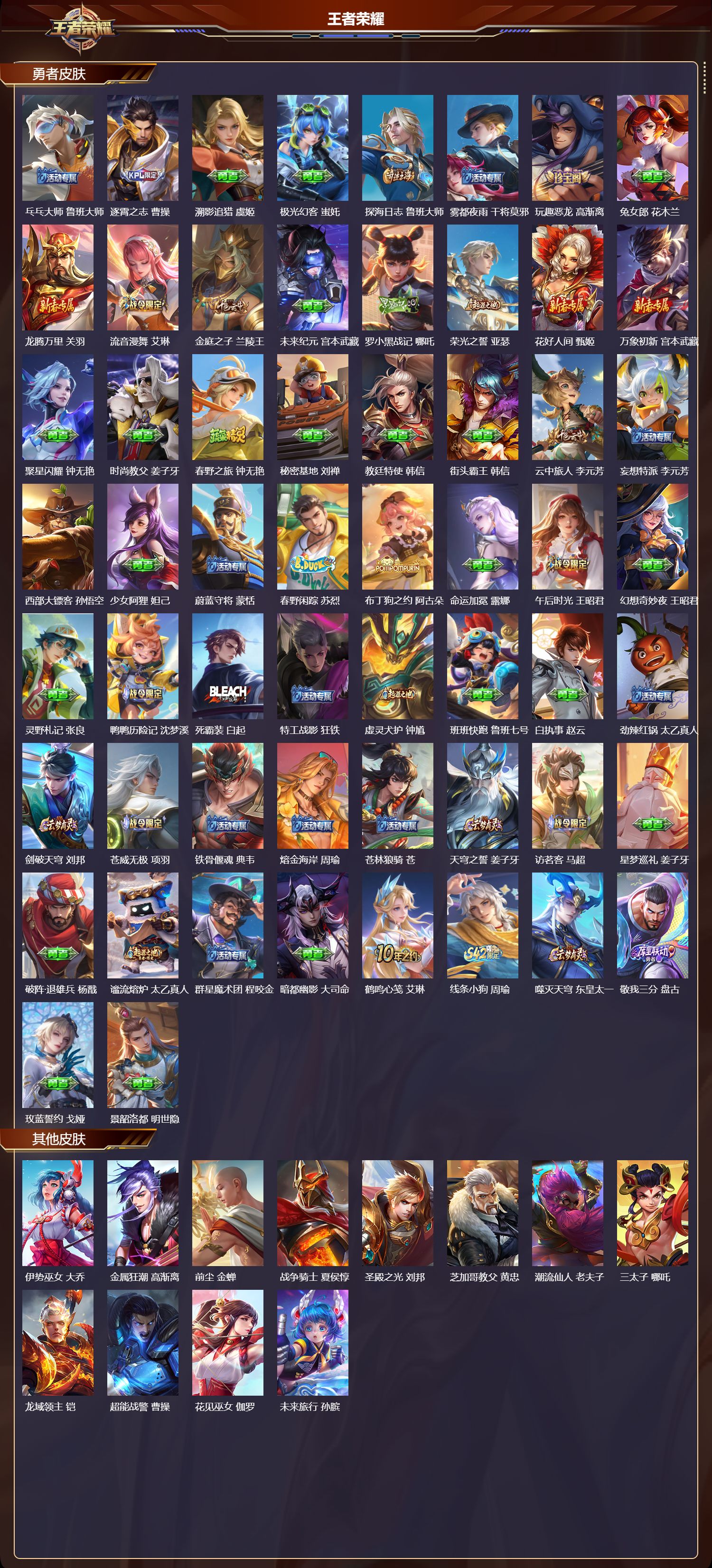 【114,勇者皮肤】,胡桃夹子,干将莫邪,圆桌骑士,盾山,沙漠行僧,达摩,大漠名商,沈梦溪,缤纷绘卷,张良,纽约教父,刘备,拳王,达摩,大发明家,达摩,龙舞盛年,沈梦溪,乐园追猎者,白起,丁香结,小乔,功夫炙烤,廉颇,海盐诗旅,桑启,归虚梦演,孙膑,白色死神,白起,黄金武士,典韦,落雪兰心,甄姬,阴阳师,狄仁杰,径山谋武,孙权,次元突破,哪吒,古海寻踪,张良,功夫老勺,老夫子,西部大镖客,牛魔,鲨炮海盗猫,沈梦溪,海滩派对,项羽,完美运算,后羿,克喵,鬼谷子,踏浪烽翎,莱西奥,红桃皇后,芈月,西部游侠,莱西奥,野性能量,吕布,守护之力,大乔,无双福将,程咬金,百相守梦,影,潮玩探月行,猪八戒,天穹祈灯,鬼谷子,化身博士,扁鹊,阿尔法小队,后羿,五福同心,张飞,夜都怪侠,白起,星际陆战队,程咬金,幻乐之宴,鬼谷子,虹云星官,明世隐,雾影缉谜,兰陵王,死亡骑士,亚瑟,浪漫序章,刘备,破局者,亚连,玩偶对对碰,安琪拉,掌控之力,诸葛亮,海滩丽影,钟无艳,忍·炎影,赵云,雪境奇遇,西施,炽热元素使,姜子牙,坚韧之力,苏烈,万事如意,刘备,擒涛扼浪,裴擒虎,乓乓大师,鲁班大师,逐霄之志,曹操,溯影追猎,虞姬,极光幻客,蚩奼,探海日志,鲁班大师,雾都夜雨,干将莫邪,玩趣恶龙,高渐离,兔女郎,花木兰,龙腾万里,关羽,流音漫舞,艾琳,金庭之子,兰陵王,未来纪元,宫本武藏,罗小黑战记,哪吒,荣光之誓,亚瑟,花好人间,甄姬,万象初新,宫本武藏,聚星闪耀,钟无艳,时尚教父,姜子牙,春野之旅,钟无艳,秘密基地,刘禅,教廷特使,韩信,街头霸王,韩信,云中旅人,李元芳,妄想特派,李元芳,西部大镖客,孙悟空,少女阿狸,妲己,蔚蓝守将,蒙恬,春野闲踪,苏烈,布丁狗之约,阿古朵,命运加冕,露娜,午后时光,王昭君,幻想奇妙夜,王昭君,灵野札记,张良,鸭鸭历险记,沈梦溪,死霸装,白起,特工战影,狂铁,虚灵犬护,钟馗,班班快跑,鲁班七号,白执事,赵云,劲辣红锅,太乙真人,剑破天穹,刘邦,苍威无极,项羽,铁骨偃魂,典韦,熔金海岸,周瑜,苍林狼骑,苍,天穹之誓,姜子牙,访茗客,马超,星梦巡礼,姜子牙,破阵·退雄兵,杨戬,谧流熔炉,太乙真人,群星魔术团,程咬金,暗都幽影,大司命,鹤鸣心笺,艾琳,线条小狗,周瑜,噬灭天穹,东皇太一,敬我三分,盘古,玫蓝誓约,戈娅,景韶洛都,明世隐,