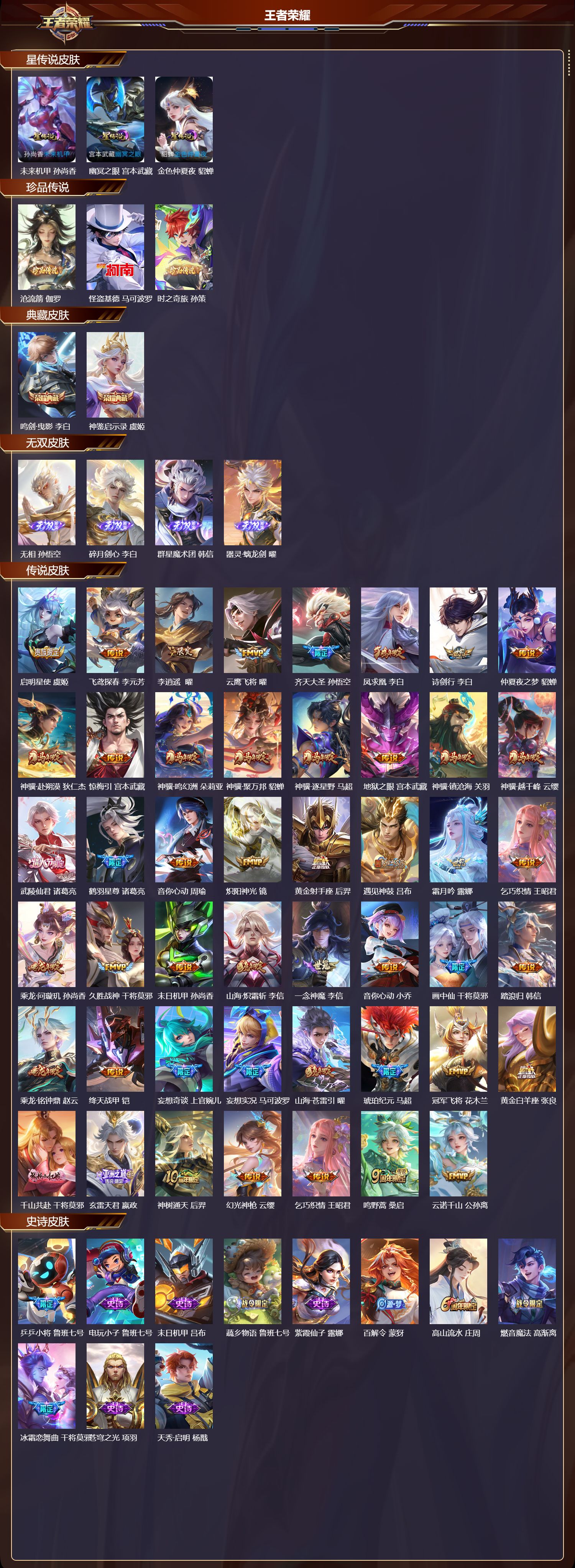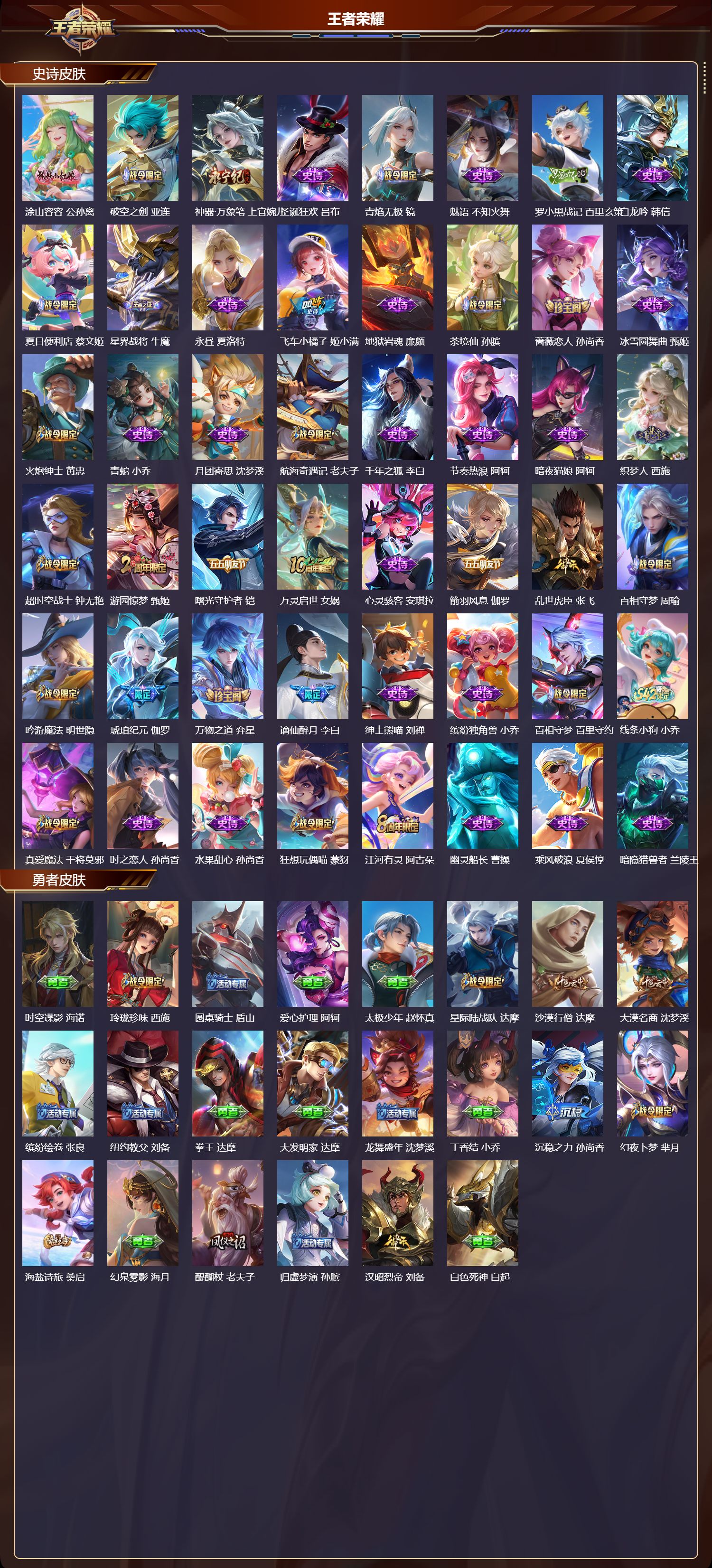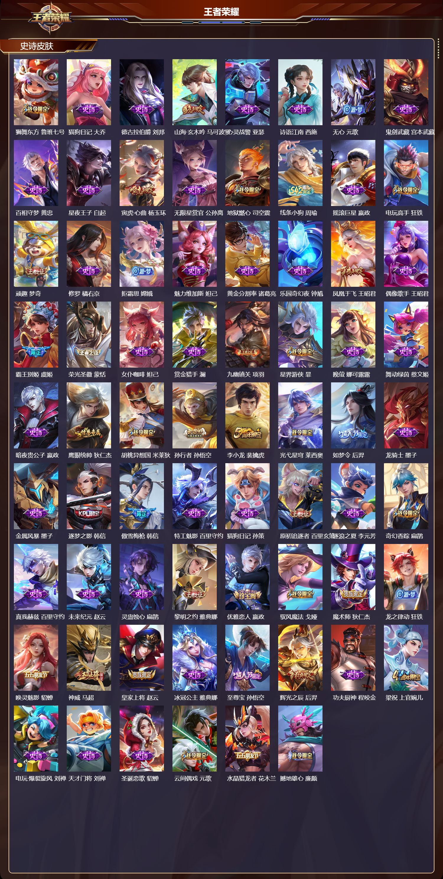 【129,史诗皮肤】,乒乒小将,鲁班七号,电玩小子,鲁班七号,末日机甲,吕布,蔬乡物语,鲁班七号,紫霞仙子,露娜,百解令,蒙犽,高山流水,庄周,燃音魔法,高渐离,冰霜恋舞曲,干将莫邪,苍穹之光,项羽,天秀·启明,杨戬,狮舞东方,鲁班七号,猫狗日记,大乔,德古拉伯爵,刘邦,山海·玄木吟,马可波罗,心灵战警,亚瑟,诗语江南,西施,无心,元歌,鬼剑武藏,宫本武藏,百相守梦,黄忠,星夜王子,白起,寅虎·心曲,杨玉环,无限星赏官,公孙离,地狱燃心,司空震,线条小狗,周瑜,摇滚巨星,嬴政,电玩高手,狂铁,顽趣,梦奇,修罗,橘右京,拒霜思,嫦娥,魅力维加斯,妲己,黄金分割率,诸葛亮,乐园奇幻夜,钟馗,凤凰于飞,王昭君,偶像歌手,王昭君,霸王别姬,虞姬,荣光圣徽,蒙恬,女仆咖啡,妲己,赏金猎手,澜,九幽镇关,项羽,星界游侠,暃,晚萤,娜可露露,舞动绿茵,蔡文姬,暗夜贵公子,嬴政,鹰眼统帅,狄仁杰,胡桃异想国,米莱狄,孙行者,孙悟空,李小龙,裴擒虎,光弋星穹,莱西奥,如梦令,后羿,龙骑士,墨子,金属风暴,墨子,逐梦之影,韩信,傲雪梅枪,韩信,特工魅影,百里守约,猫狗日记,孙策,原初追逐者,百里玄策,逐浪之夏,李元芳,奇幻香踪,扁鹊,真我赫兹,百里守约,未来纪元,赵云,灵蛊蚀心,扁鹊,黎明之约,雅典娜,优雅恋人,嬴政,驭风魔法,戈娅,魔术师,狄仁杰,龙之律动,狂铁,唤灵魅影,貂蝉,神威,马超,皇家上将,赵云,冰冠公主,雅典娜,至尊宝,孙悟空,辉光之辰,后羿,功夫厨神,程咬金,梁祝,上官婉儿,电玩·爆裂旋风,刘禅,天才门将,刘禅,圣诞恋歌,貂蝉,云间偶戏,元歌,水晶猎龙者,花木兰,撼地雄心,廉颇,涂山容容,公孙离,破空之剑,亚连,神器·万象笔,上官婉儿,圣诞狂欢,吕布,青焰无极,镜,魅语,不知火舞,罗小黑战记,百里玄策,白龙吟,韩信,夏日便利店,蔡文姬,星界战将,牛魔,永昼,夏洛特,飞车小橘子,姬小满,地狱岩魂,廉颇,茶境仙,孙膑,蔷薇恋人,孙尚香,冰雪圆舞曲,甄姬,火炮绅士,黄忠,青蛇,小乔,月团寄思,沈梦溪,航海奇遇记,老夫子,千年之狐,李白,节奏热浪,阿轲,暗夜猫娘,阿轲,织梦人,西施,超时空战士,钟无艳,游园惊梦,甄姬,曙光守护者,铠,万灵启世,女娲,心灵骇客,安琪拉,箭羽风息,伽罗,乱世虎臣,张飞,百相守梦,周瑜,吟游魔法,明世隐,琥珀纪元,伽罗,万物之道,弈星,谪仙醉月,李白,绅士熊喵,刘禅,缤纷独角兽,小乔,百相守梦,百里守约,线条小狗,小乔,真爱魔法,干将莫邪,时之恋人,孙尚香,水果甜心,孙尚香,狂想玩偶喵,蒙犽,江河有灵,阿古朵,幽灵船长,曹操,乘风破浪,夏侯惇,暗隐猎兽者,兰陵王,