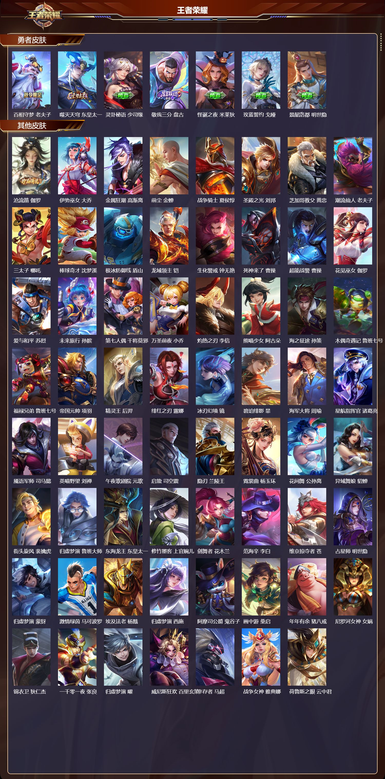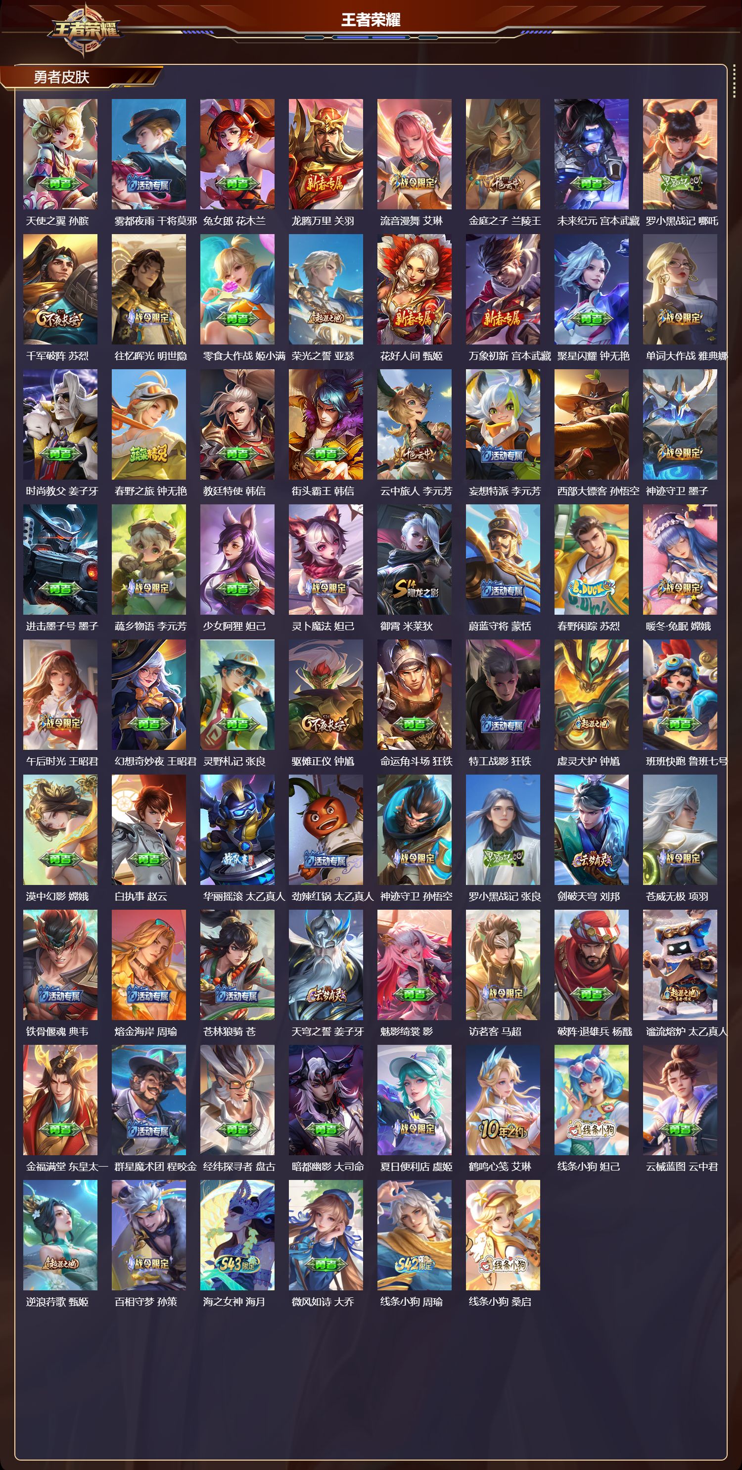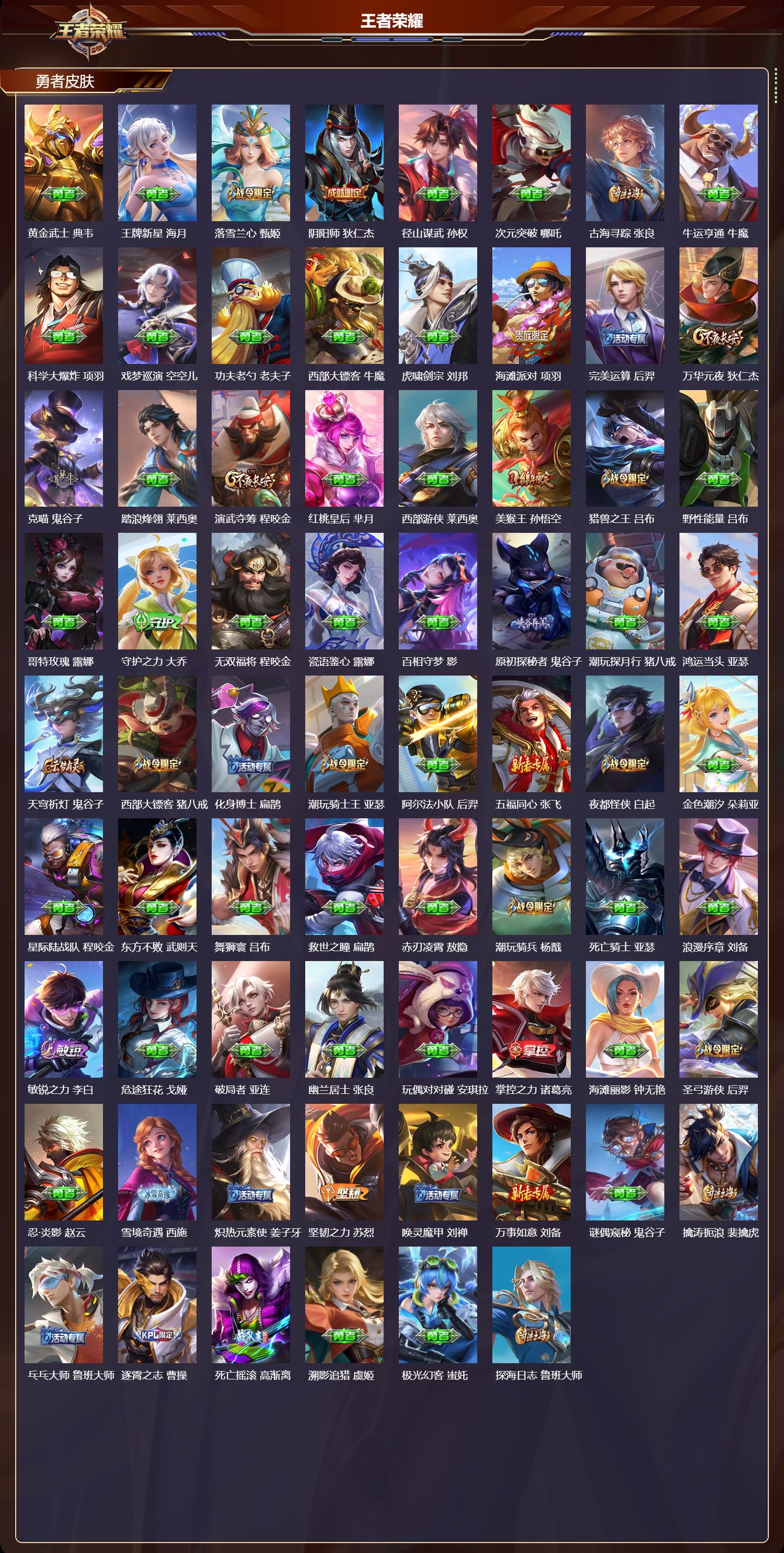 【169,勇者皮肤】,时空谍影,海诺,玲珑珍味,西施,圆桌骑士,盾山,爱心护理,阿轲,太极少年,赵怀真,星际陆战队,达摩,沙漠行僧,达摩,大漠名商,沈梦溪,缤纷绘卷,张良,纽约教父,刘备,拳王,达摩,大发明家,达摩,龙舞盛年,沈梦溪,丁香结,小乔,沉稳之力,孙尚香,幻夜卜梦,芈月,海盐诗旅,桑启,幻泉雾影,海月,醍醐杖,老夫子,归虚梦演,孙膑,汉昭烈帝,刘备,白色死神,白起,黄金武士,典韦,王牌新星,海月,落雪兰心,甄姬,阴阳师,狄仁杰,径山谋武,孙权,次元突破,哪吒,古海寻踪,张良,牛运亨通,牛魔,科学大爆炸,项羽,戏梦巡演,空空儿,功夫老勺,老夫子,西部大镖客,牛魔,虎啸剑宗,刘邦,海滩派对,项羽,完美运算,后羿,万华元夜,狄仁杰,克喵,鬼谷子,踏浪烽翎,莱西奥,演武夺筹,程咬金,红桃皇后,芈月,西部游侠,莱西奥,美猴王,孙悟空,猎兽之王,吕布,野性能量,吕布,哥特玫瑰,露娜,守护之力,大乔,无双福将,程咬金,瓷语鉴心,露娜,百相守梦,影,原初探秘者,鬼谷子,潮玩探月行,猪八戒,鸿运当头,亚瑟,天穹祈灯,鬼谷子,西部大镖客,猪八戒,化身博士,扁鹊,潮玩骑士王,亚瑟,阿尔法小队,后羿,五福同心,张飞,夜都怪侠,白起,金色潮汐,朵莉亚,星际陆战队,程咬金,东方不败,武则天,舞狮寰,吕布,救世之瞳,扁鹊,赤刃凌霄,敖隐,潮玩骑兵,杨戬,死亡骑士,亚瑟,浪漫序章,刘备,敏锐之力,李白,危途狂花,戈娅,破局者,亚连,幽兰居士,张良,玩偶对对碰,安琪拉,掌控之力,诸葛亮,海滩丽影,钟无艳,圣弓游侠,后羿,忍·炎影,赵云,雪境奇遇,西施,炽热元素使,姜子牙,坚韧之力,苏烈,唤灵魔甲,刘禅,万事如意,刘备,谜偶窥秘,鬼谷子,擒涛扼浪,裴擒虎,乓乓大师,鲁班大师,逐霄之志,曹操,死亡摇滚,高渐离,溯影追猎,虞姬,极光幻客,蚩奼,探海日志,鲁班大师,天使之翼,孙膑,雾都夜雨,干将莫邪,兔女郎,花木兰,龙腾万里,关羽,流音漫舞,艾琳,金庭之子,兰陵王,未来纪元,宫本武藏,罗小黑战记,哪吒,千军破阵,苏烈,往忆晖光,明世隐,零食大作战,姬小满,荣光之誓,亚瑟,花好人间,甄姬,万象初新,宫本武藏,聚星闪耀,钟无艳,单词大作战,雅典娜,时尚教父,姜子牙,春野之旅,钟无艳,教廷特使,韩信,街头霸王,韩信,云中旅人,李元芳,妄想特派,李元芳,西部大镖客,孙悟空,神迹守卫,墨子,进击墨子号,墨子,蔬乡物语,李元芳,少女阿狸,妲己,灵卜魔法,妲己,御霄,米莱狄,蔚蓝守将,蒙恬,春野闲踪,苏烈,暖冬·兔眠,嫦娥,午后时光,王昭君,幻想奇妙夜,王昭君,灵野札记,张良,驱傩正仪,钟馗,命运角斗场,狂铁,特工战影,狂铁,虚灵犬护,钟馗,班班快跑,鲁班七号,漠中幻影,嫦娥,白执事,赵云,华丽摇滚,太乙真人,劲辣红锅,太乙真人,神迹守卫,孙悟空,罗小黑战记,张良,剑破天穹,刘邦,苍威无极,项羽,铁骨偃魂,典韦,熔金海岸,周瑜,苍林狼骑,苍,天穹之誓,姜子牙,魅影绮裳,影,访茗客,马超,破阵·退雄兵,杨戬,谧流熔炉,太乙真人,金福满堂,东皇太一,群星魔术团,程咬金,经纬探寻者,盘古,暗都幽影,大司命,夏日便利店,虞姬,鹤鸣心笺,艾琳,线条小狗,妲己,云械蓝图,云中君,逆浪荇歌,甄姬,百相守梦,孙策,海之女神,海月,微风如诗,大乔,线条小狗,周瑜,线条小狗,桑启,百相守梦,老夫子,噬灭天穹,东皇太一,灵卦秘语,少司缘,敬我三分,盘古,怪诞之夜,米莱狄,玫蓝誓约,戈娅,景韶洛都,明世隐,