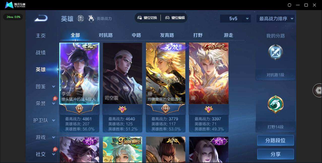 W10022【安卓区V8】可二次实名,英雄104,皮肤161,典藏:李白鸣剑.曳