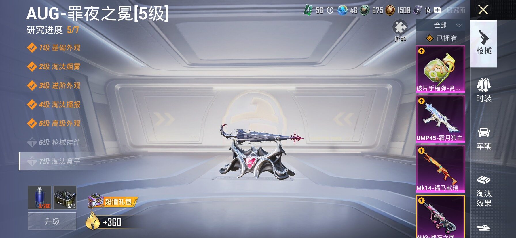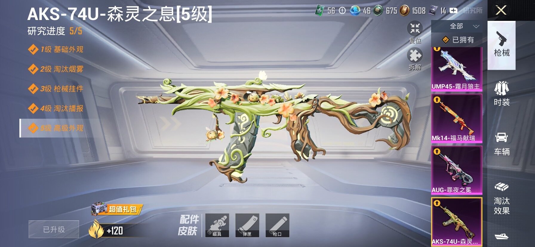【5特效枪】,AKS-74U-森灵之息,(5级),AUG-罪夜之冕,(5级),Mk14-福马献瑞,(5级),UMP45-霜月狼主(3级)碎片手榴弹-美味星星糖(3级)