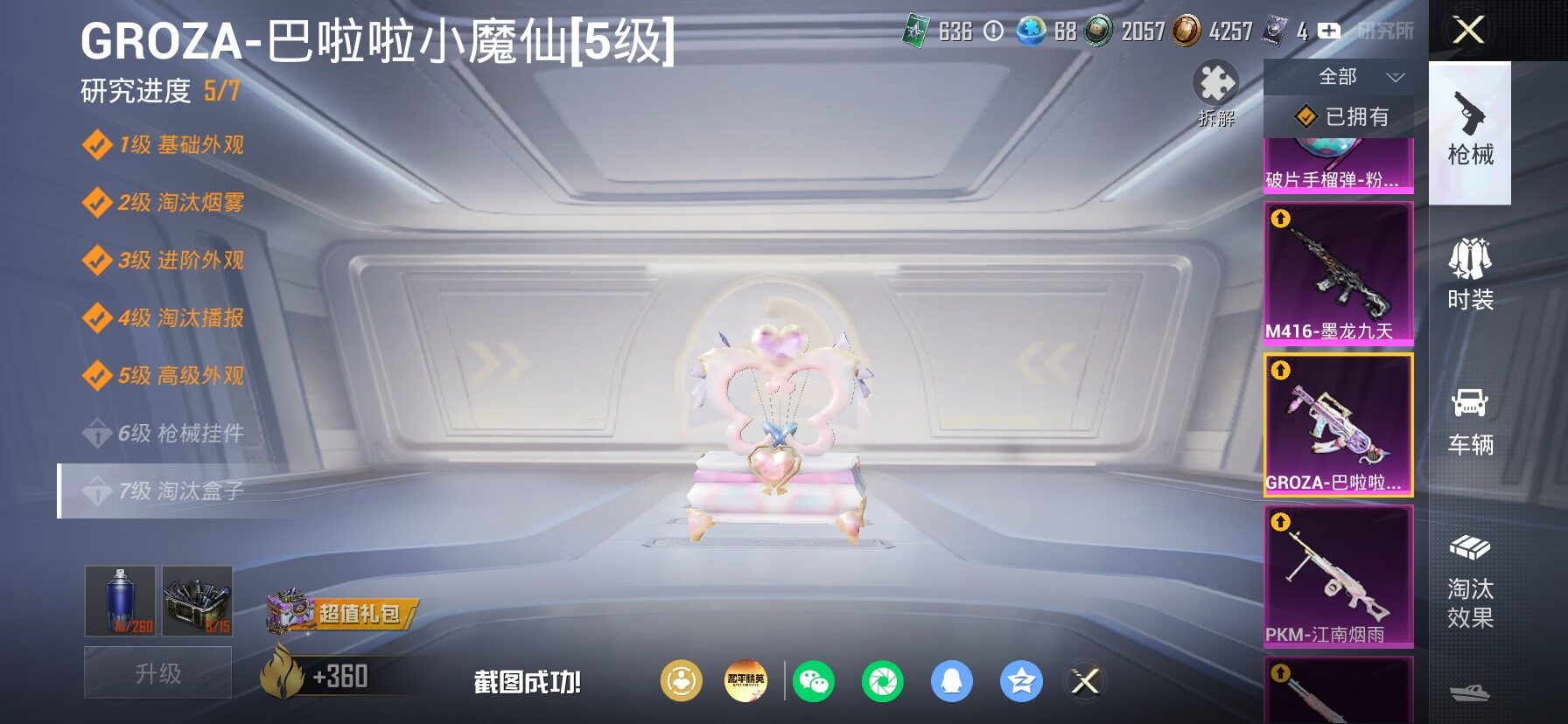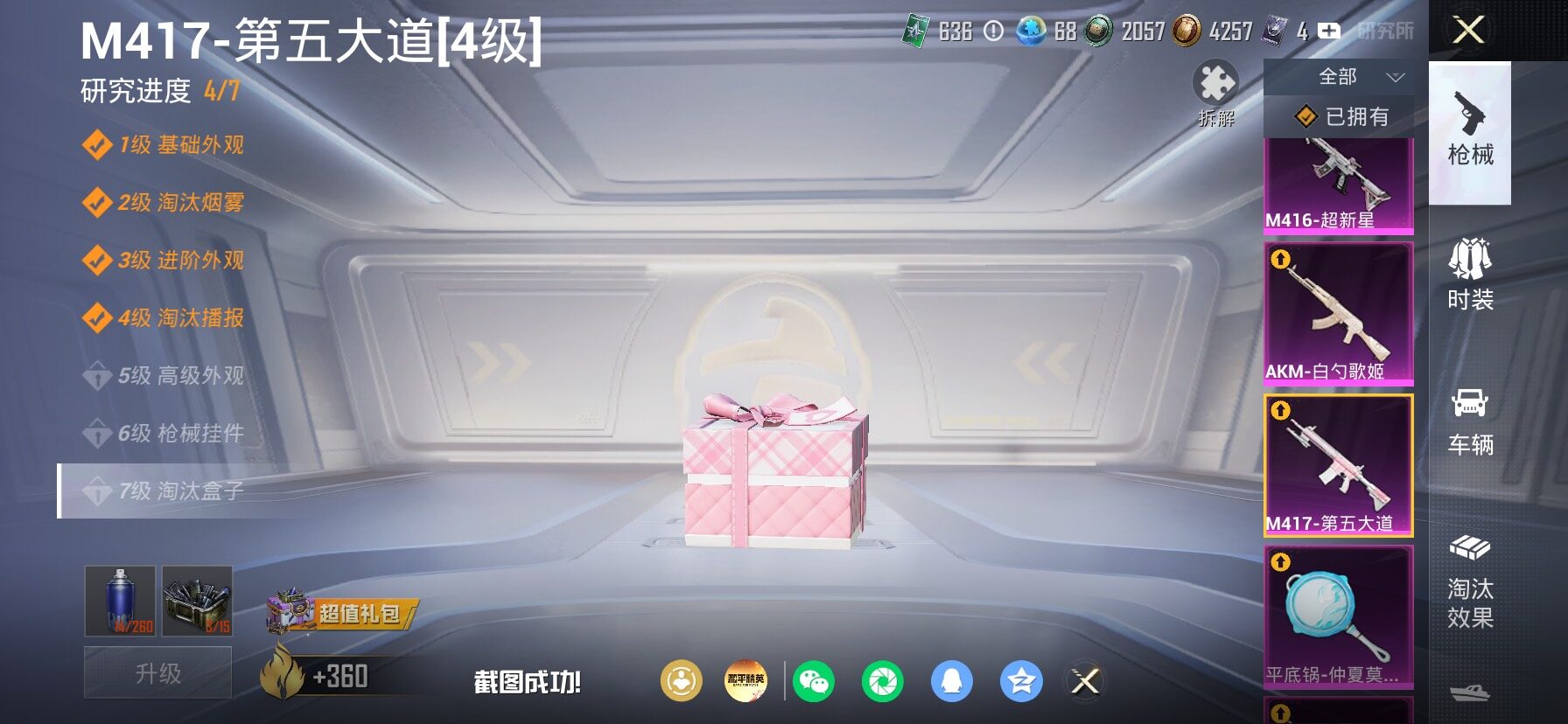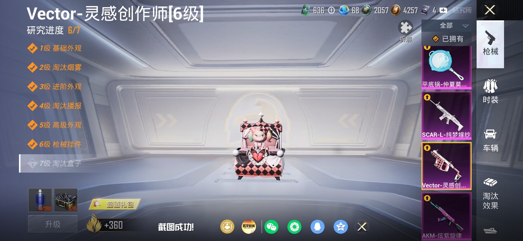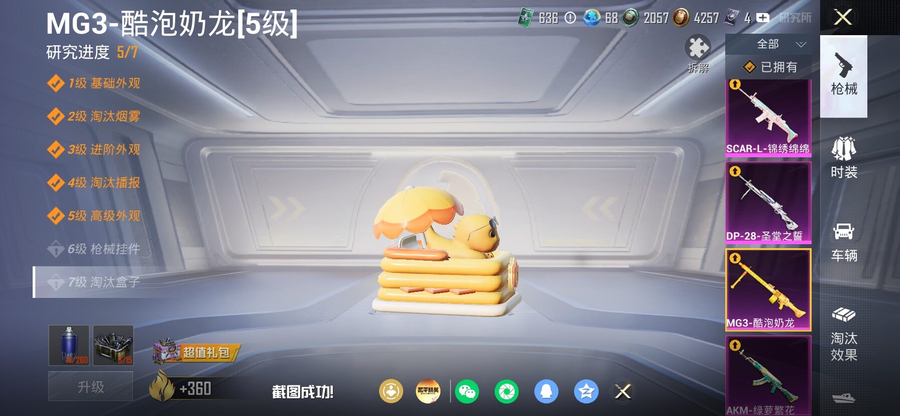 【23特效枪】,SCAR-L-纯梦嫁纱,(4级),SCAR-L-锦绣绵绵,(5级),M416-墨龙九天,(3级),M416-超新星,(6级),AKM-炫紫旋律,(7级),AKM-白勺歌姬,(1级),AKM-绿萝繁花,(5级),Kar98K-巳巳如意,(5级),SPAS-12-蜜语绒猫,(4级),MG3-酷泡奶龙,(5级),MG-36-沧焰双生,(5级),DP-28-豹影疾电,(5级),AUG-暖羊咩咩,(5级),PKM-江南烟雨,(4级),GROZA-巴啦啦小魔仙,(5级),DP-28-圣堂之誓,(3级),M417-第五大道,(4级),Vector-灵感创作师,(6级),Mk14-福马献瑞,(4级),UMP45-萌骑冒险,(5级),平底锅-仲夏莫吉托,(6级),破片手榴弹-粉粉猫爪,(6级),烟雾弹-猫咪绅士,(4级),