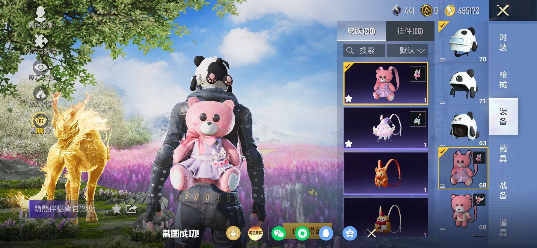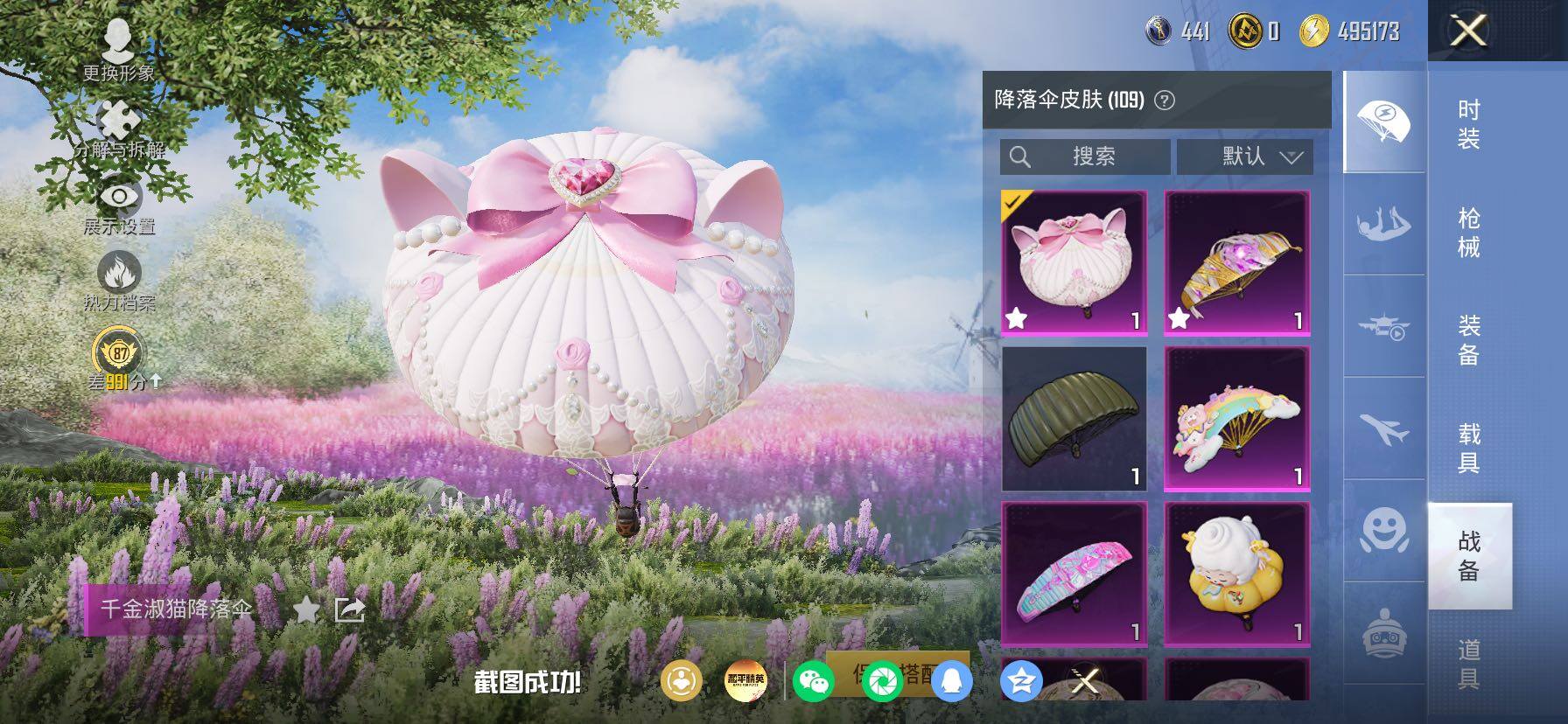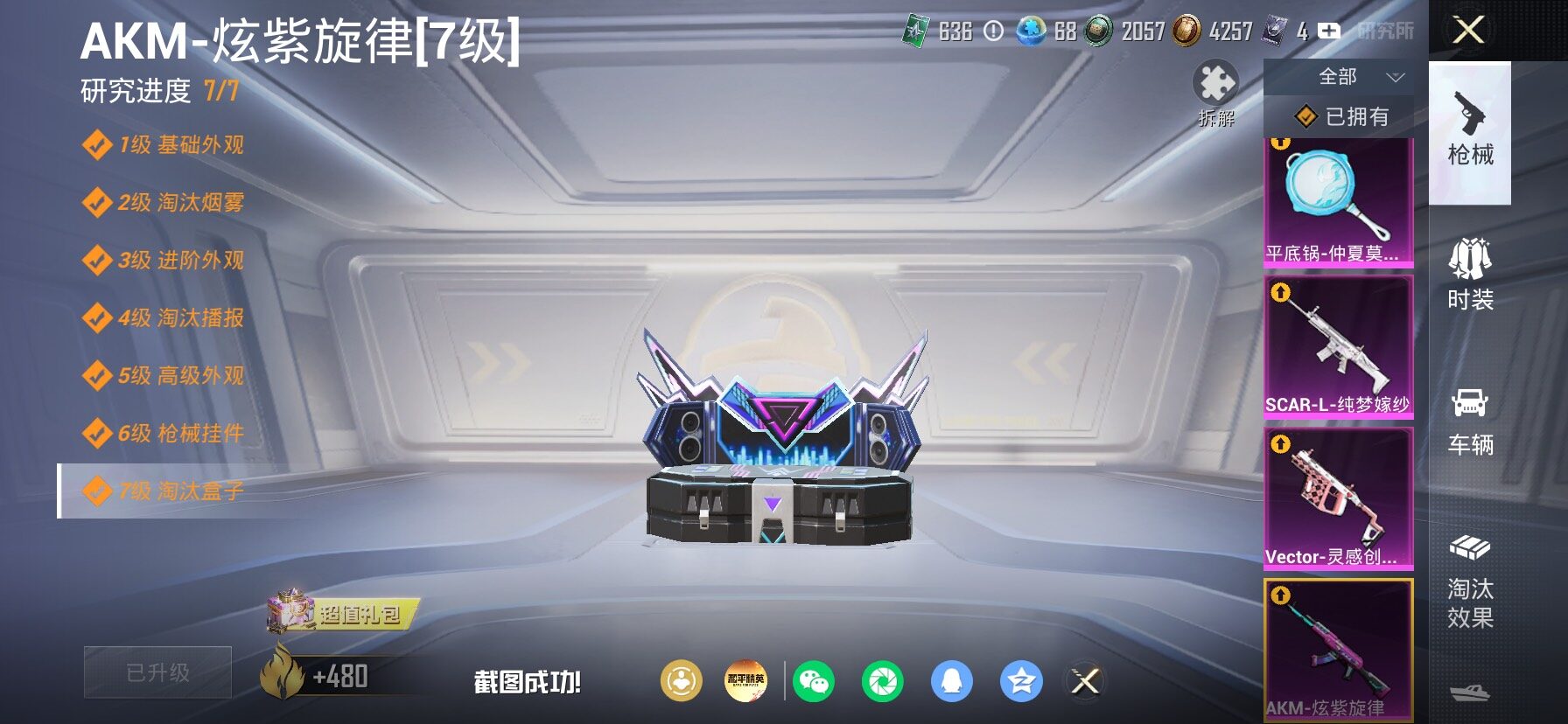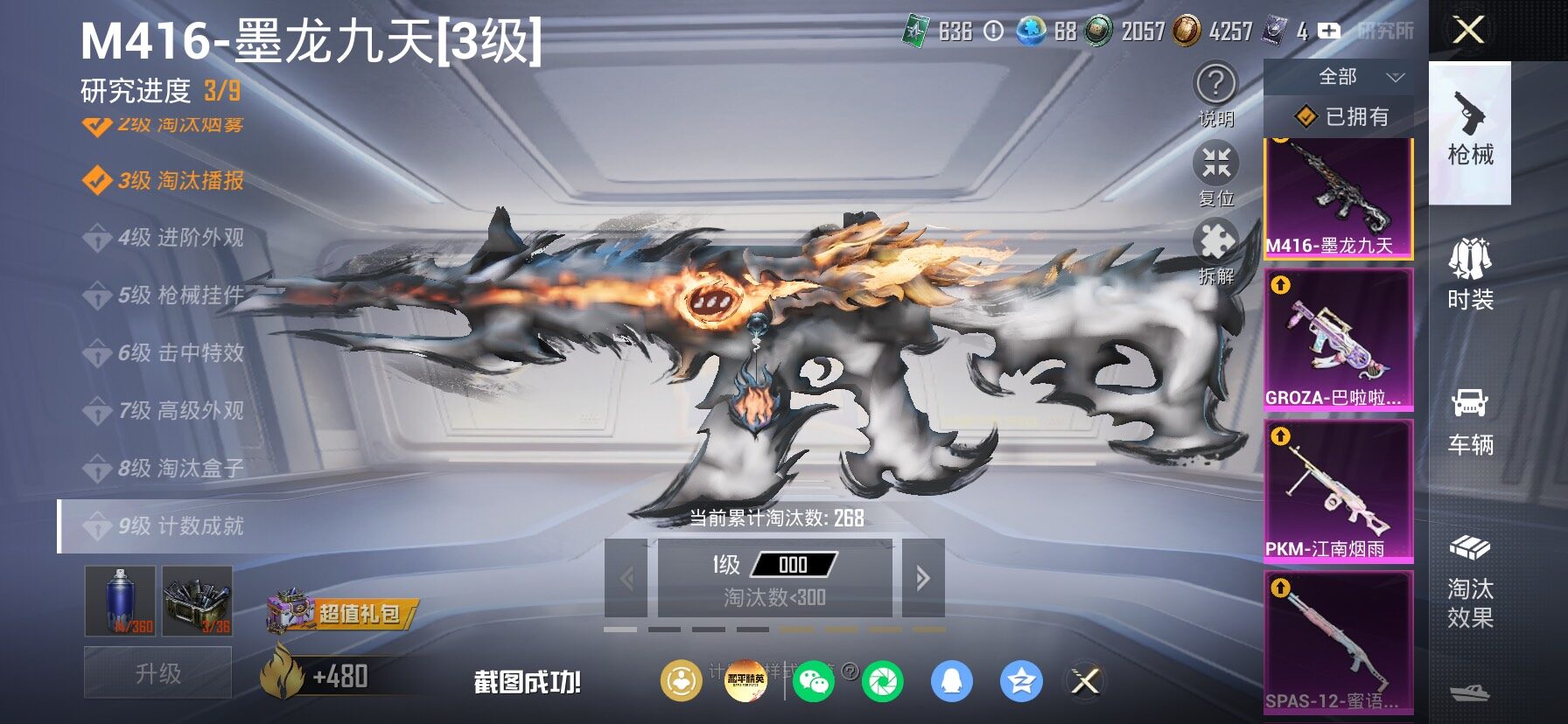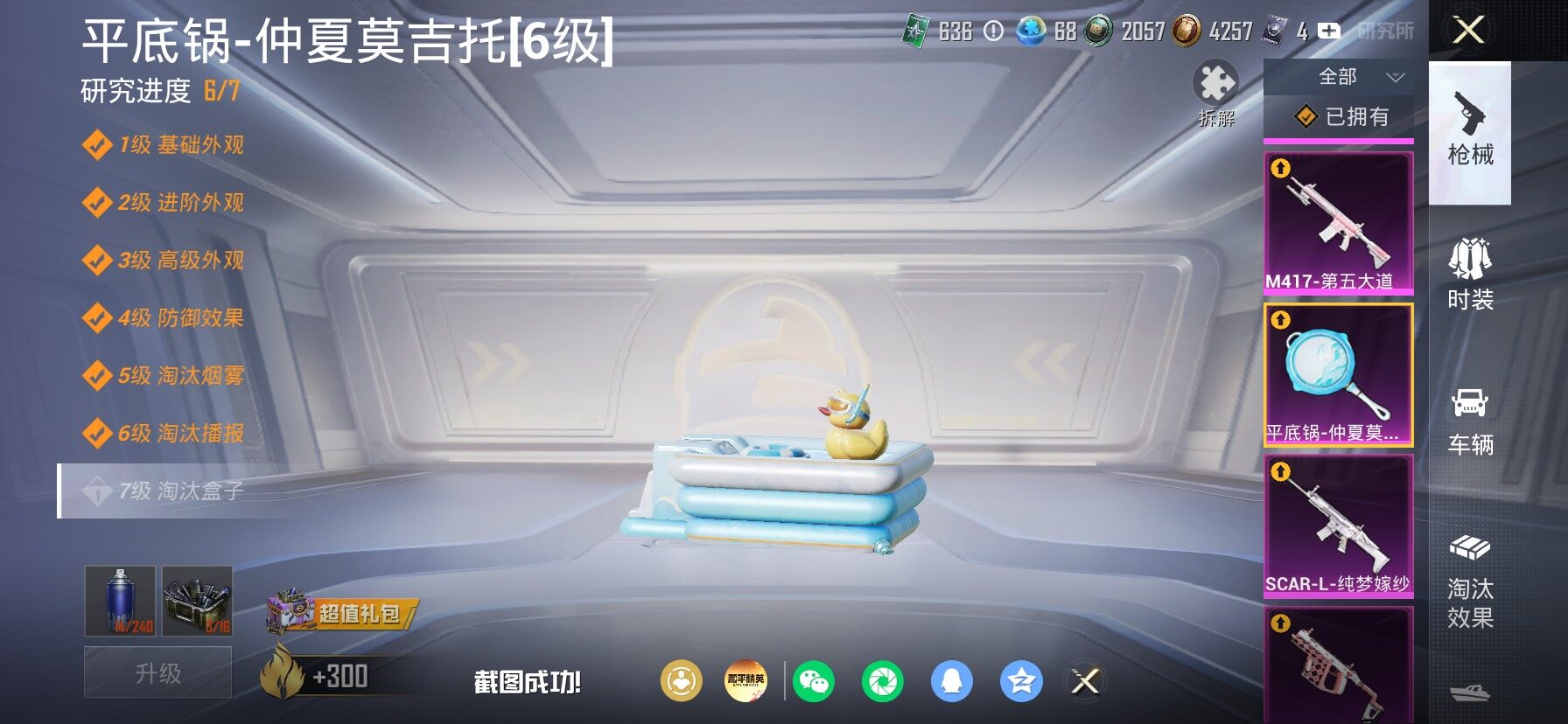 【23特效枪】,SCAR-L-纯梦嫁纱,(4级),SCAR-L-锦绣绵绵,(5级),M416-墨龙九天,(3级),M416-超新星,(6级),AKM-炫紫旋律,(7级),AKM-白勺歌姬,(1级),AKM-绿萝繁花,(5级),Kar98K-巳巳如意,(5级),SPAS-12-蜜语绒猫,(4级),MG3-酷泡奶龙,(5级),MG-36-沧焰双生,(5级),DP-28-豹影疾电,(5级),AUG-暖羊咩咩,(5级),PKM-江南烟雨,(4级),GROZA-巴啦啦小魔仙,(5级),DP-28-圣堂之誓,(3级),M417-第五大道,(4级),Vector-灵感创作师,(6级),Mk14-福马献瑞,(4级),UMP45-萌骑冒险,(5级),平底锅-仲夏莫吉托,(6级),破片手榴弹-粉粉猫爪,(6级),烟雾弹-猫咪绅士,(4级),
