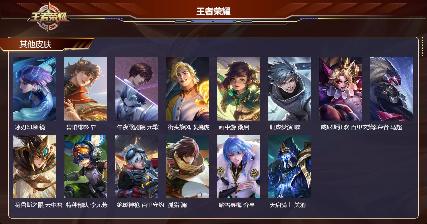 【16,其他皮肤】,灼热之刃,李信,绯红之刃,露娜,冰刃幻境,镜,碧珀绯影,暃,午夜歌剧院,元歌,街头旋风,裴擒虎,画中游,桑启,归虚梦演,曜,威尼斯狂欢,百里玄策,幸存者,马超,荷鲁斯之眼,云中君,特种部队,李元芳,绝影神枪,百里守约,孤猎,澜,踏雪寻梅,弈星,天启骑士,关羽,
