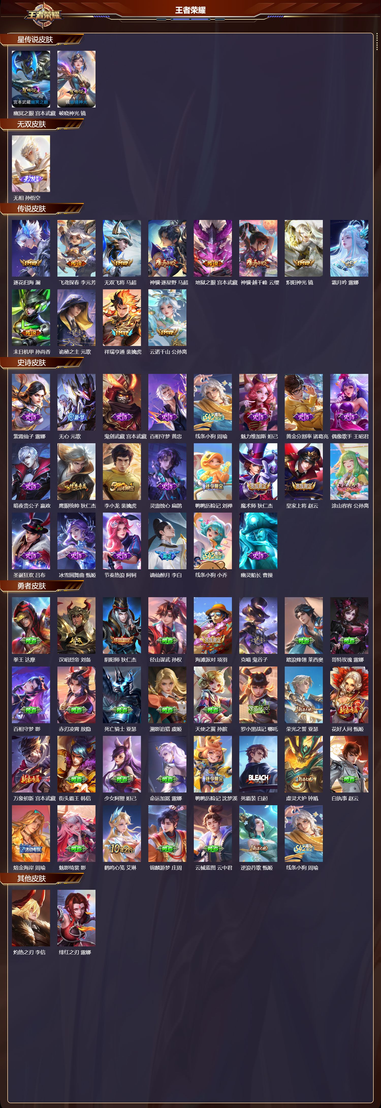 【31,勇者皮肤】,拳王,达摩,汉昭烈帝,刘备,阴阳师,狄仁杰,径山谋武,孙权,海滩派对,项羽,克喵,鬼谷子,踏浪烽翎,莱西奥,哥特玫瑰,露娜,百相守梦,影,赤刃凌霄,敖隐,死亡骑士,亚瑟,溯影追猎,虞姬,天使之翼,孙膑,罗小黑战记,哪吒,荣光之誓,亚瑟,花好人间,甄姬,万象初新,宫本武藏,街头霸王,韩信,少女阿狸,妲己,命运加冕,露娜,鸭鸭历险记,沈梦溪,死霸装,白起,虚灵犬护,钟馗,白执事,赵云,熔金海岸,周瑜,魅影绮裳,影,鹤鸣心笺,艾琳,锦麟游梦,庄周,云械蓝图,云中君,逆浪荇歌,甄姬,线条小狗,周瑜,