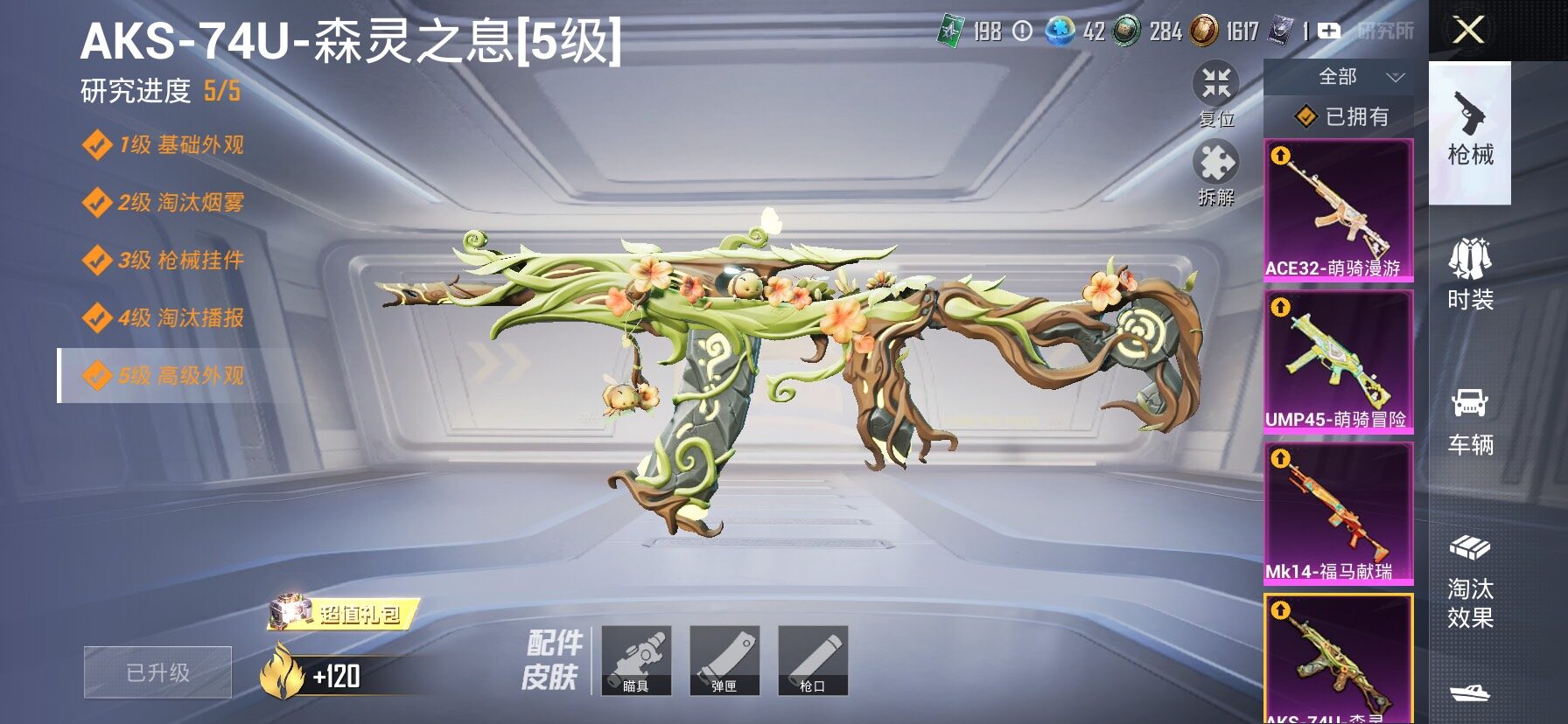 【4特效枪】,AKS-74U-森灵之息,(5级),Mk14-福马献瑞,(5级),UMP45-萌骑冒险,(1级),ACE32-萌骑漫游,(4级),