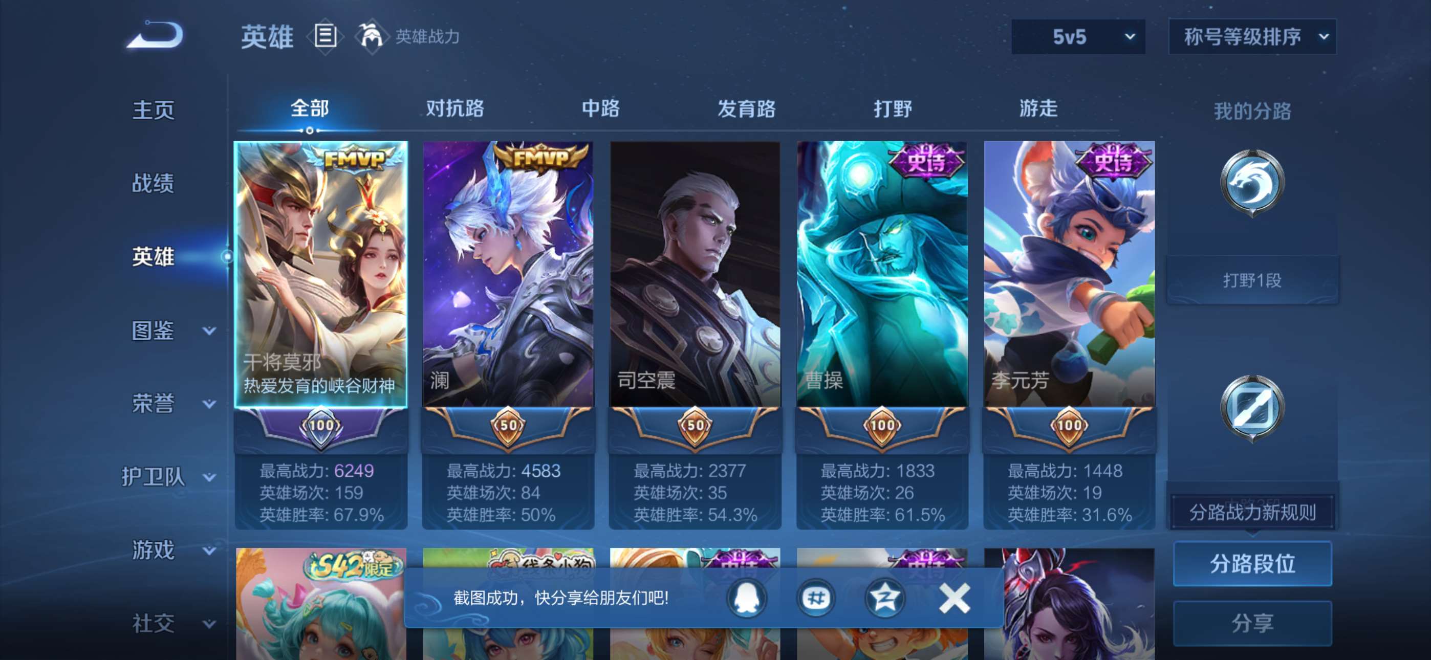 W10022【安卓区V8】可二次实名,英雄104,皮肤161,典藏:李白鸣剑.曳