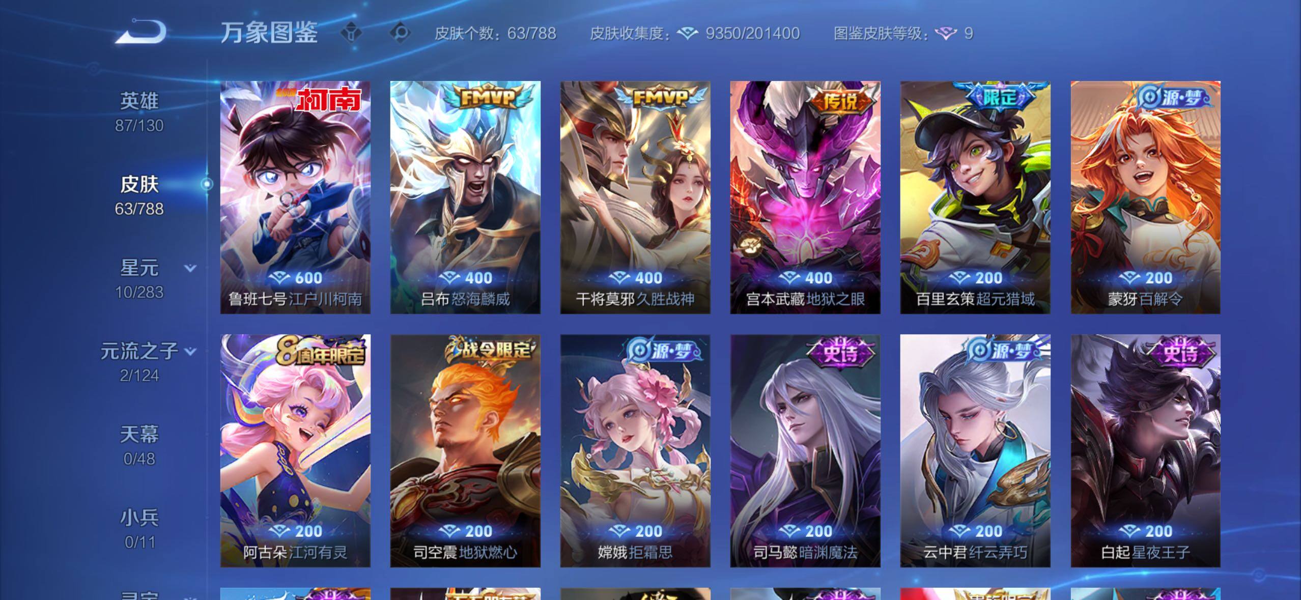 【限定皮肤】:狄仁杰阴阳师,赵云皇家上将,狄仁杰魔术师,项羽海滩派对,云中君纤云弄巧,嫦娥拒霜思,鲁班大师探海日志,艾琳流音漫舞,司空震地狱燃心,阿古朵江河有灵,张良古海寻踪,蒙犽百解令,鬼谷子天穹祈灯,百里玄策超元猎域,沈梦溪龙舞盛年,刘邦剑破天穹