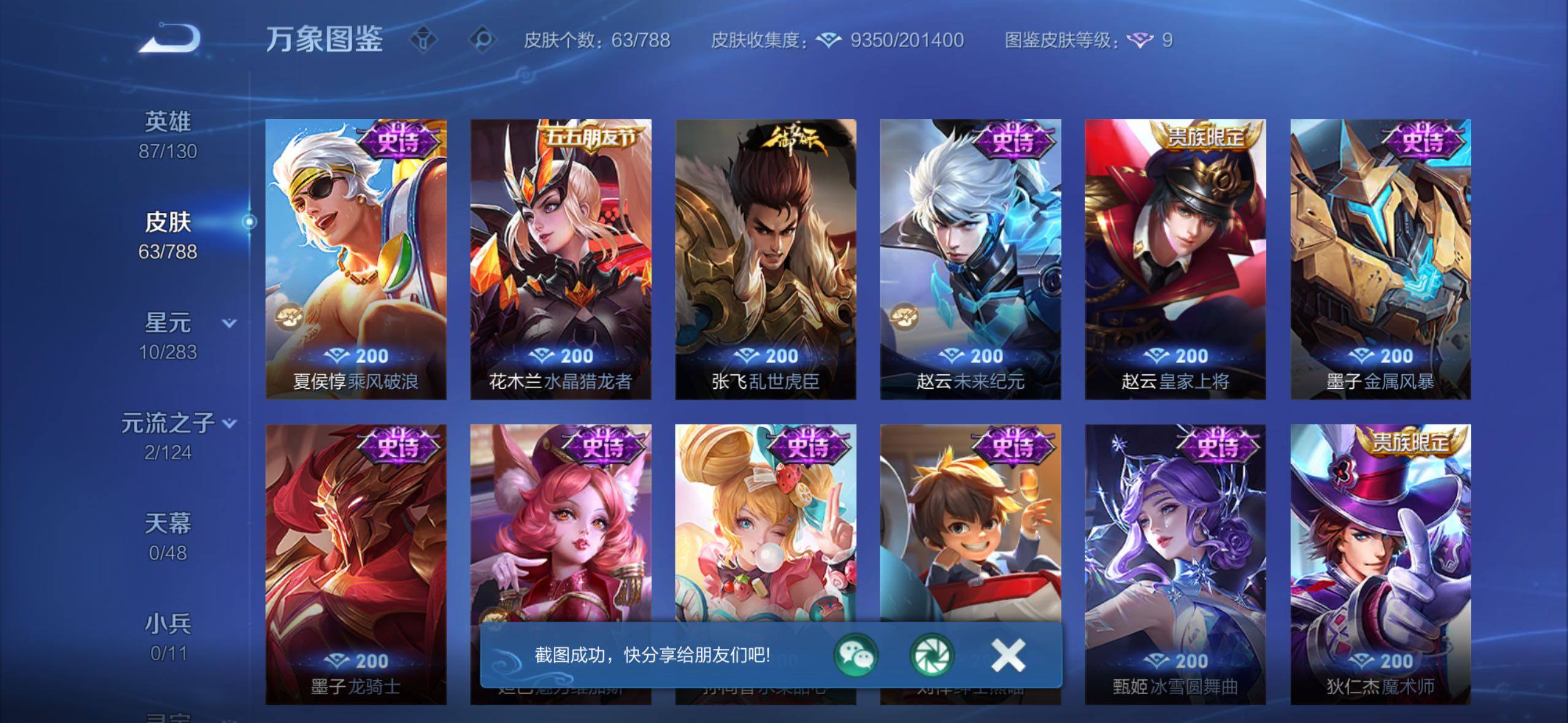 【史诗皮肤】:百里玄策超元猎域,蒙犽百解令,阿古朵江河有灵,司空震地狱燃心,嫦娥拒霜思,司马懿暗渊魔法,云中君纤云弄巧,狄仁杰鹰眼统帅,白起星夜王子,夏侯惇乘风破浪,花木兰水晶猎龙者,张飞乱世虎臣,刘禅绅士熊喵,墨子金属风暴,墨子龙骑士,妲己魅力维加斯,孙尚香水果甜心,狄仁杰魔术师,甄姬冰雪圆舞曲,赵云未来纪元,赵云皇家上将,露娜紫霞仙子